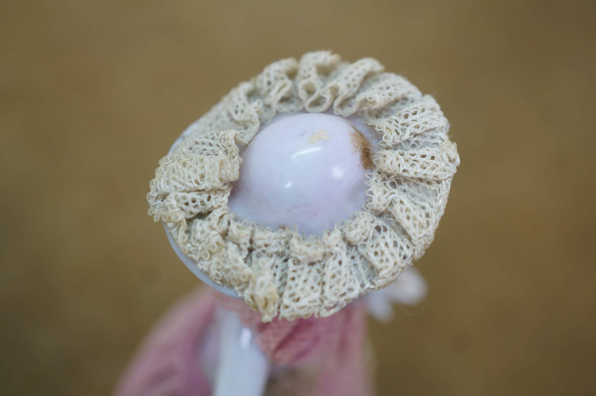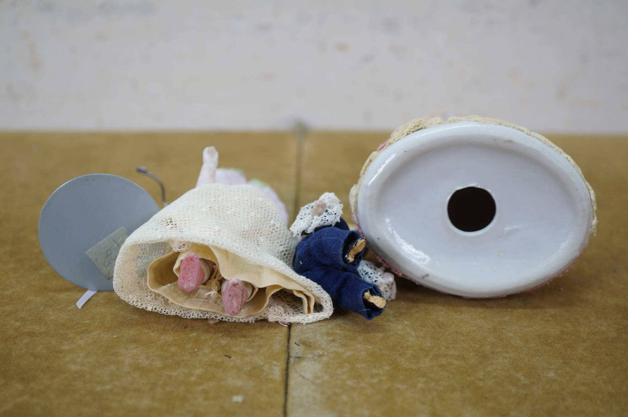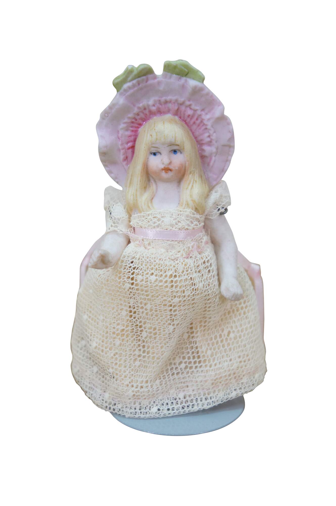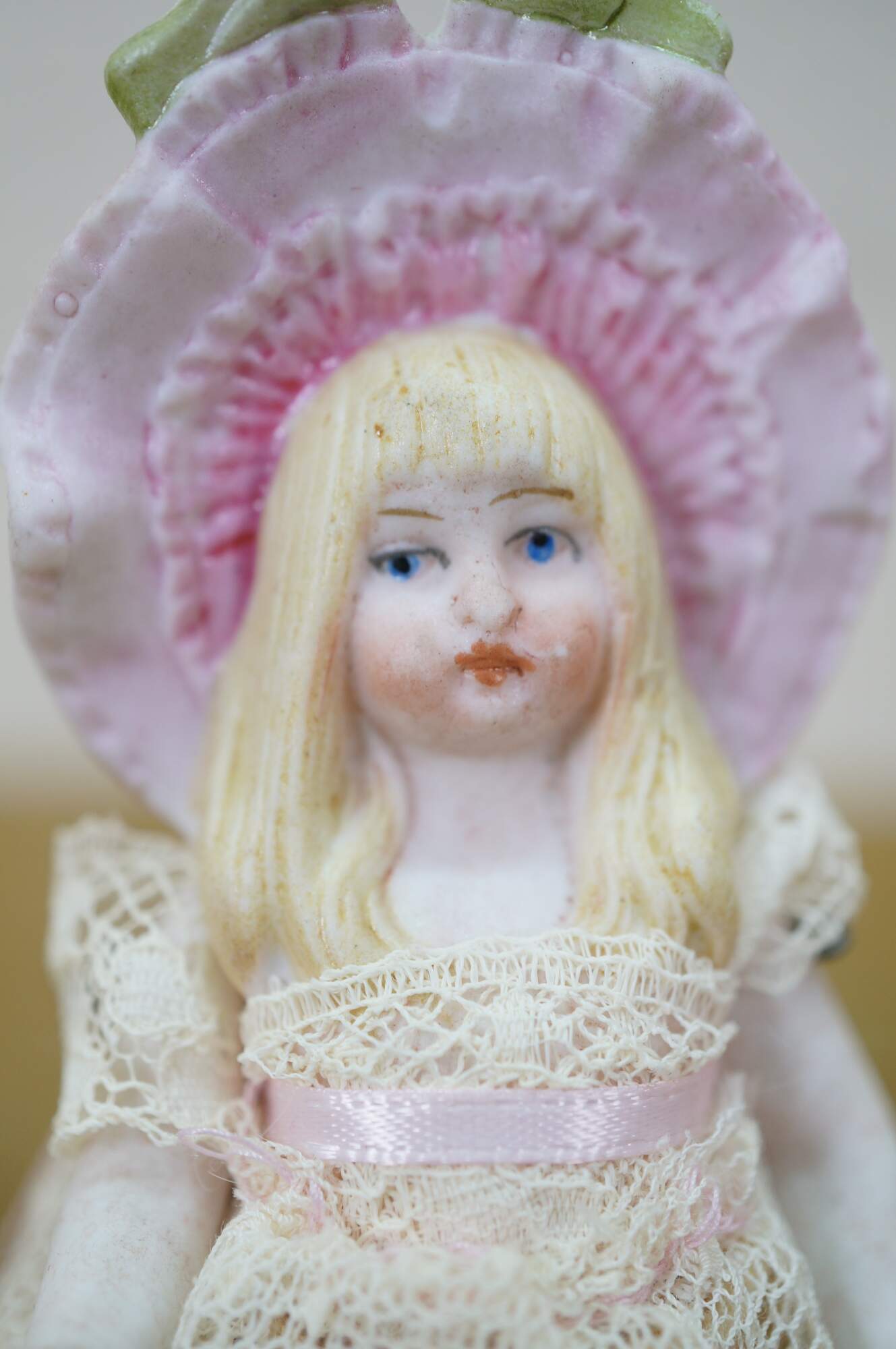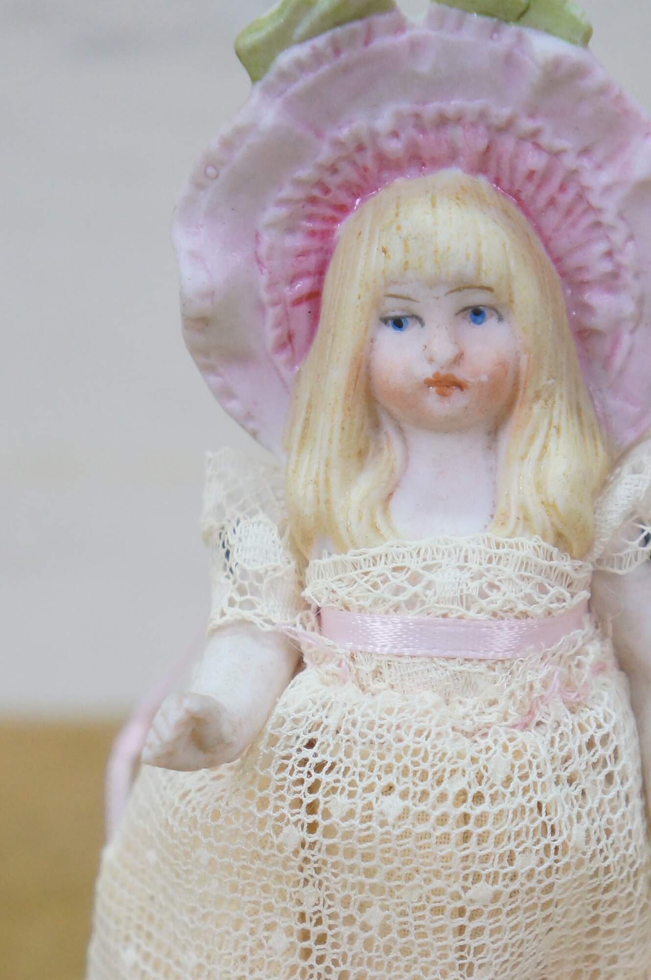 wear; discoloration; pink lady missing hand/repair to arm