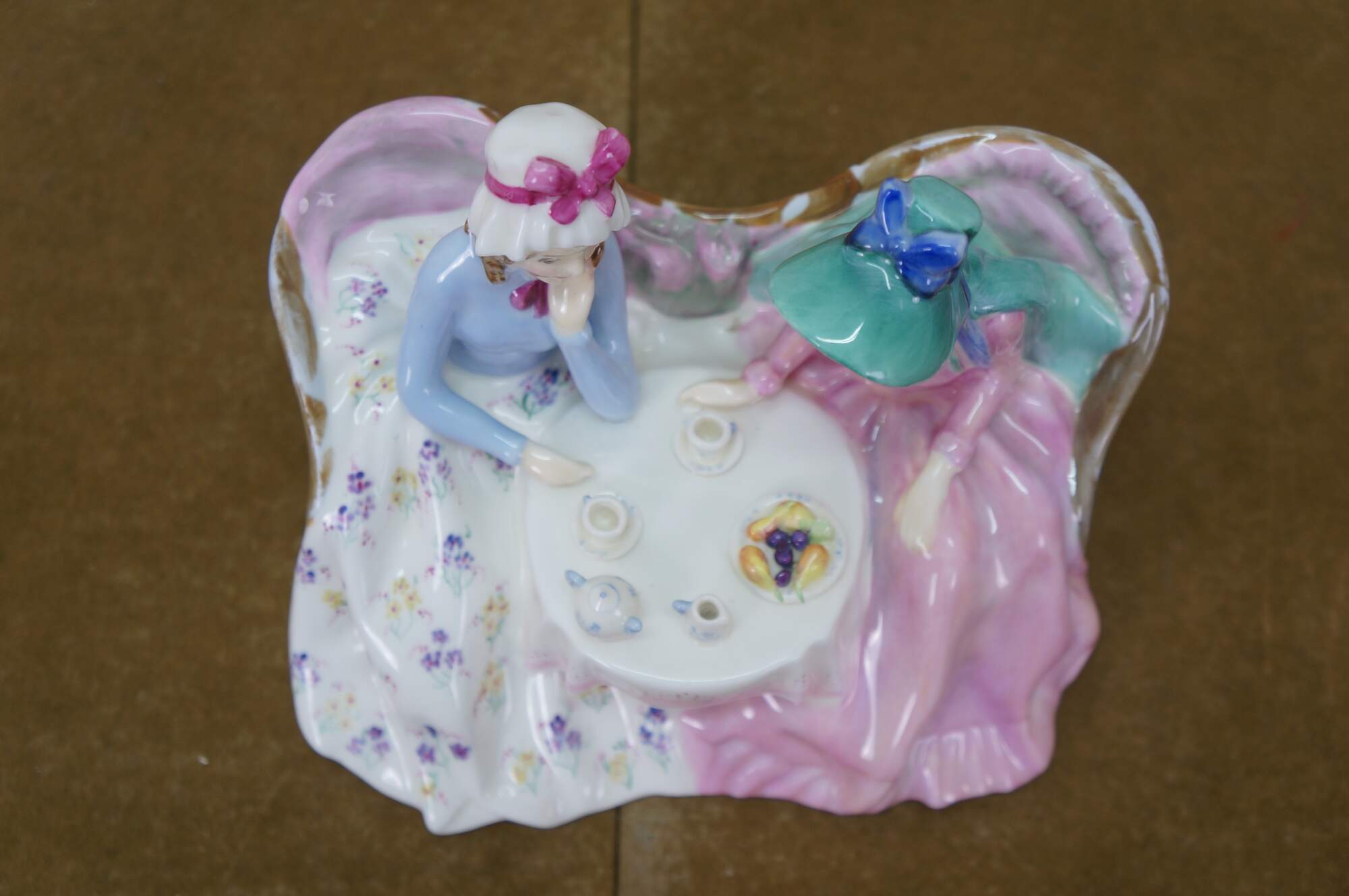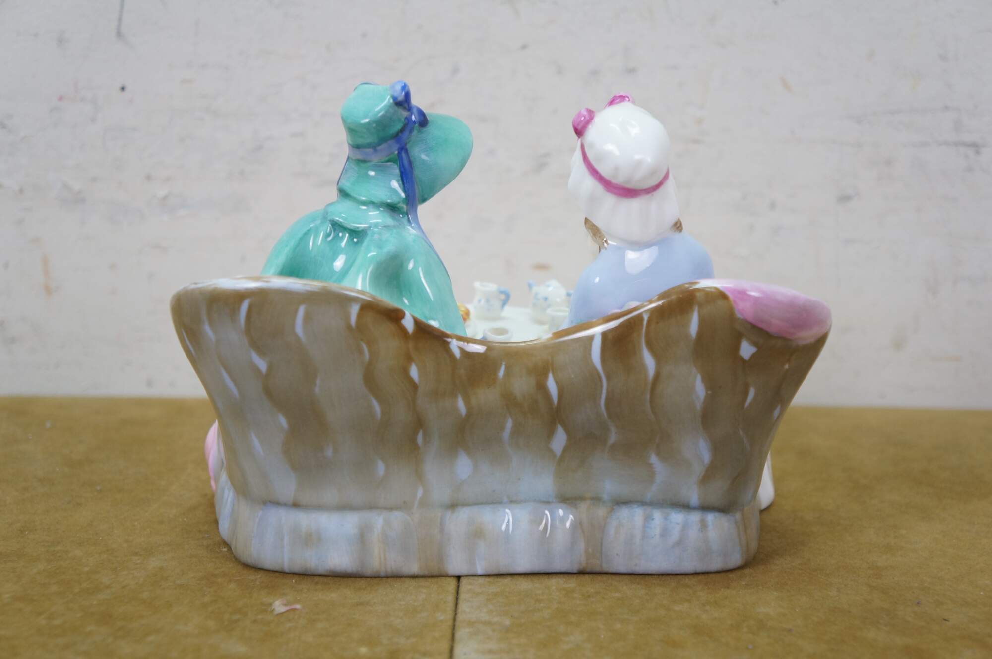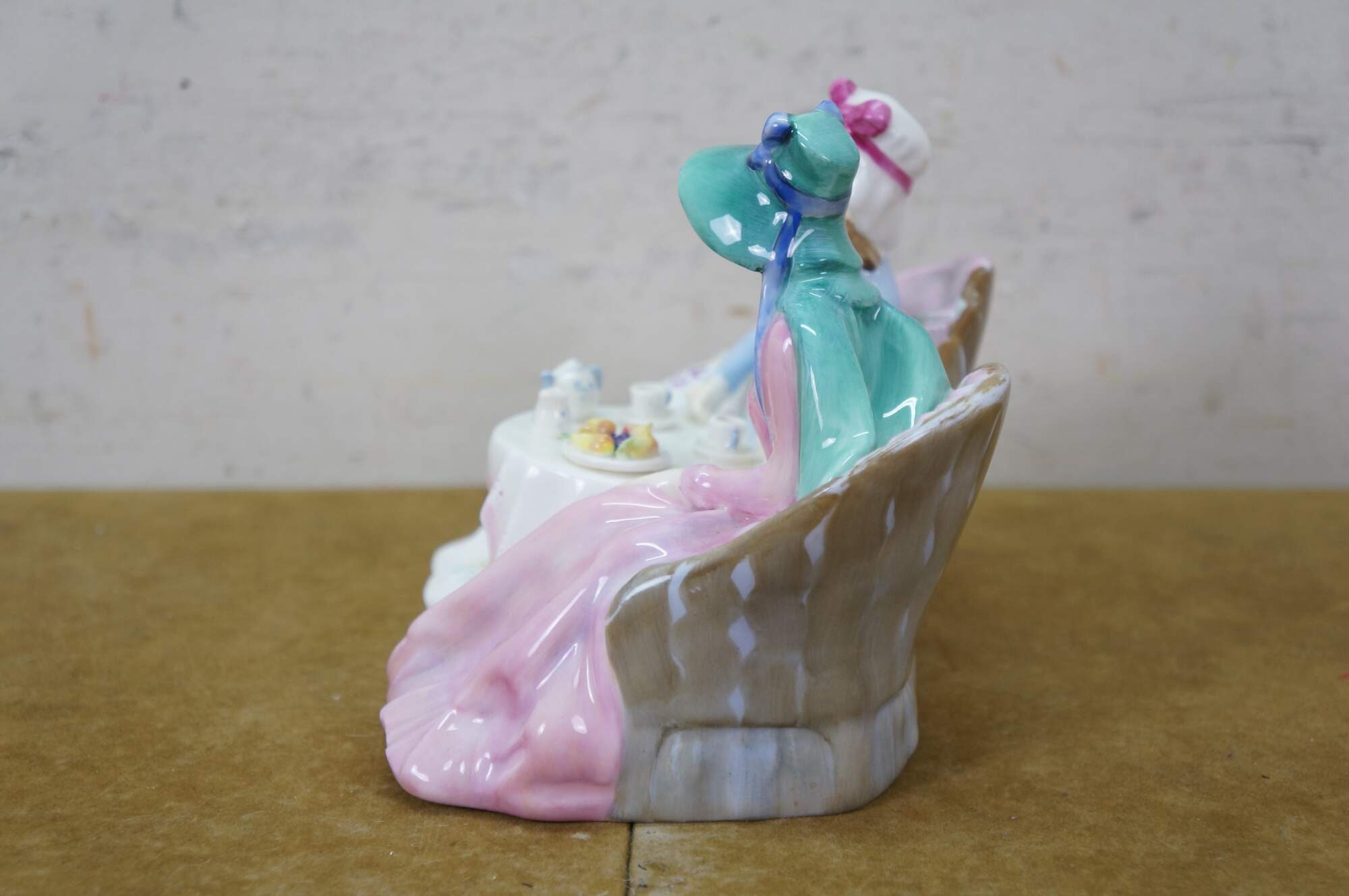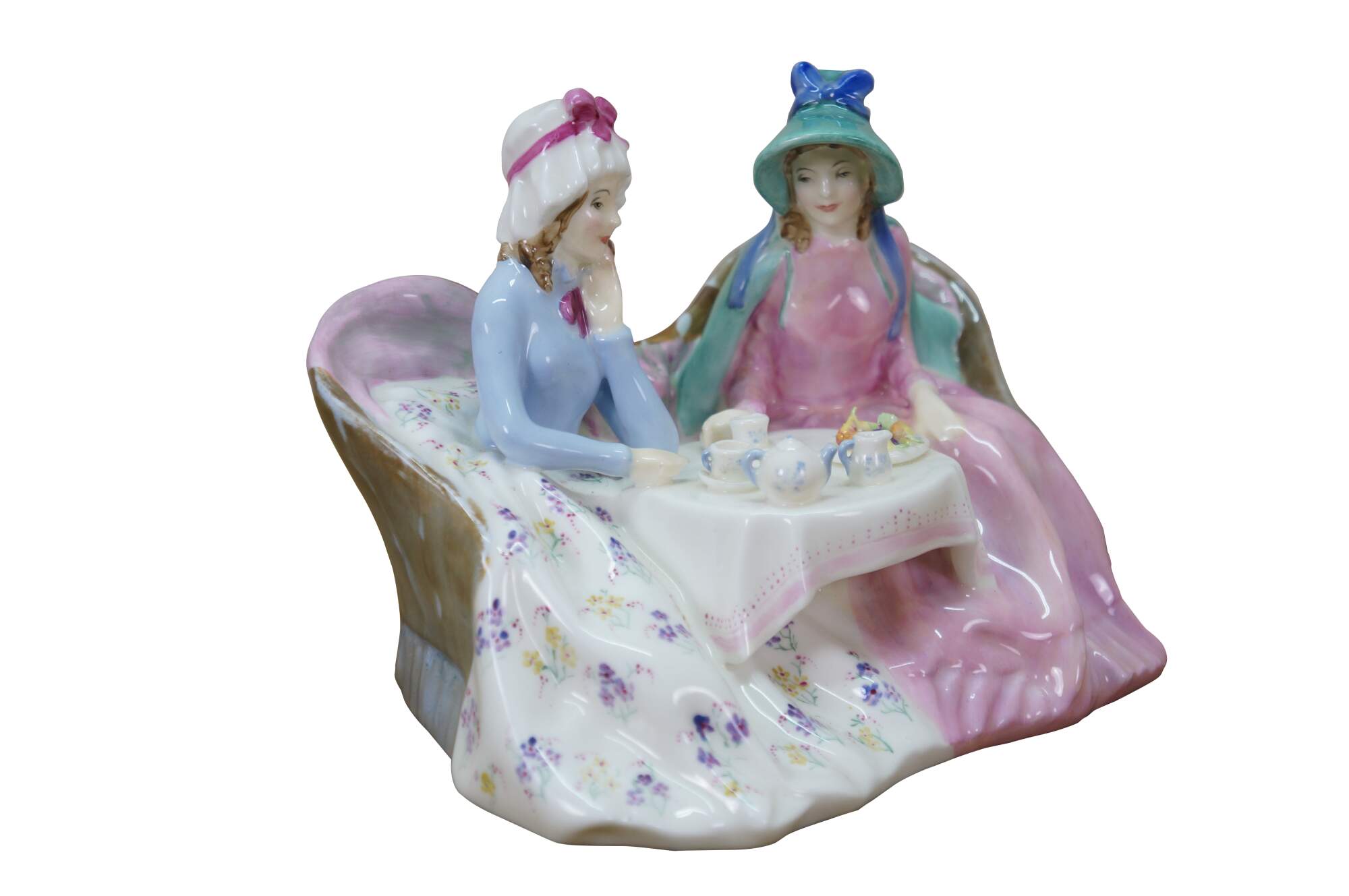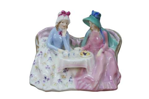 Vintage Royal Doulton Afternoon Tea HN 1747 figurine designed by Peggy Railston. The figurine was issued from 1936 to 1982 and depicts two ladies in 19th-century clothing seated on a sofa, sharing tea and cakes.