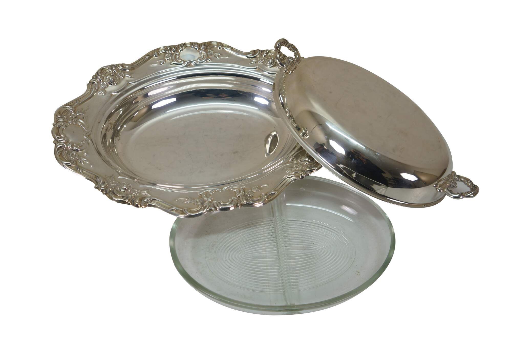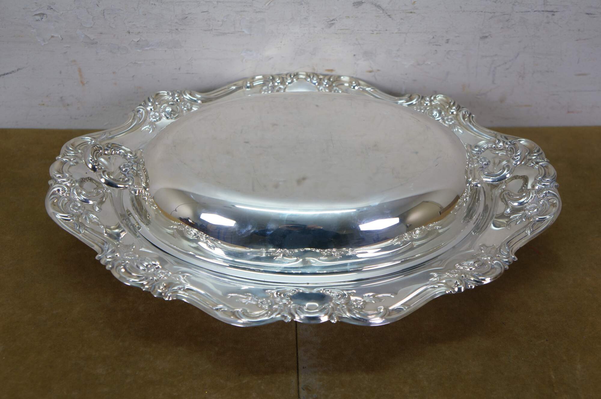 Three vintage lidded, footed silver plate tureens or casserole dishes. One Reed & Barton Burgundy scalloped floral acanthus platter with pyrex insert; one 4pc antique Eureka 2607 quadruple silver plate lidded / handled / footed tureen with enamelware insert and dish guard; and one 3pc Towle 4066 scalloped oval tureen with divided dish insert.