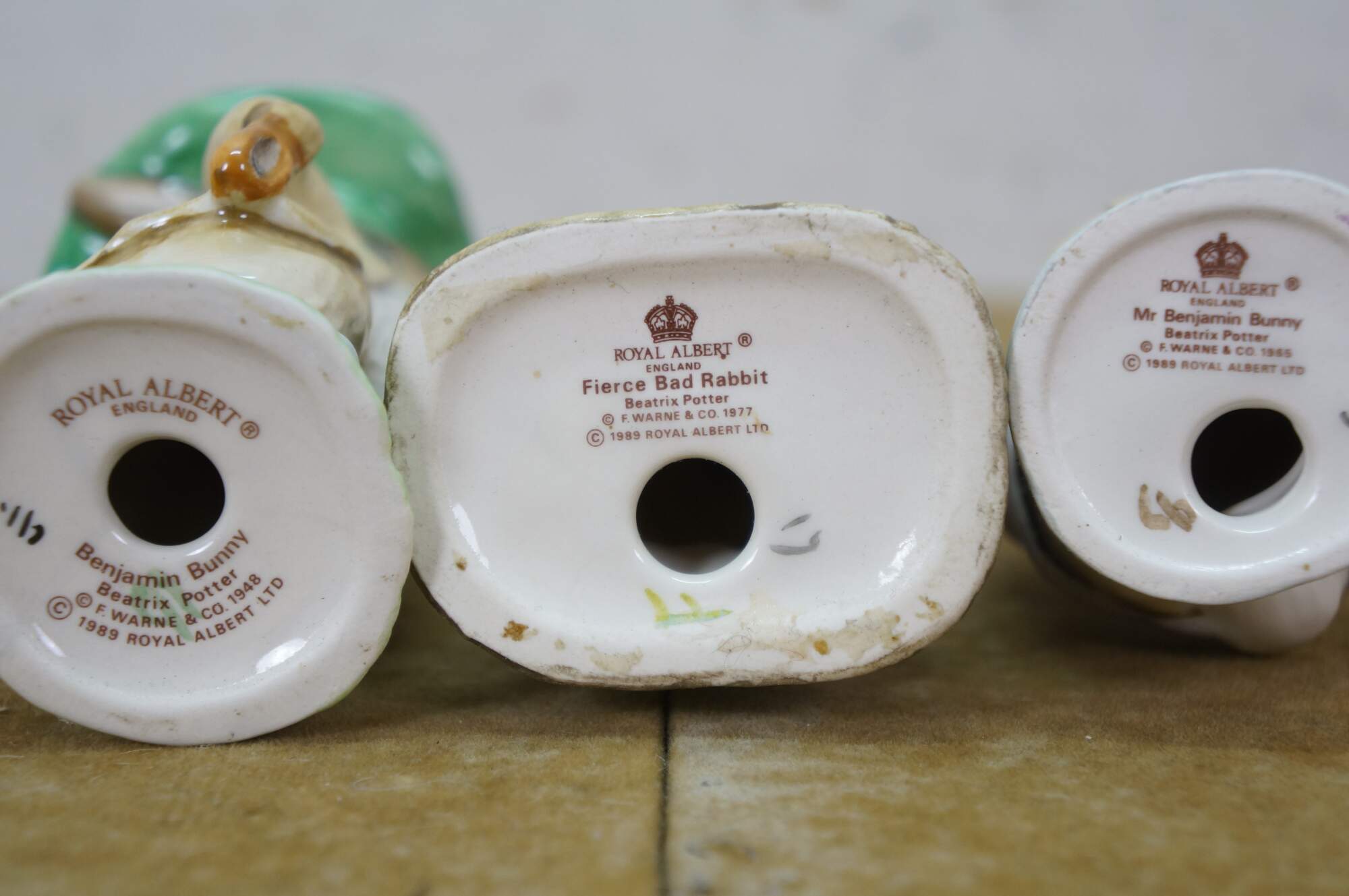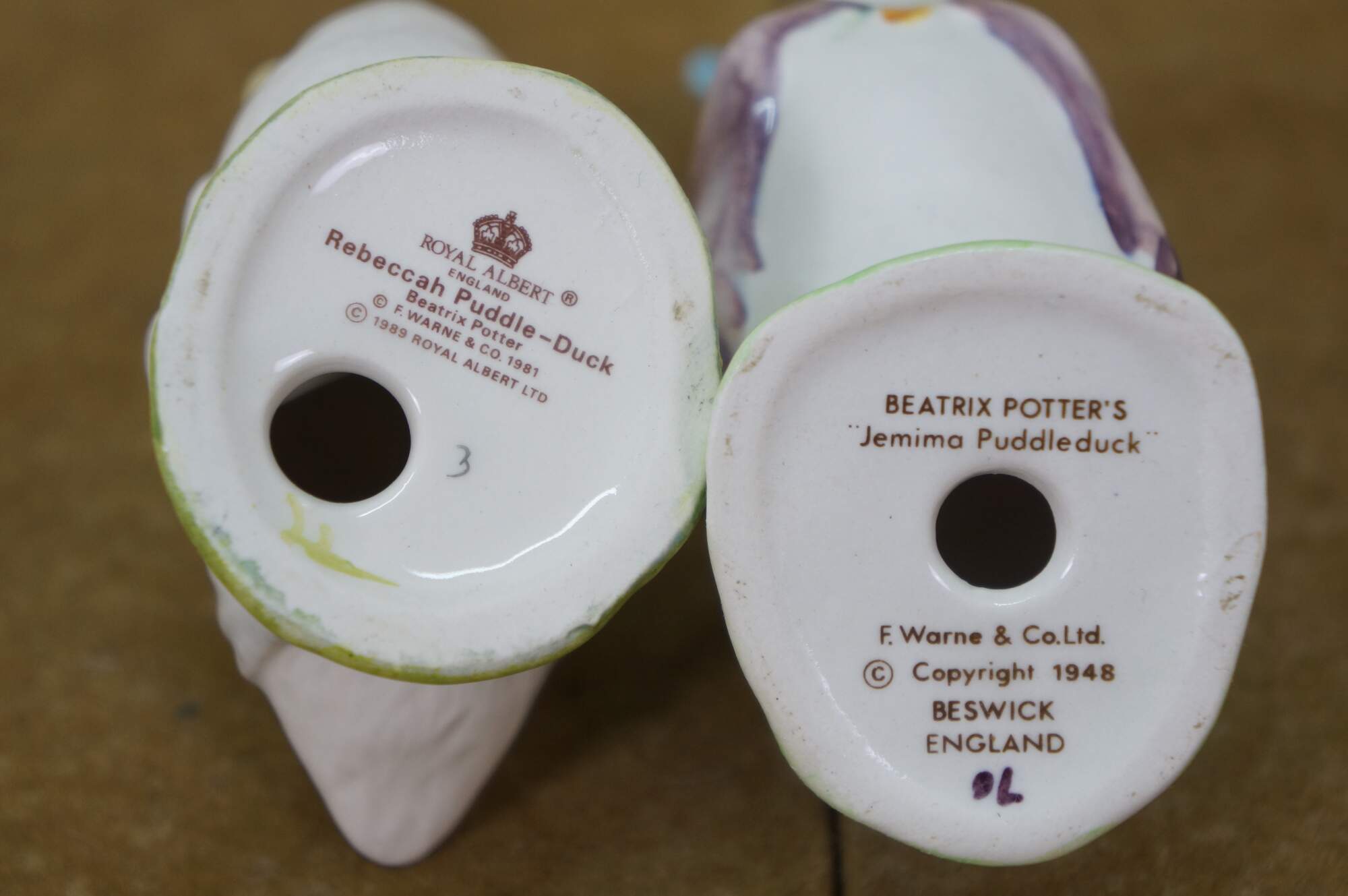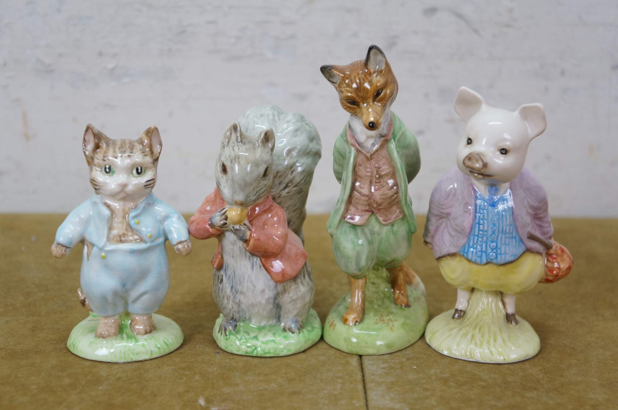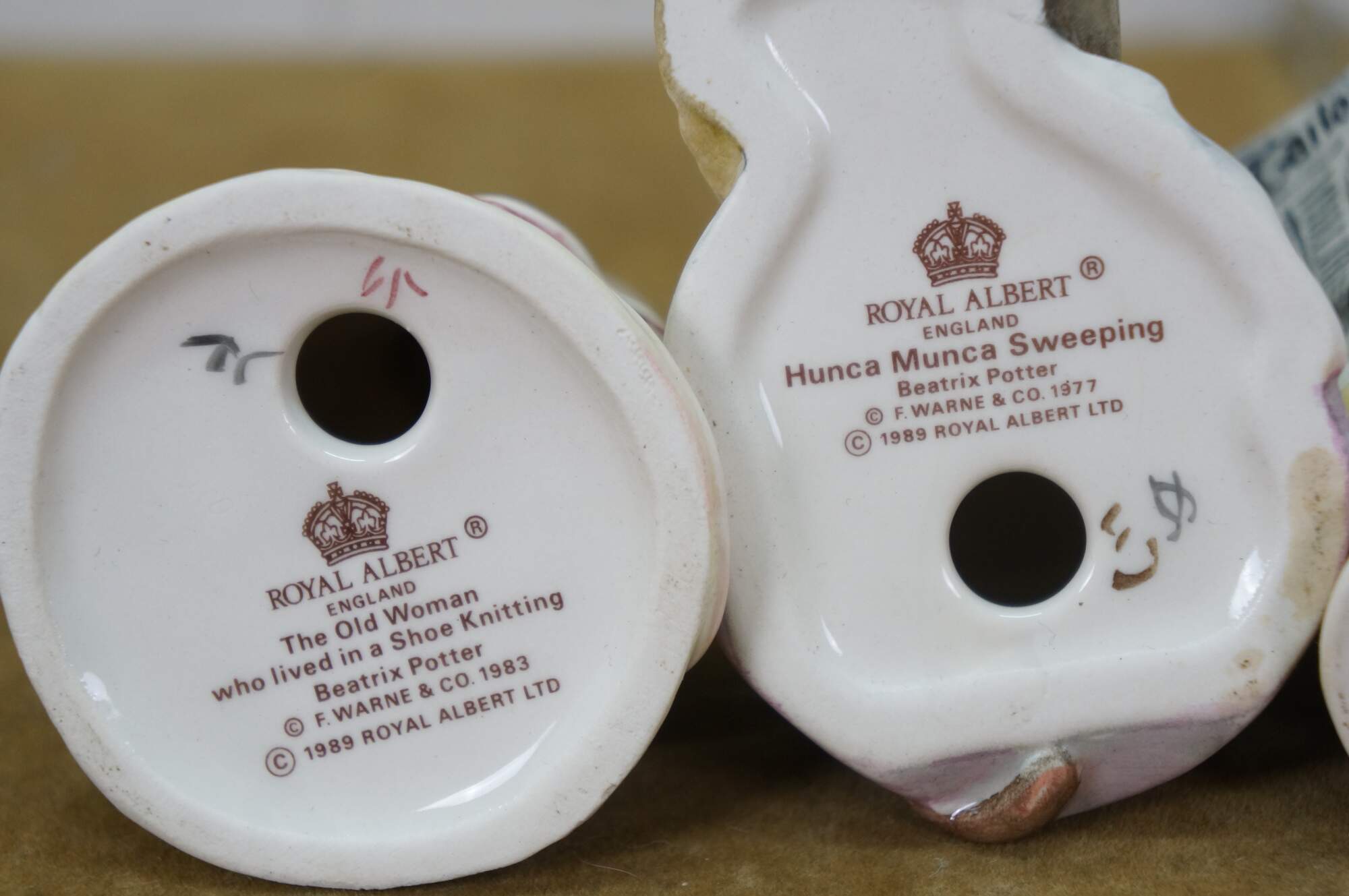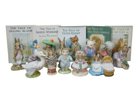 Collection of 13 Royal Albert Beatrix Potter figurines, accompanied by 5 of the author's classic children's books.