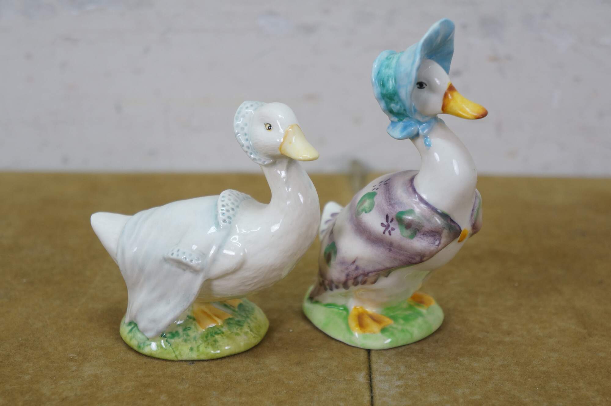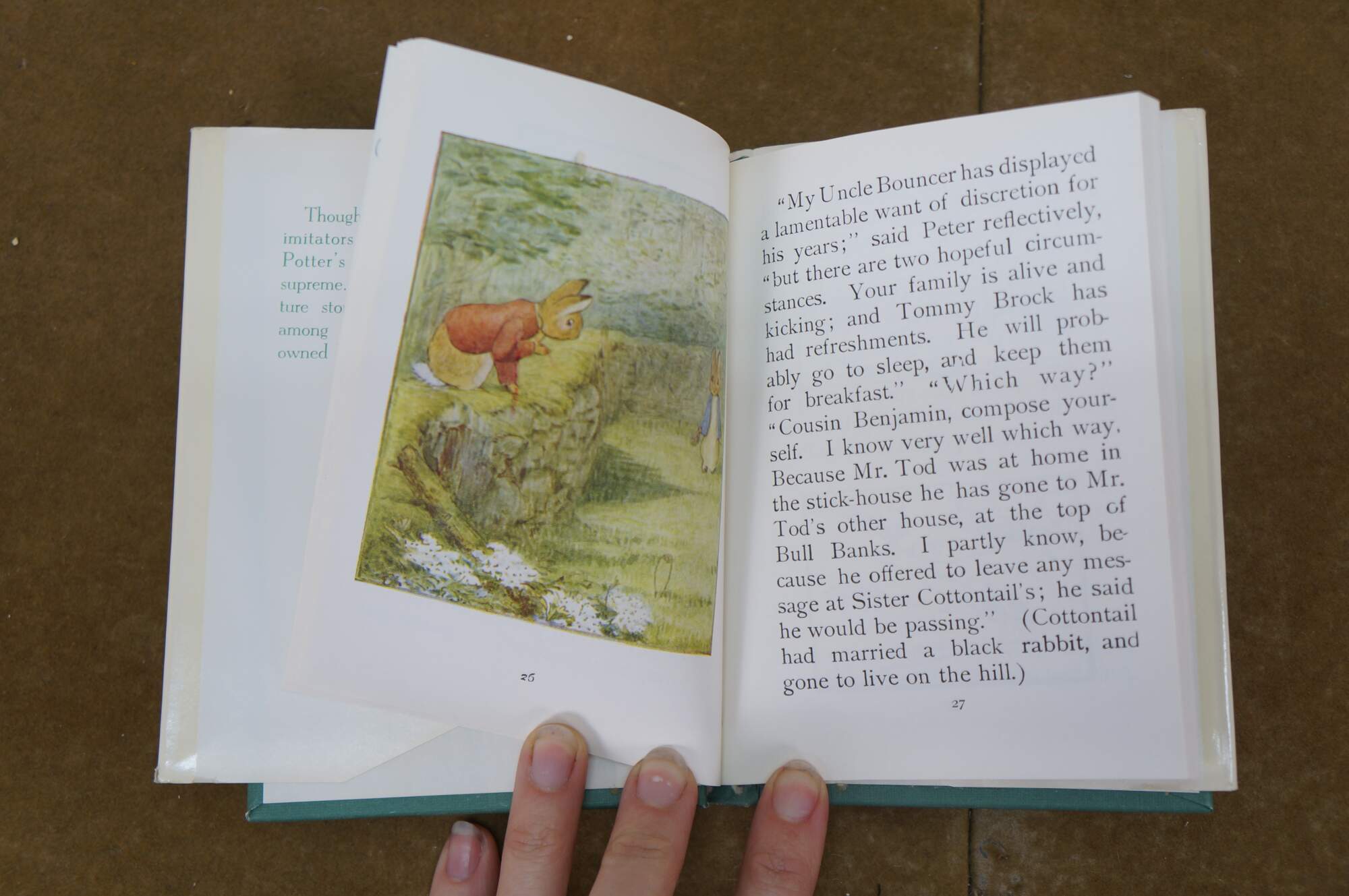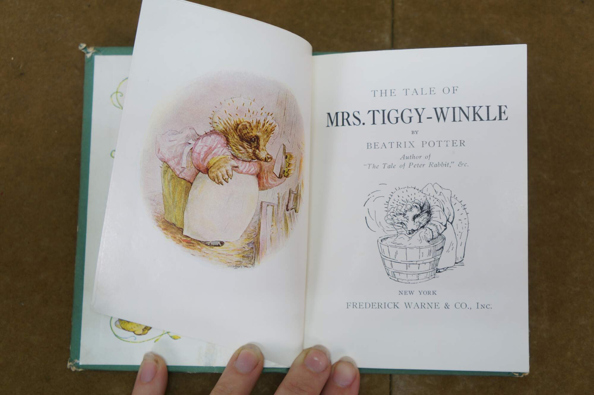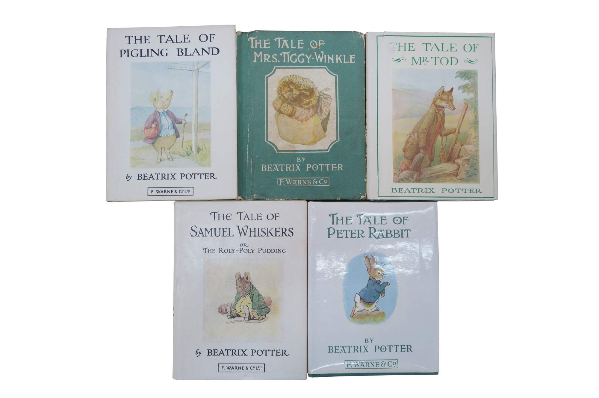 Collection of 13 Royal Albert Beatrix Potter figurines, accompanied by 5 of the author's classic children's books.