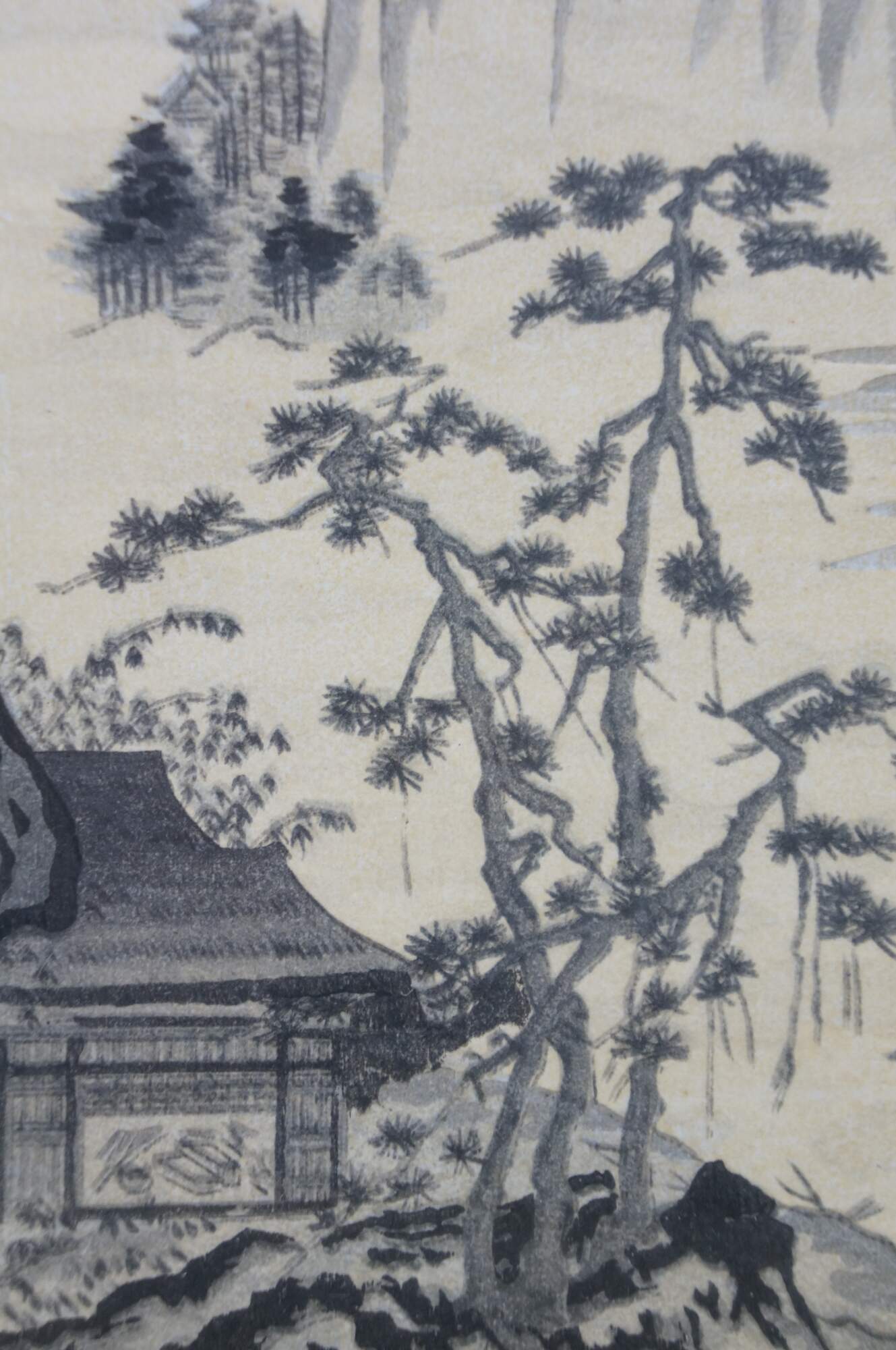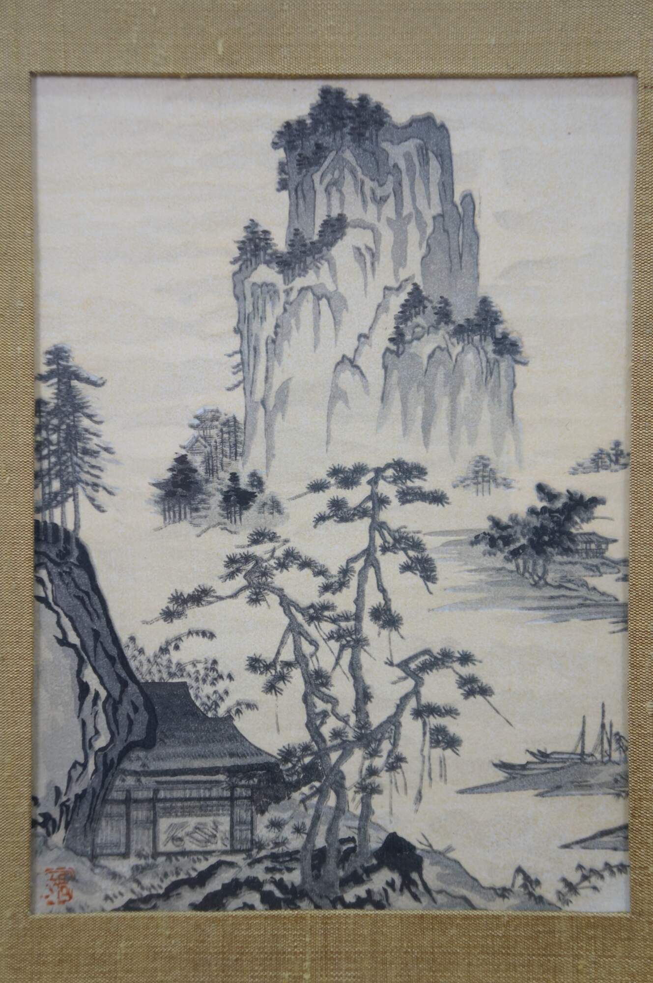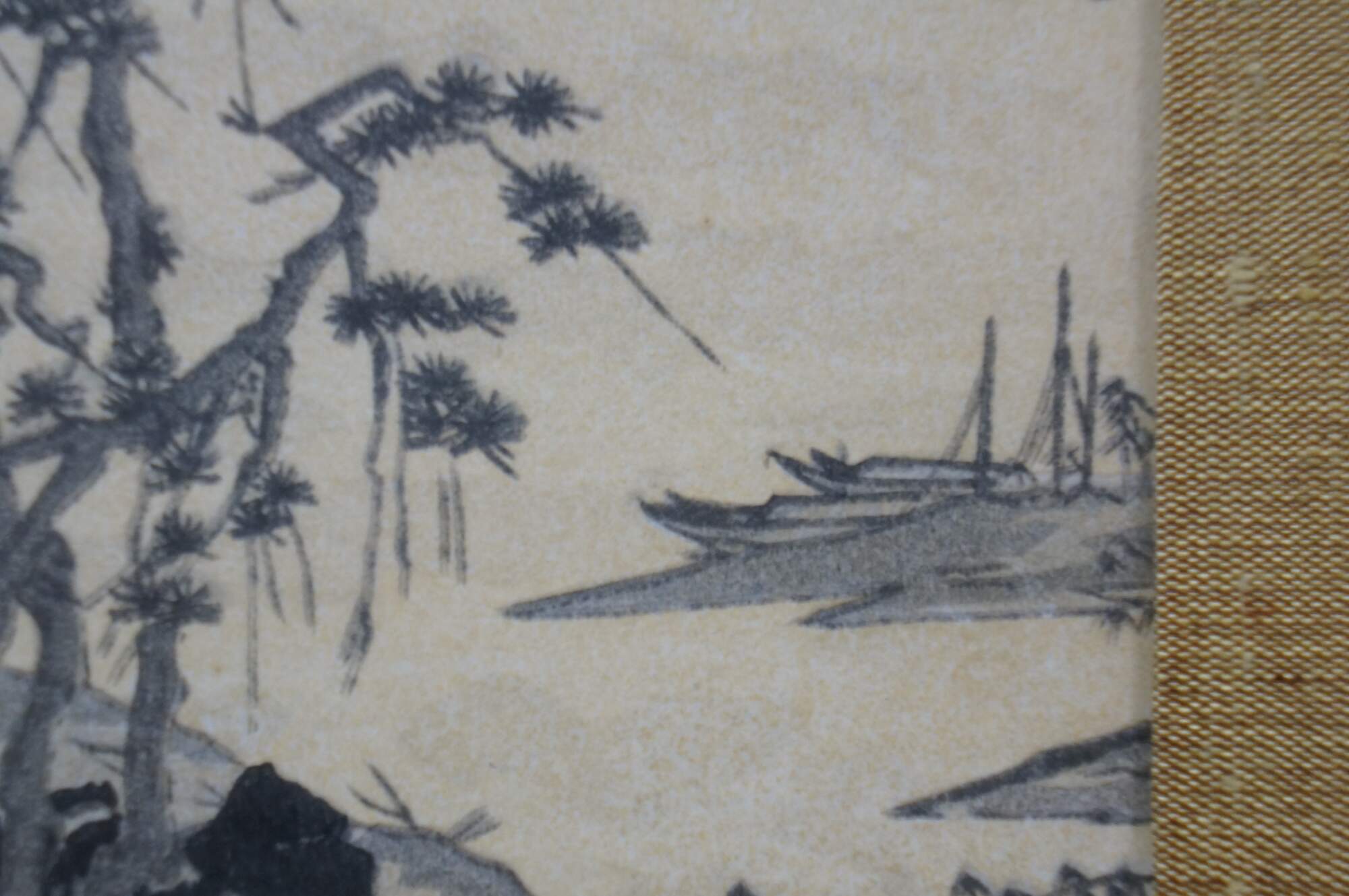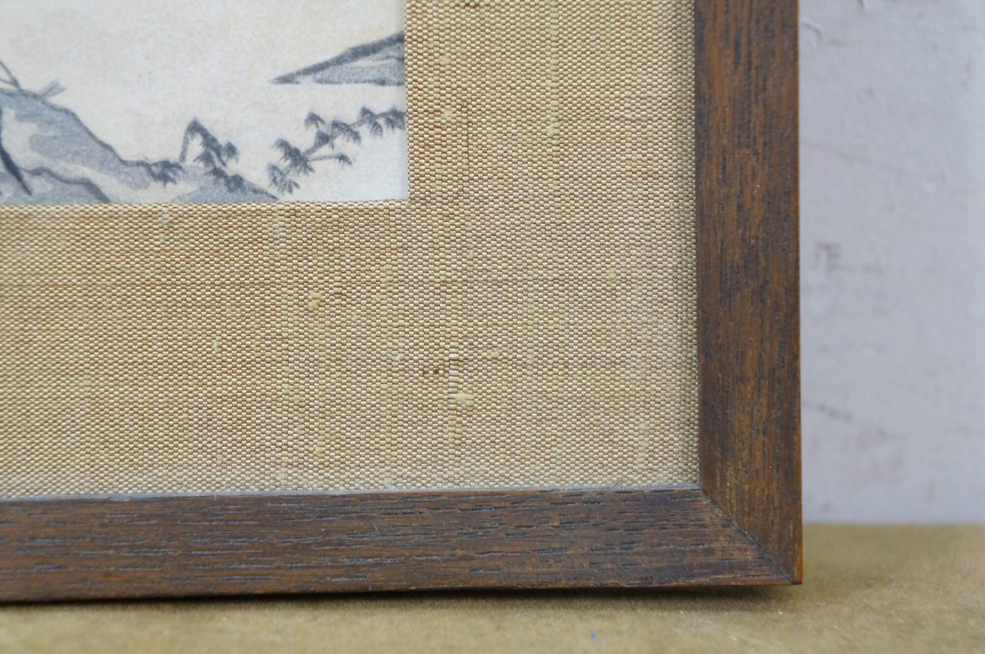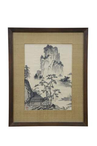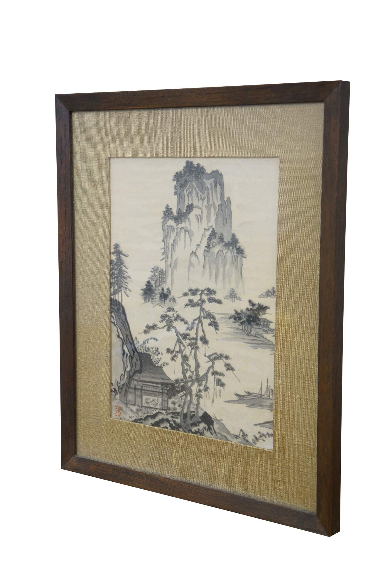 Vintage ink wash / Sumi-e / Shuǐ mò painting after the original by Tenshō Shūbun. The painting depicts a secluded misty mountain landscape with gnarled pine trees, pagodas and fishing boats. This is a common theme in Chinese scholar-paintings that symbolizes an ideal place for peaceful retreats. This style emphasizes minimalist brush strokes and black ink on paper or silk to evoke lyrical tranquility and a connection with nature. Framed in Bangkok.