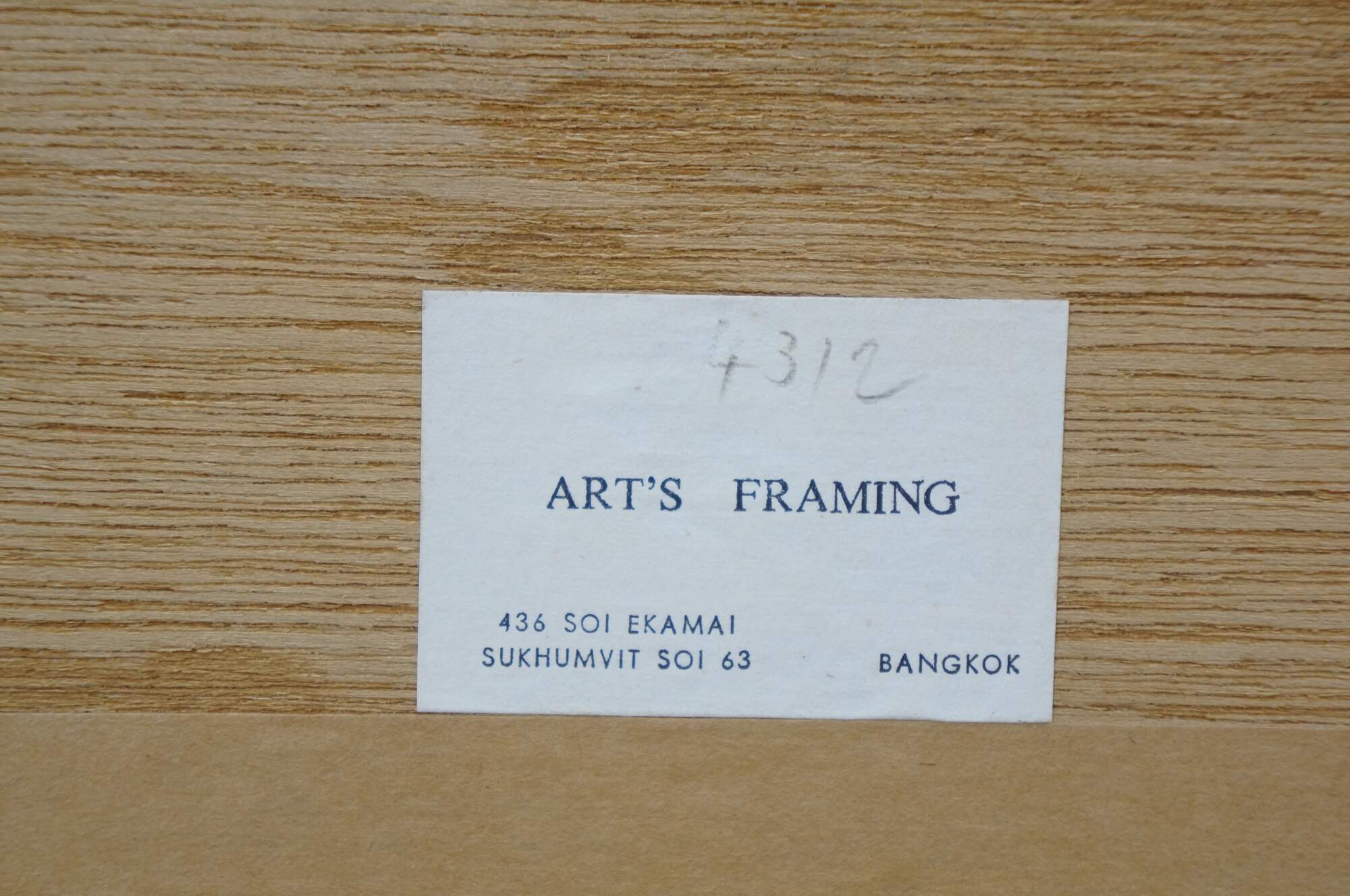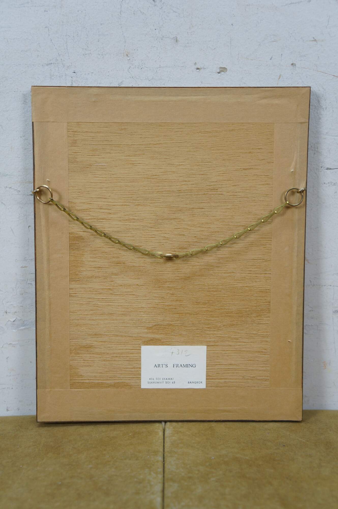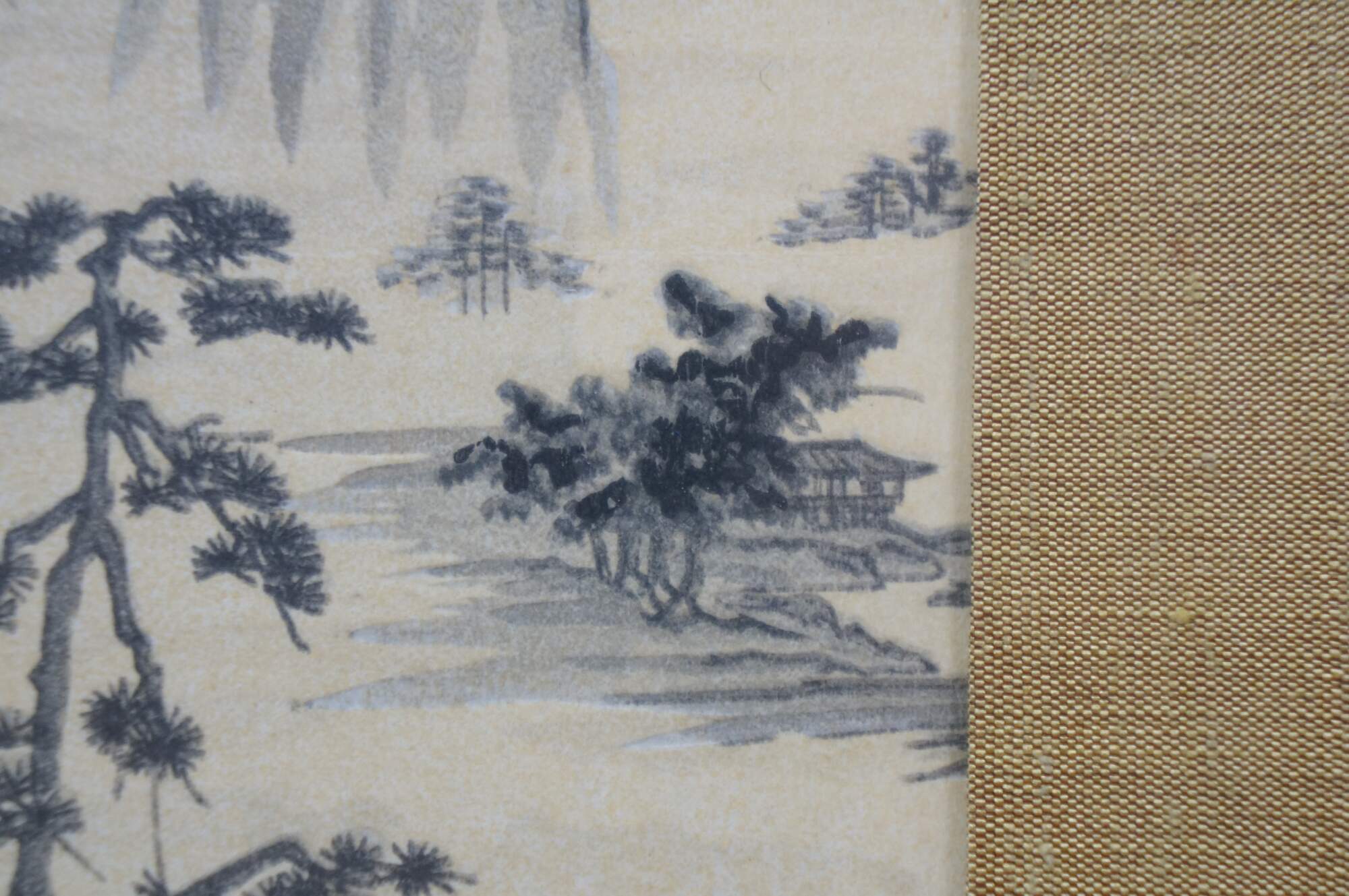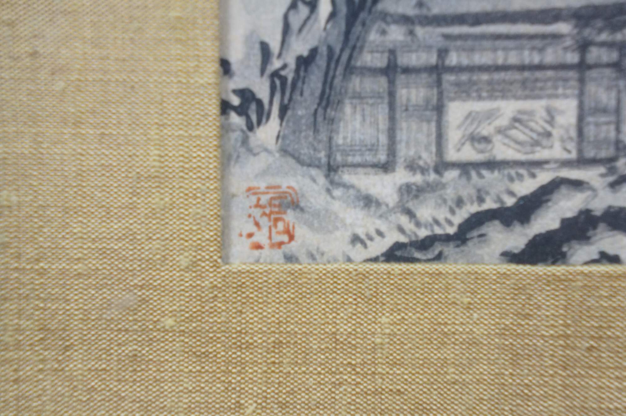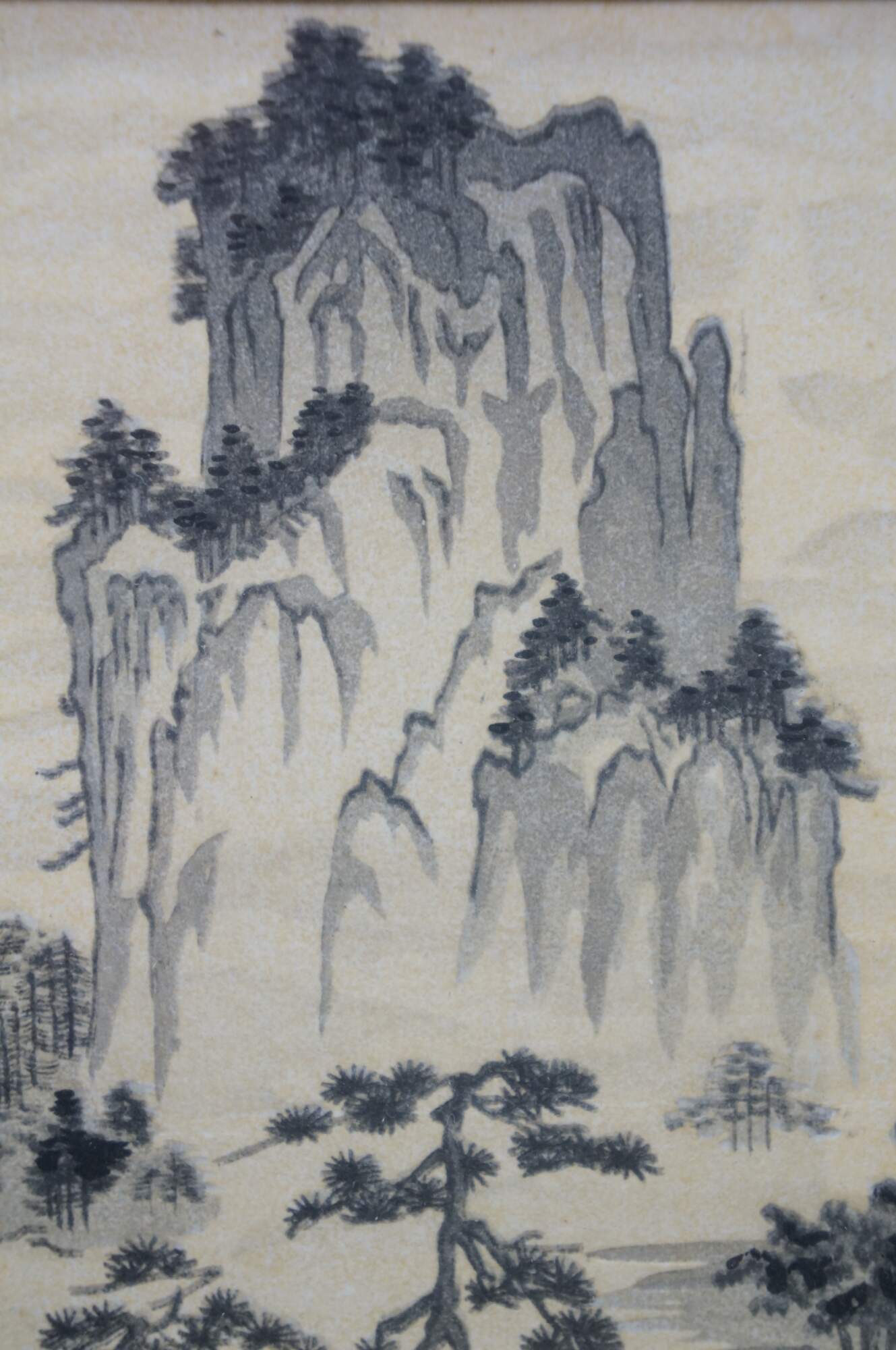 Vintage ink wash / Sumi-e / Shuǐ mò painting after the original by Tenshō Shūbun. The painting depicts a secluded misty mountain landscape with gnarled pine trees, pagodas and fishing boats. This is a common theme in Chinese scholar-paintings that symbolizes an ideal place for peaceful retreats. This style emphasizes minimalist brush strokes and black ink on paper or silk to evoke lyrical tranquility and a connection with nature. Framed in Bangkok.