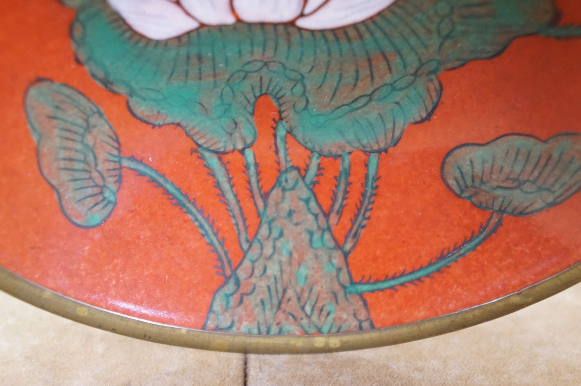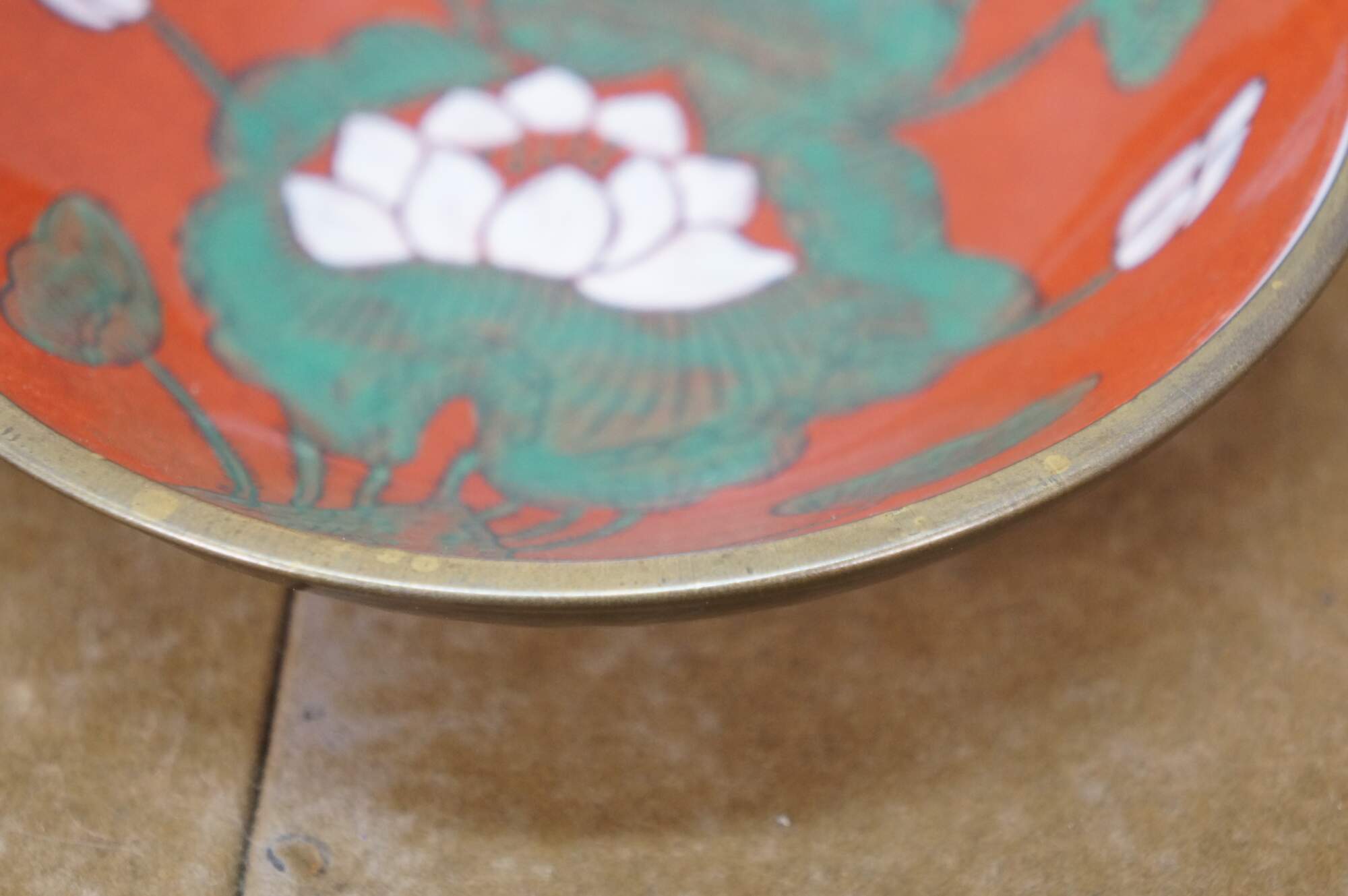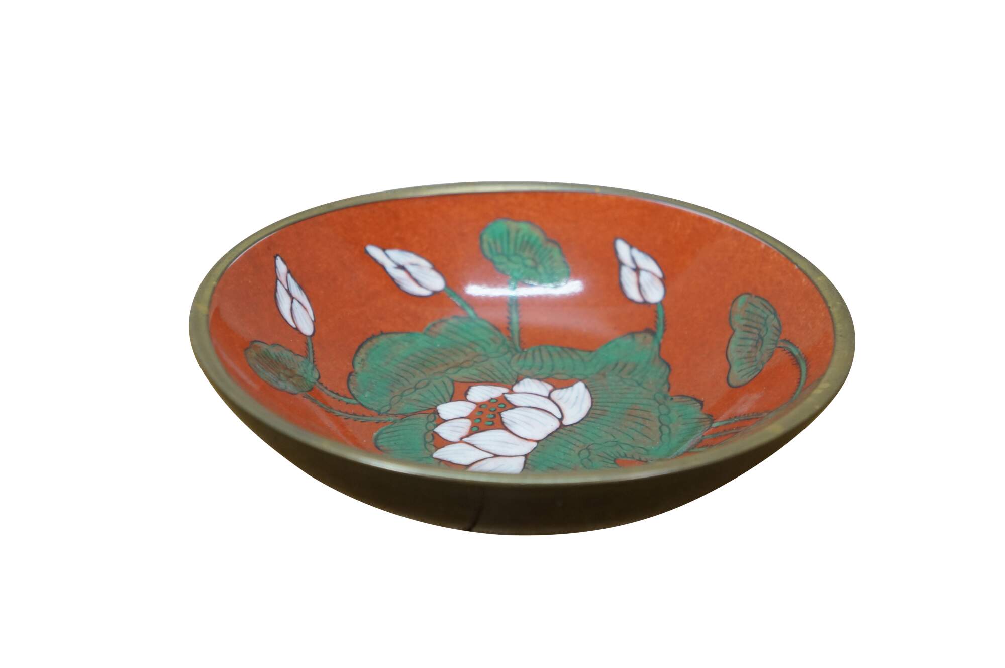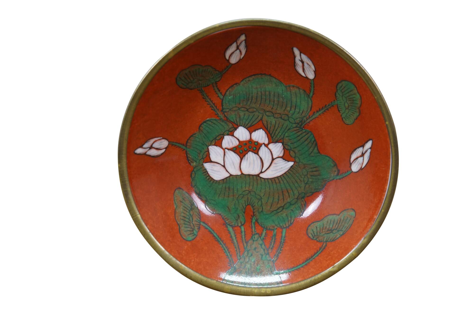 Vintage Overjoy porcelain and brass compote bowl, hand-painted with a lotus flower design. Hong Kong.