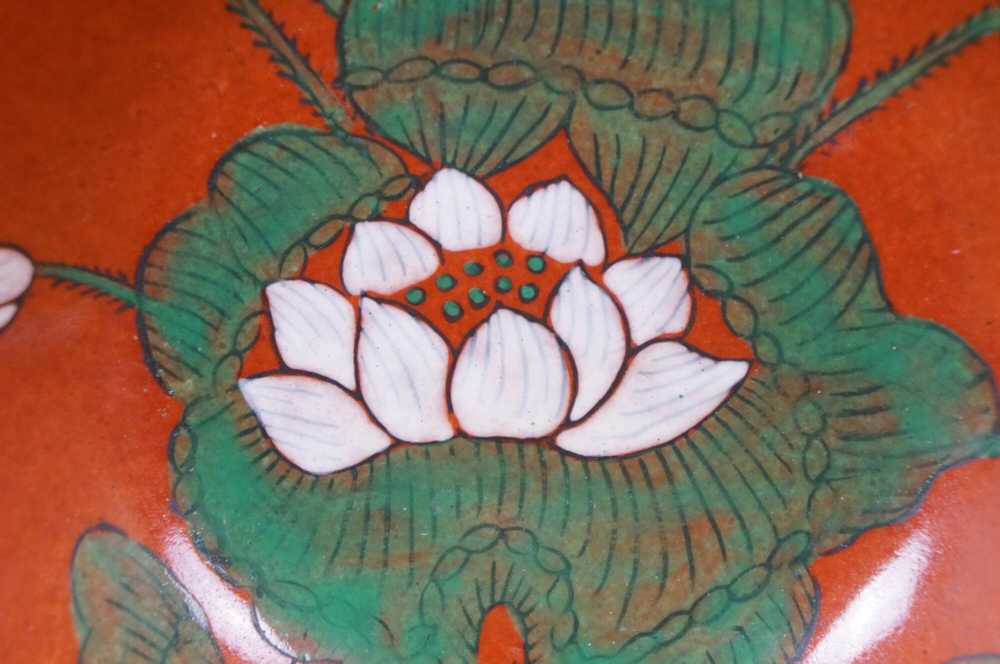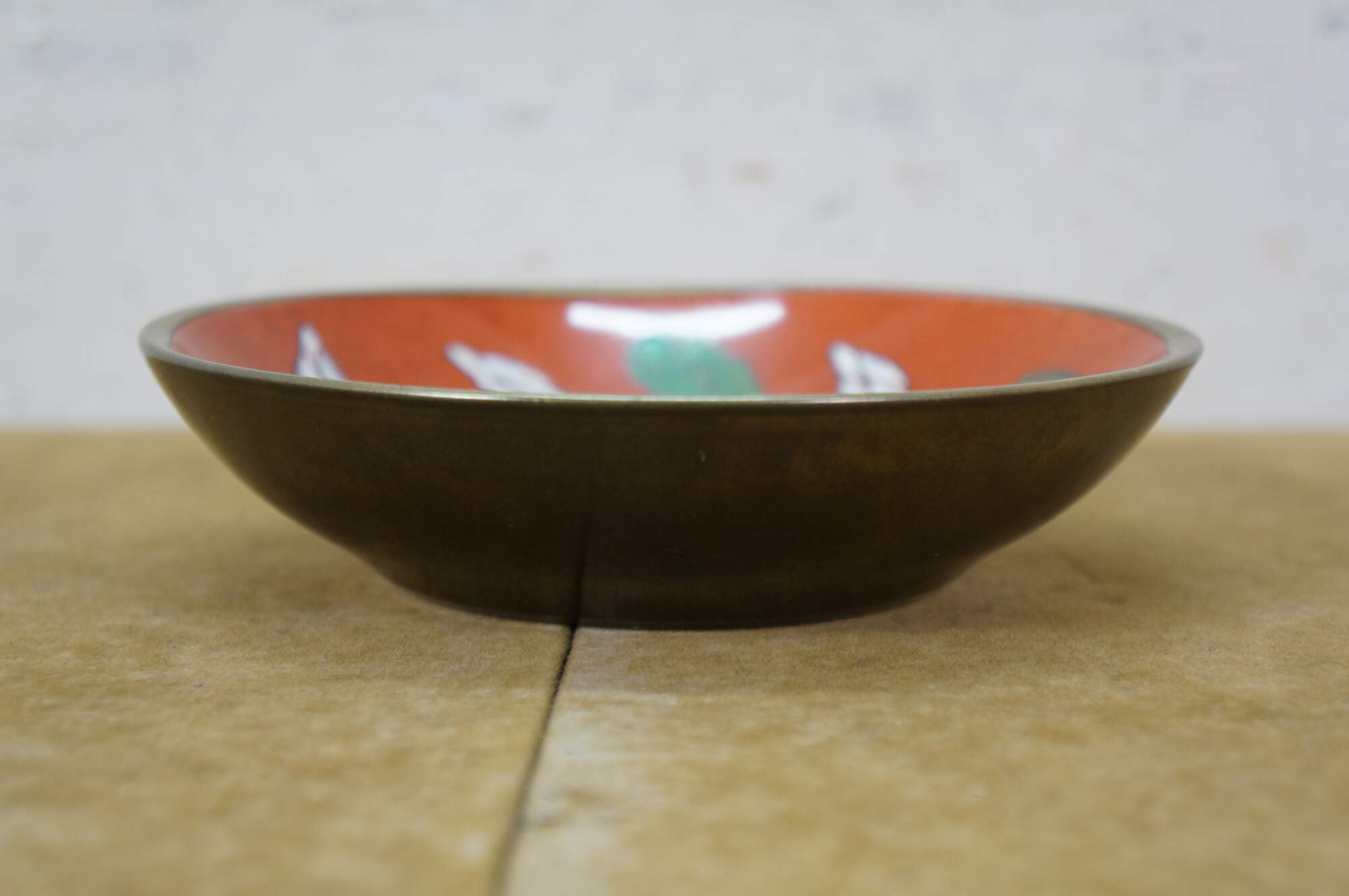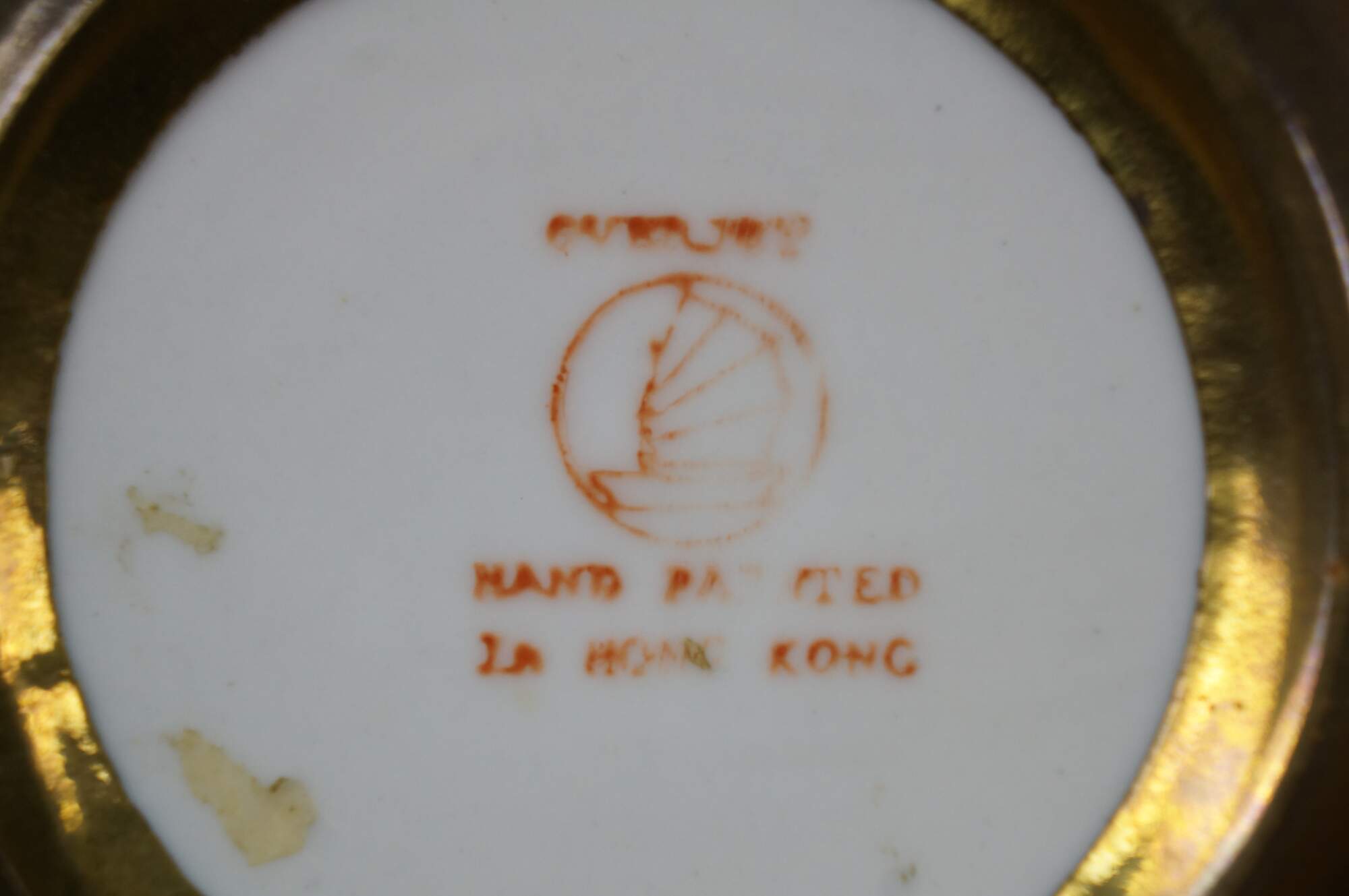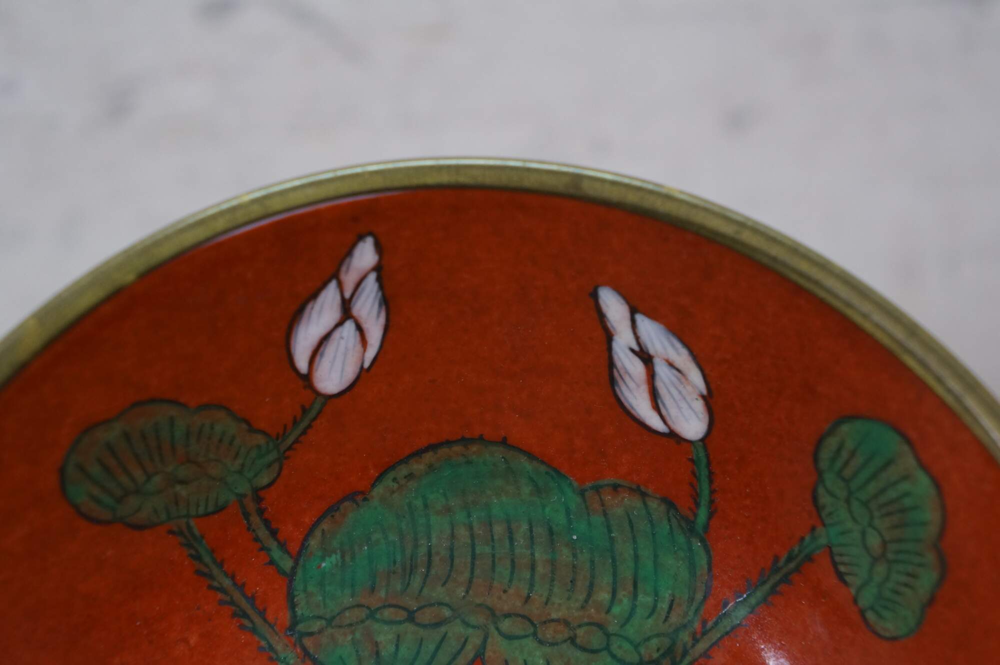 Vintage Overjoy porcelain and brass compote bowl, hand-painted with a lotus flower design. Hong Kong.