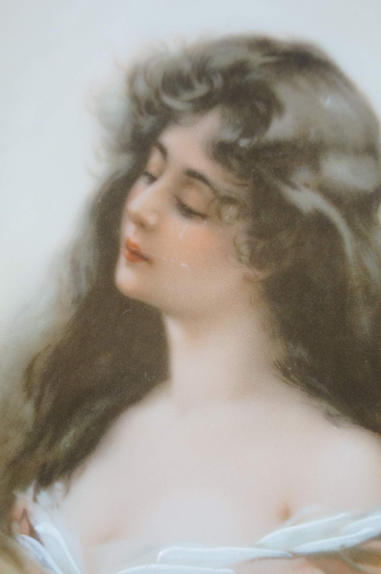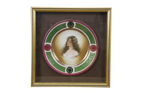 Antique Austrian Royal Vienna hand-painted porcelain portrait plate framed in a gilt shadowbox curio display frame. Features a central portrait of a woman named Constance, surrounded by a red and green border with Neoclassical / Art Nouveau gilt gold floral motifs.