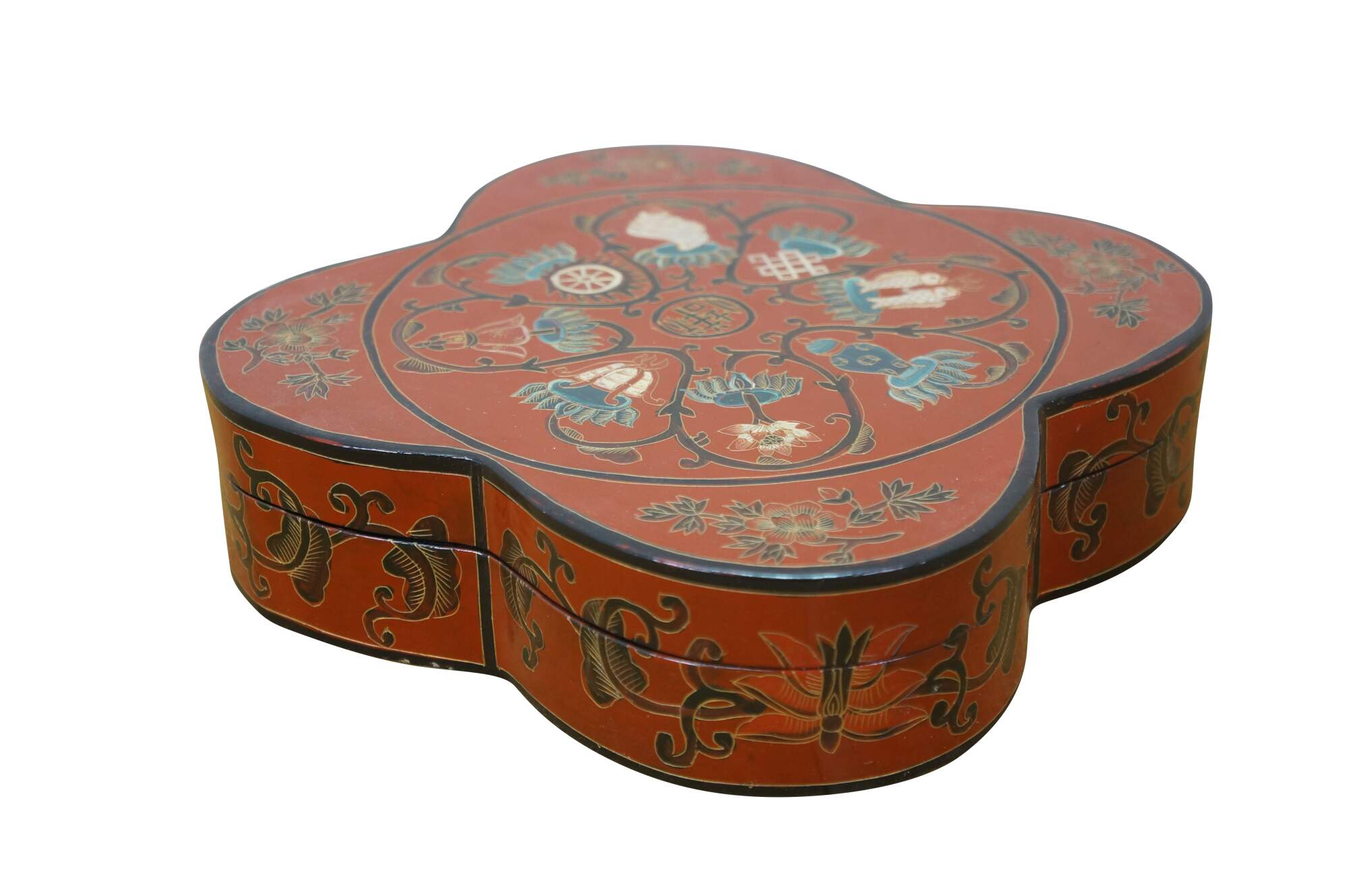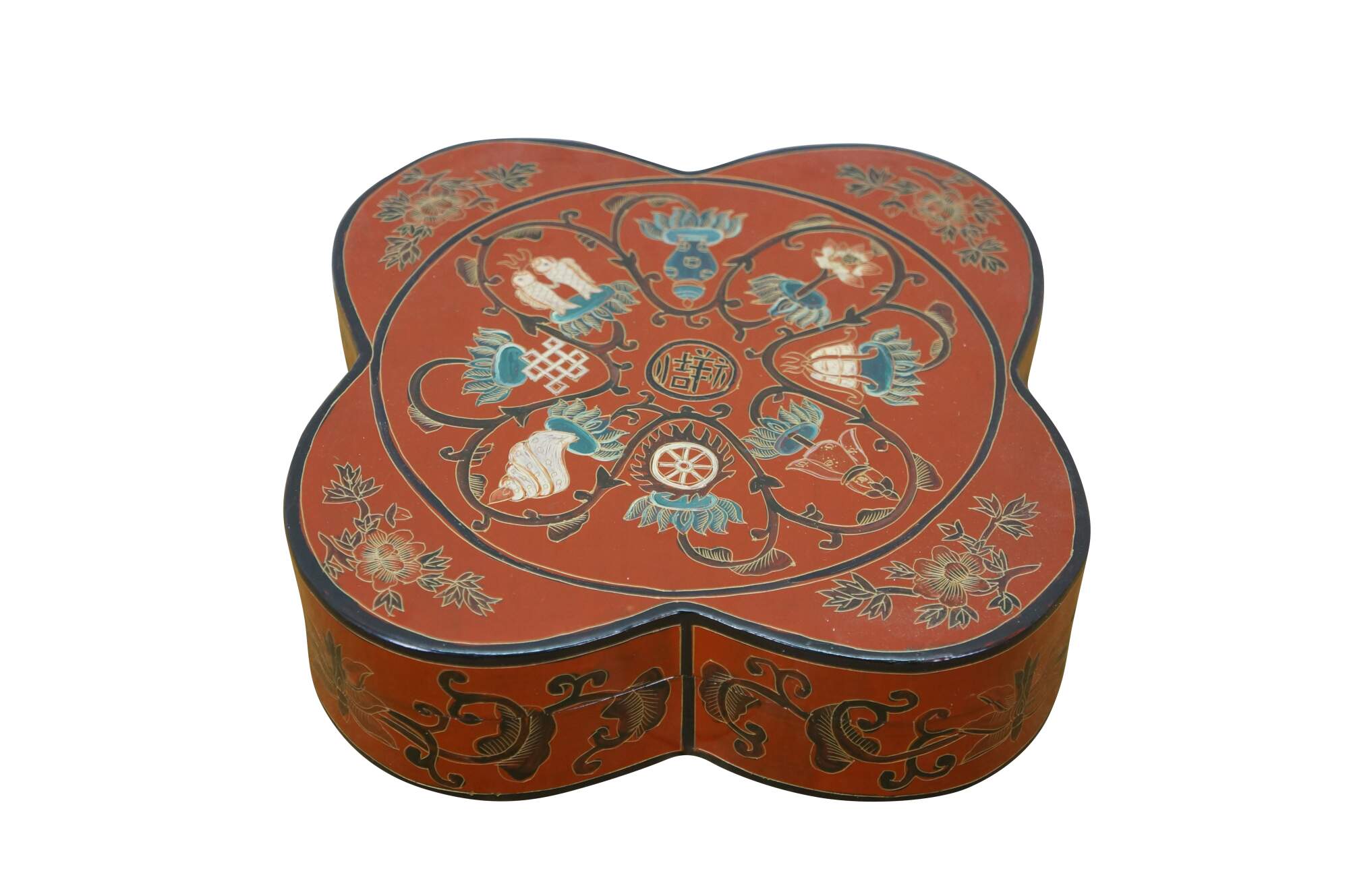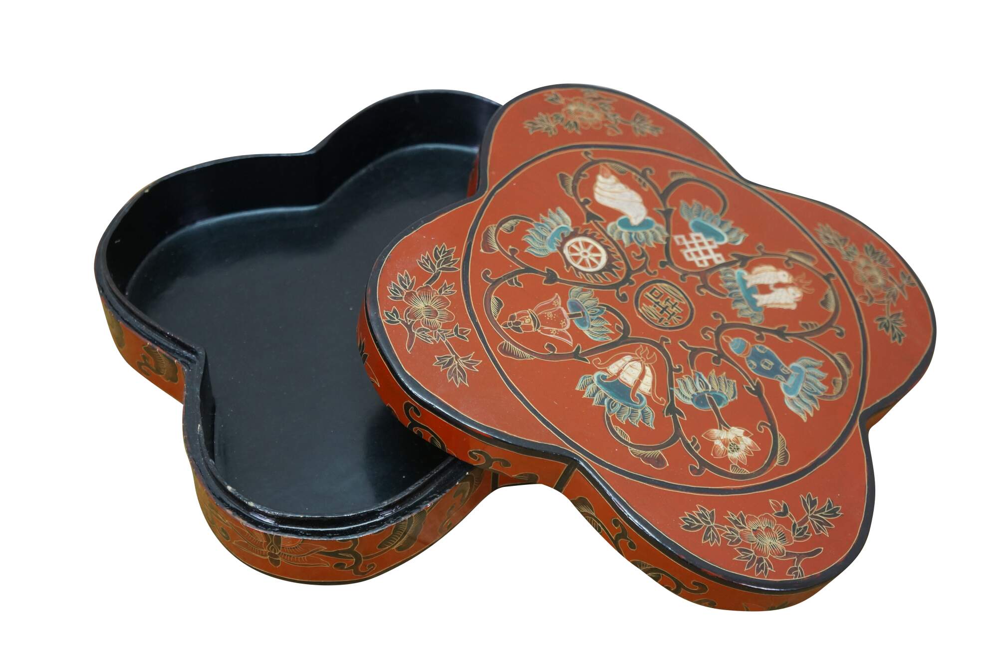 Vintage Chinese red and black lacquered four petal / clover shaped trinket keepsake box / case featuring the Eight Treasures pattern.