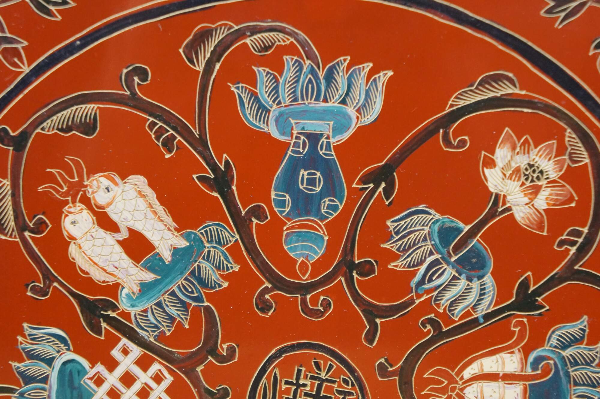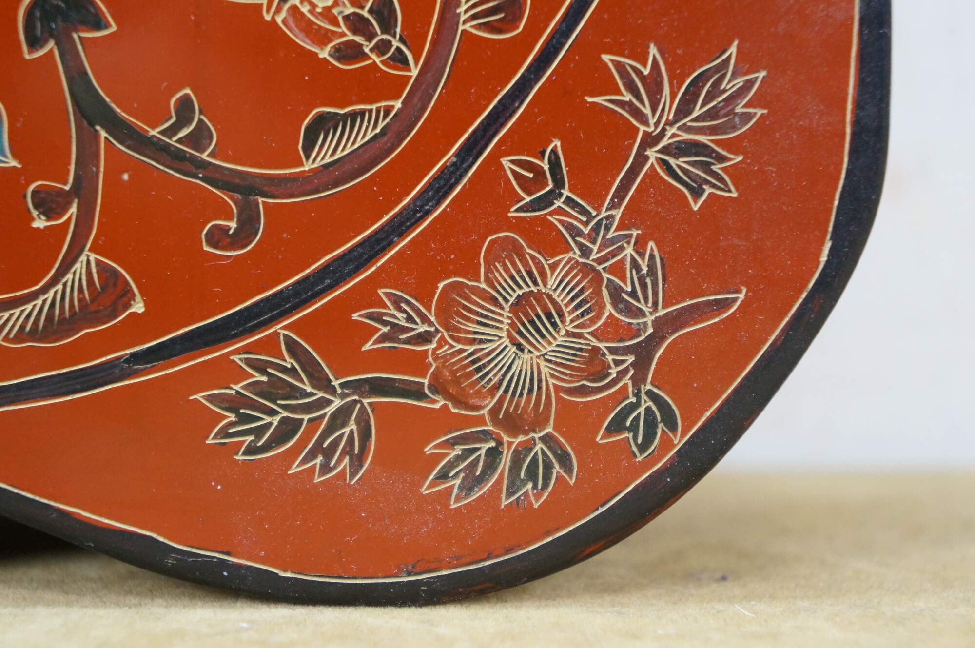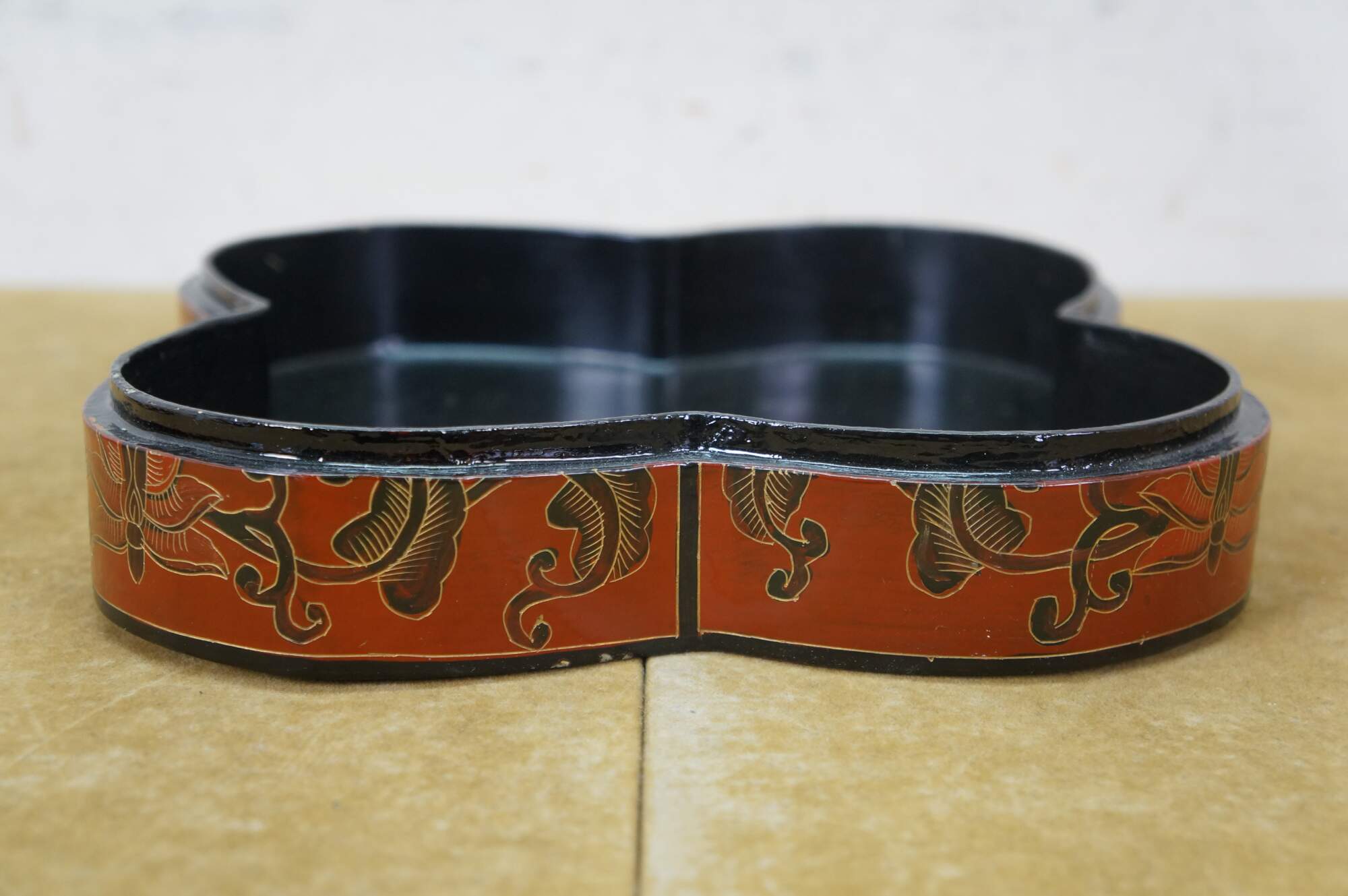 Vintage Chinese red and black lacquered four petal / clover shaped trinket keepsake box / case featuring the Eight Treasures pattern.