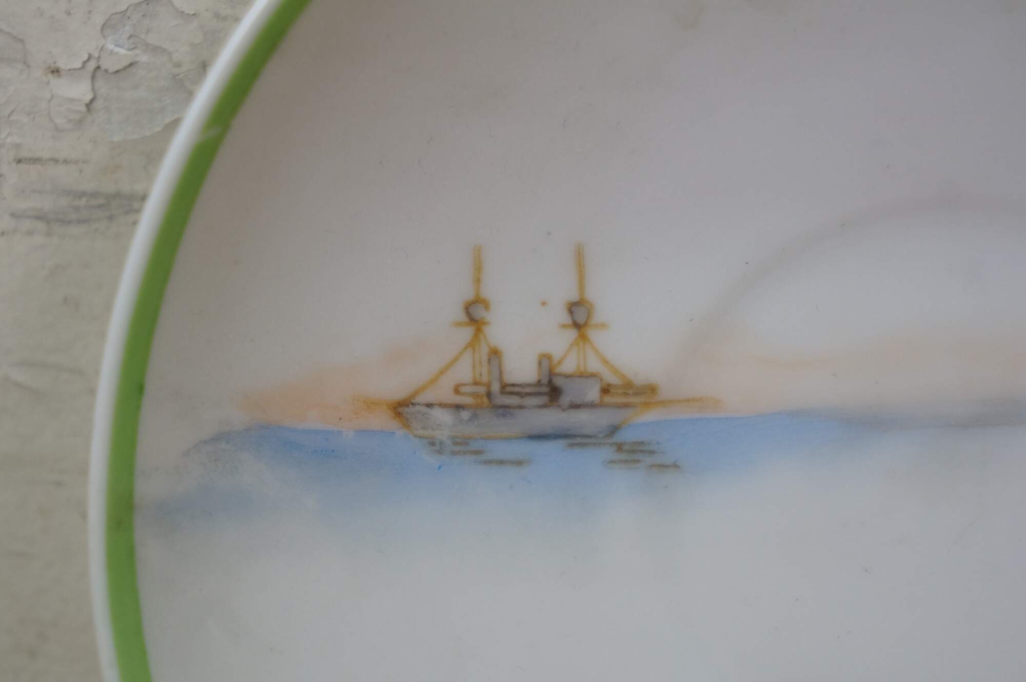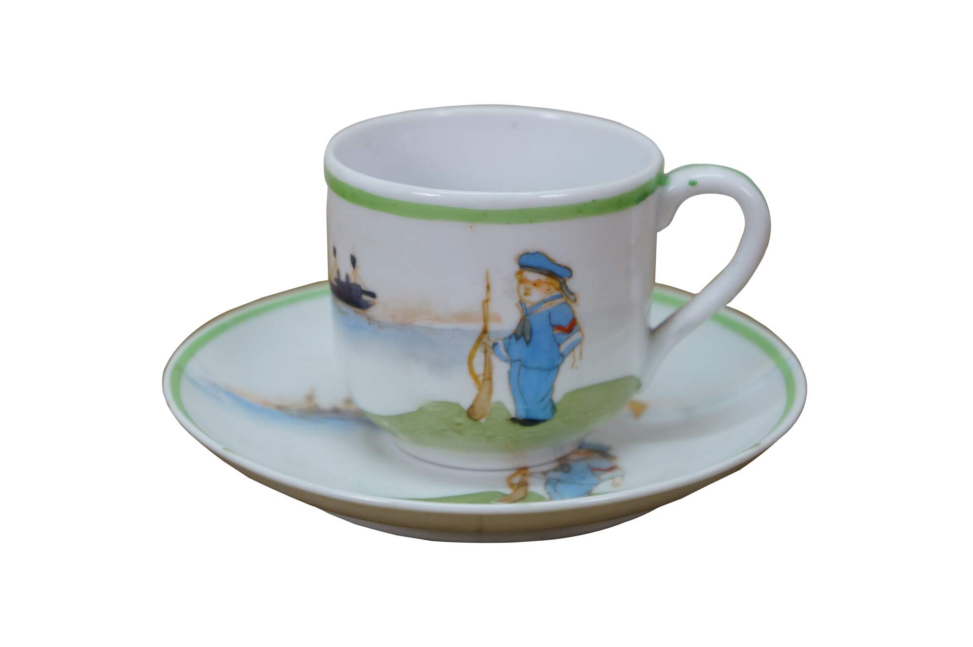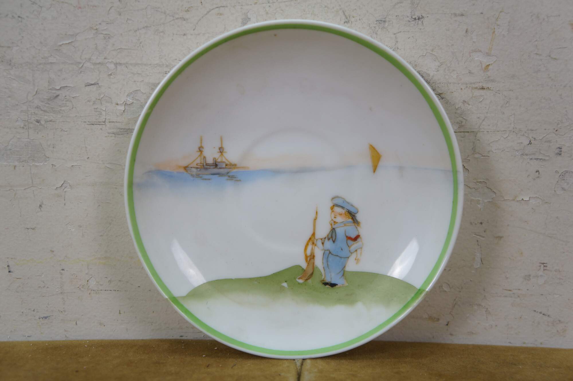 Antique tea cup and saucer featuring a hand-painted WWI-era nautical maritime sailor boy saluting a passing military ship. Produced in Japan by Noritake circa 1911 - 1921.