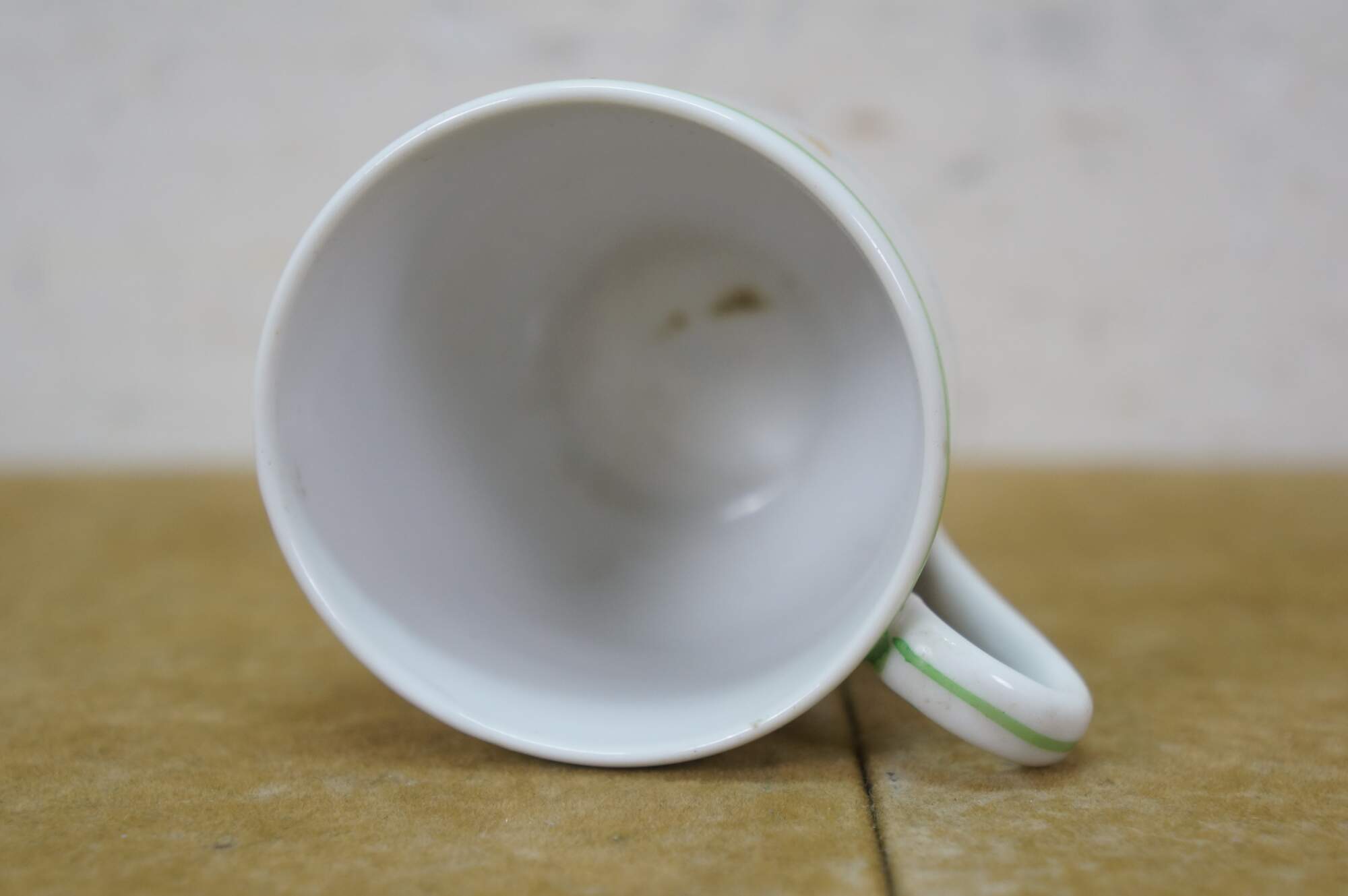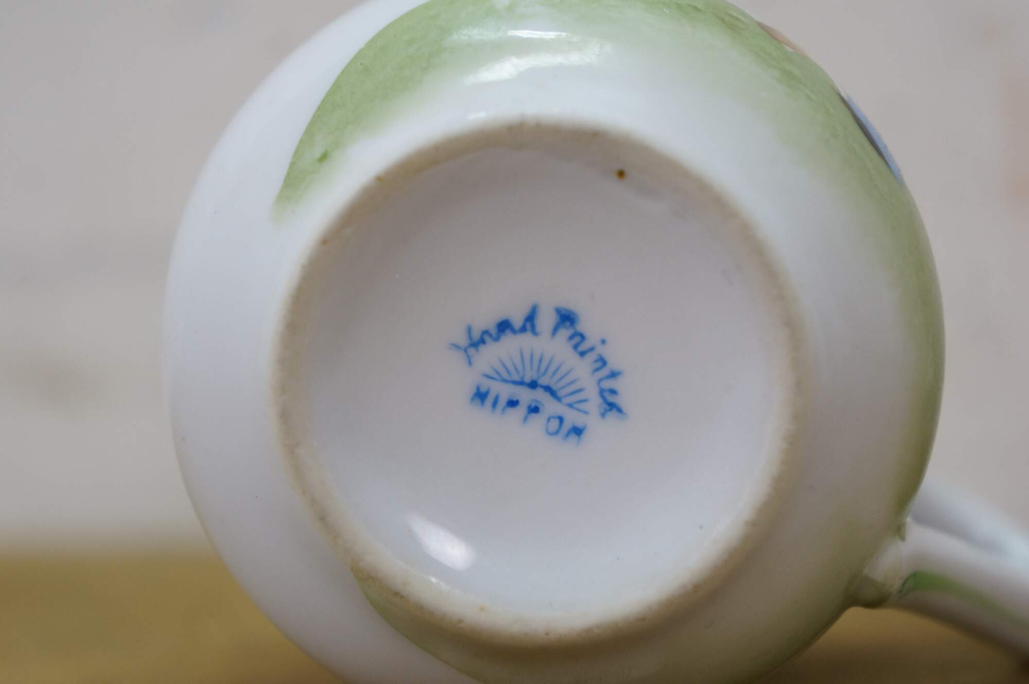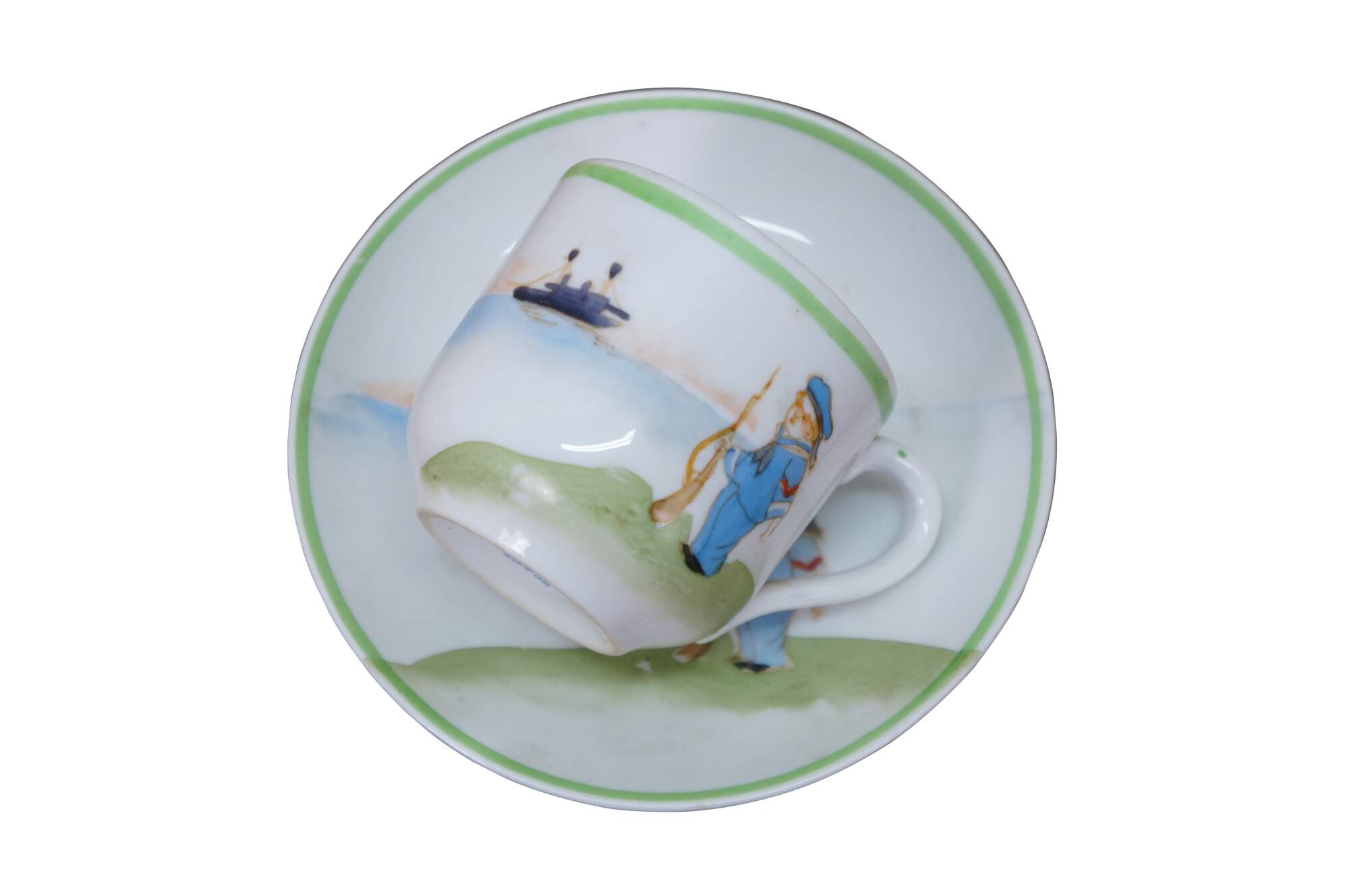 Antique tea cup and saucer featuring a hand-painted WWI-era nautical maritime sailor boy saluting a passing military ship. Produced in Japan by Noritake circa 1911 - 1921.