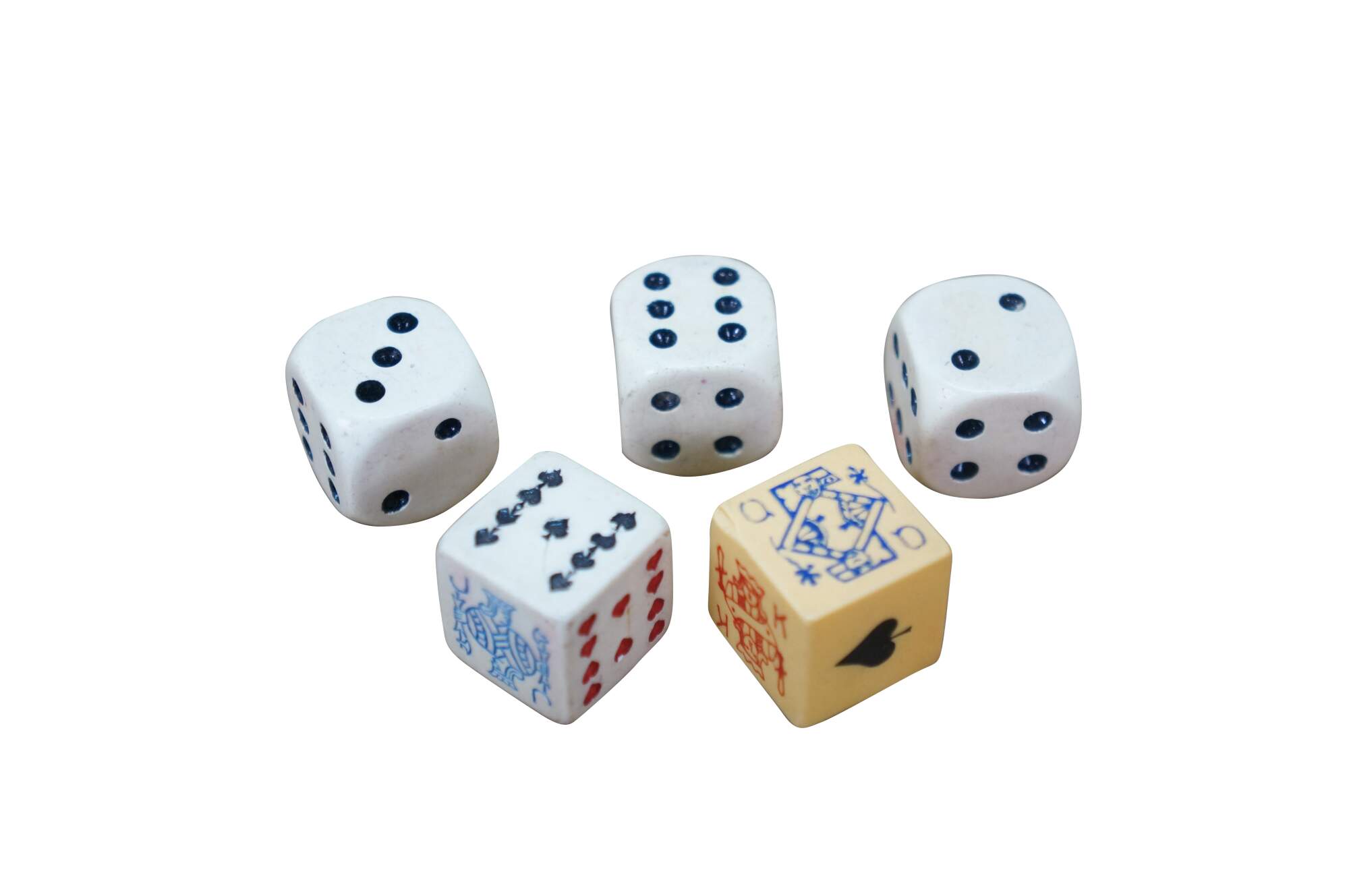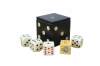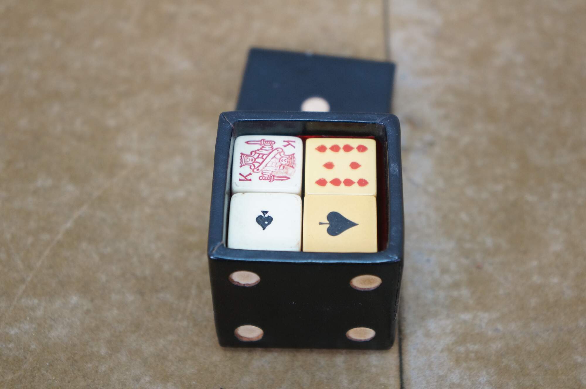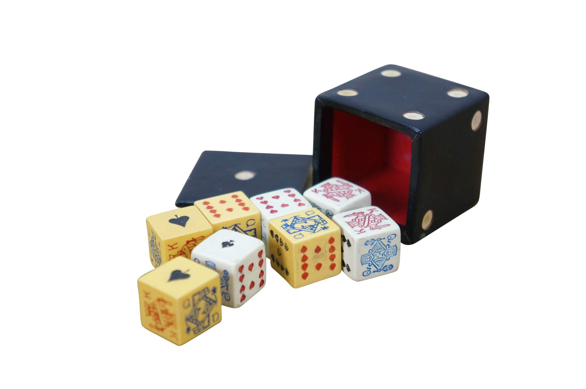 Vintage 14pc gaming dice set including a large die-shaped box accompanied by several smaller dice in varying shapes and styles, including some bakelite.