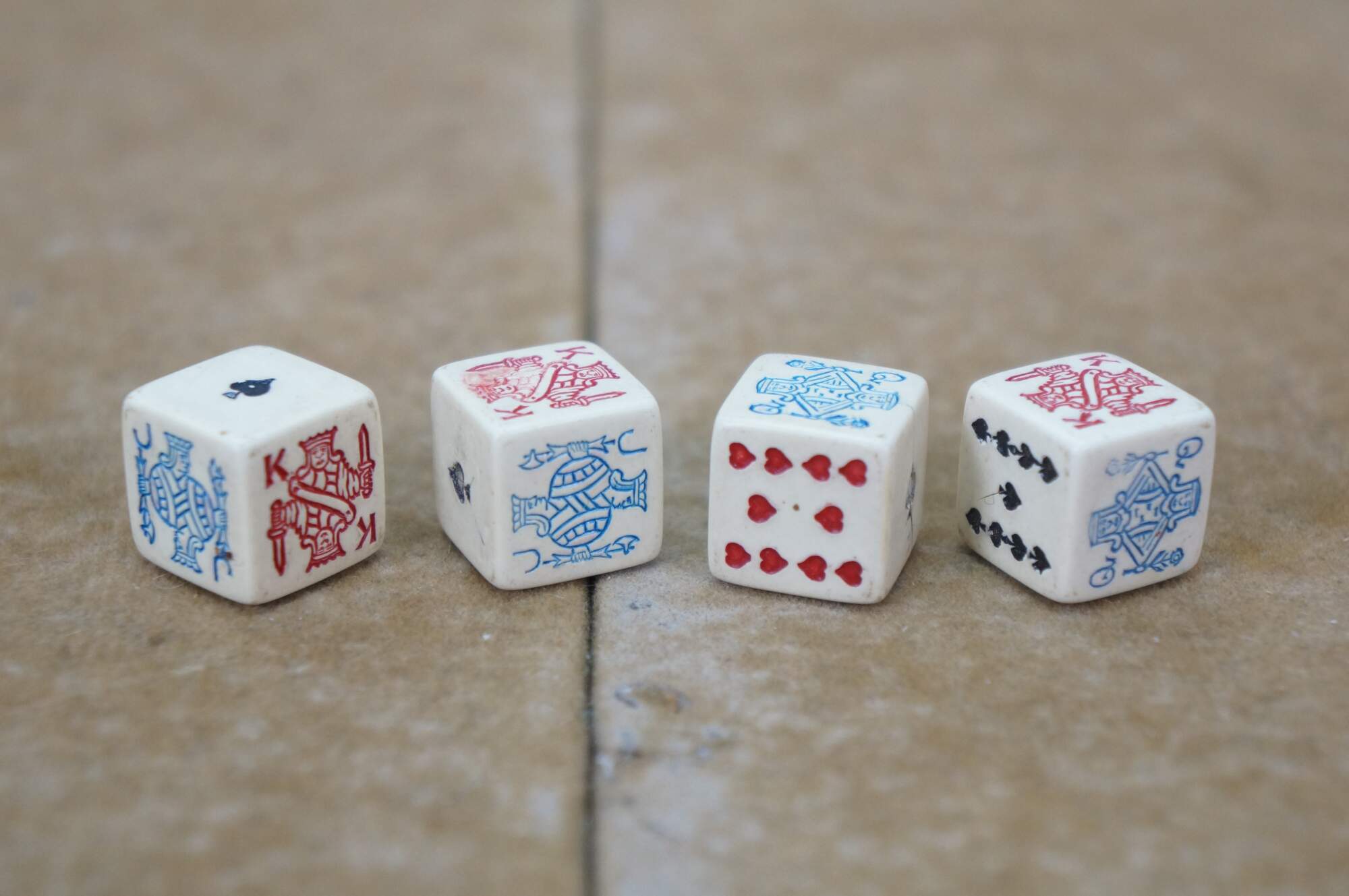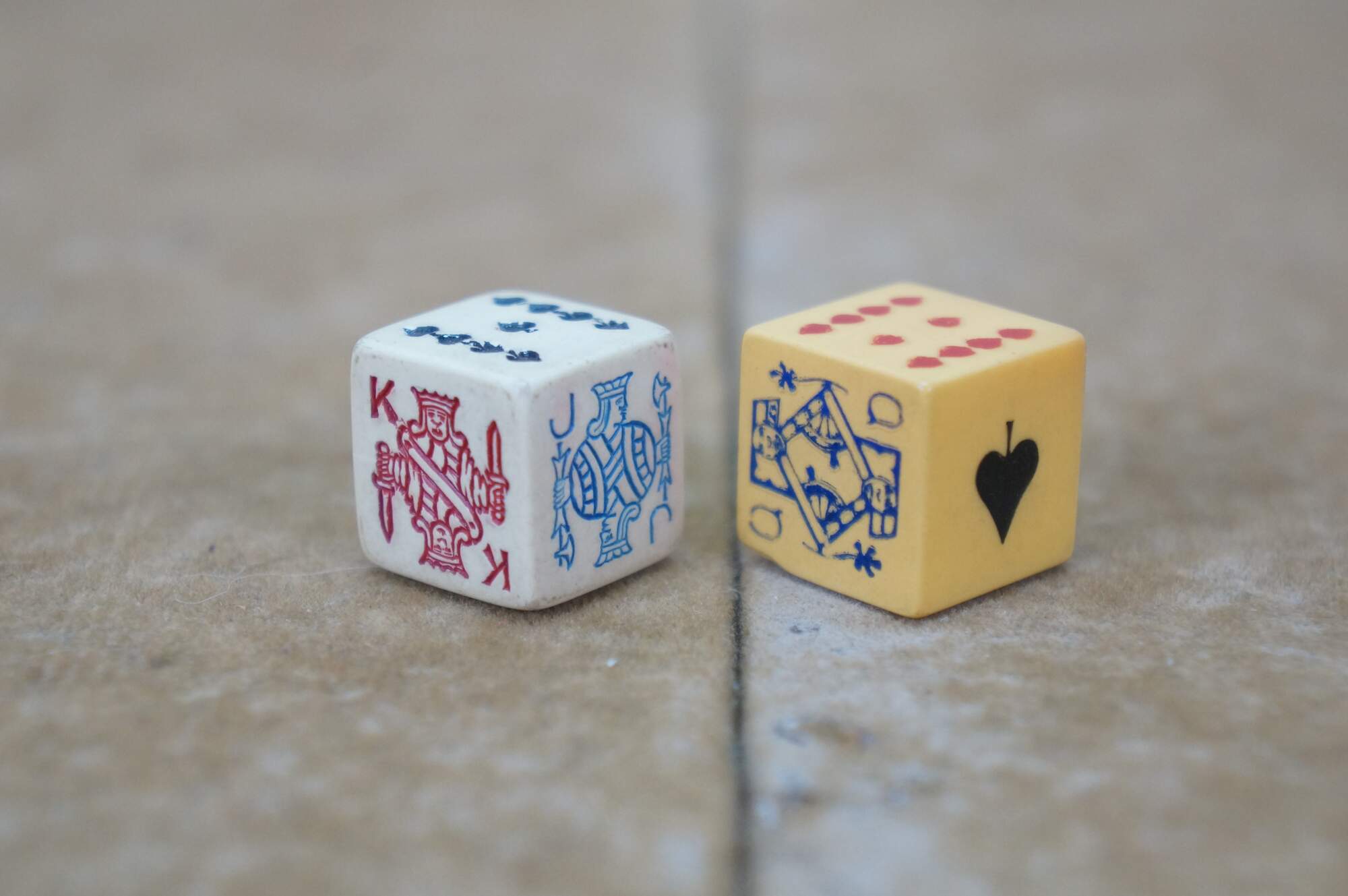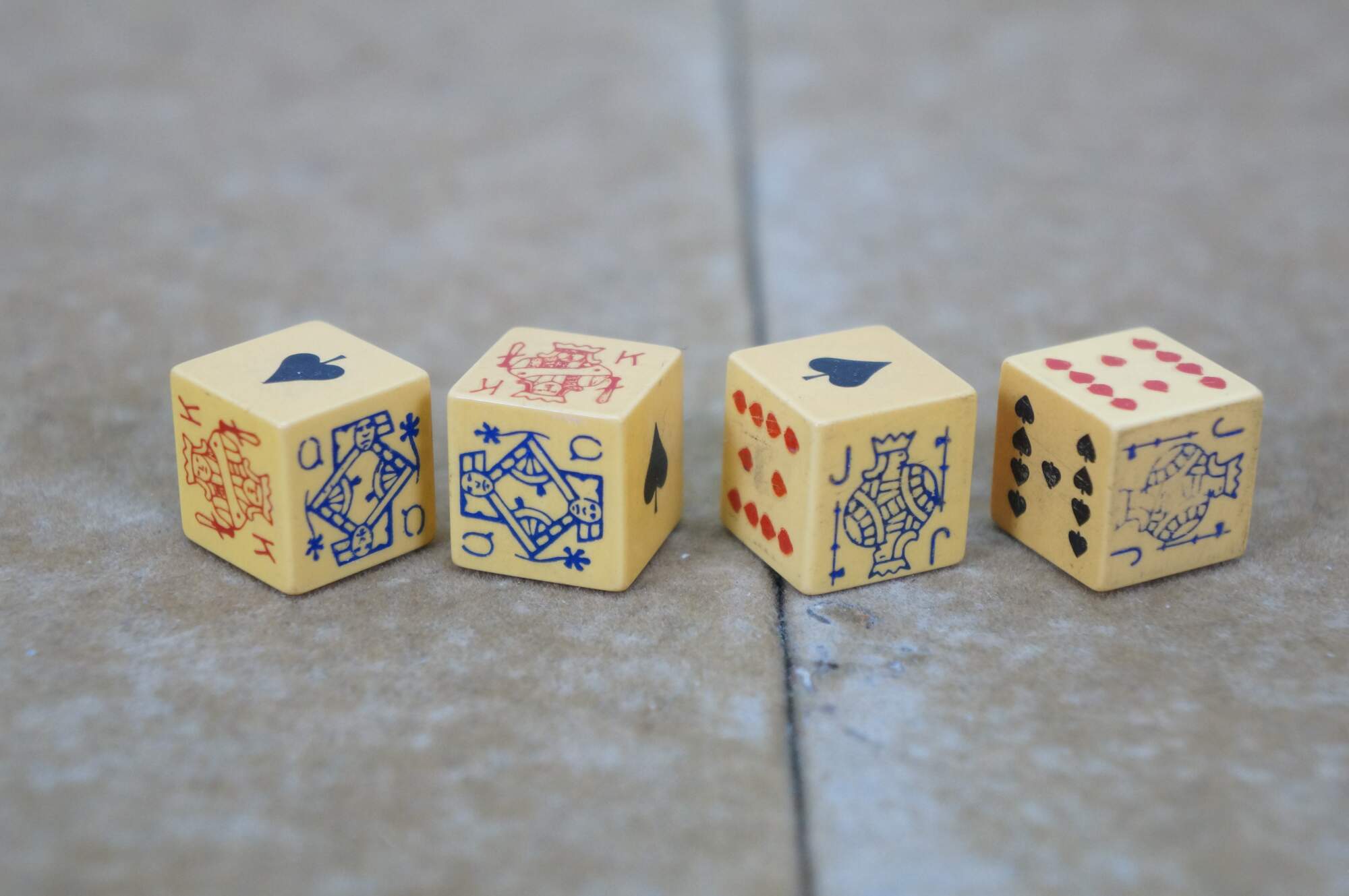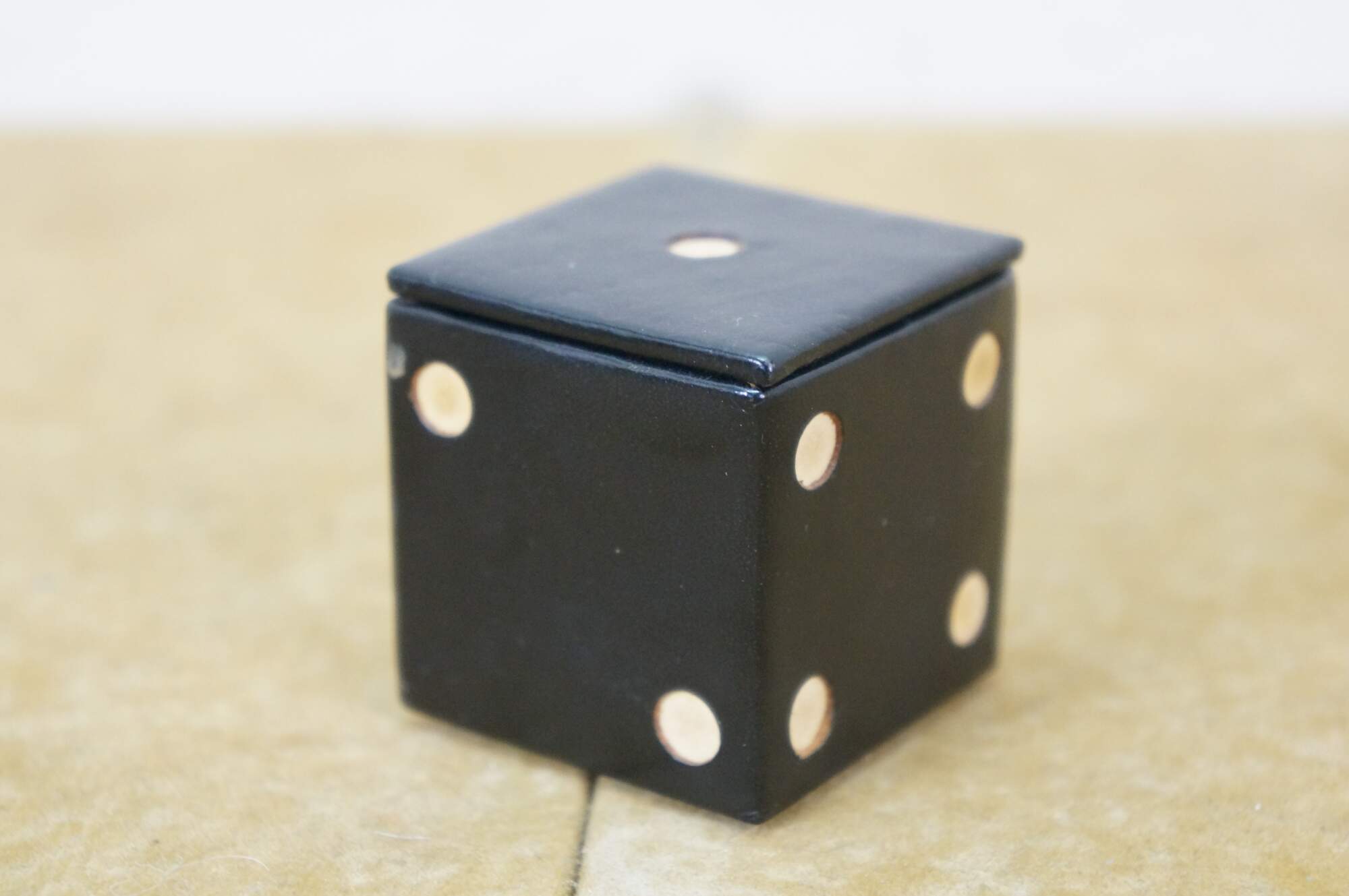 Vintage 14pc gaming dice set including a large die-shaped box accompanied by several smaller dice in varying shapes and styles, including some bakelite.