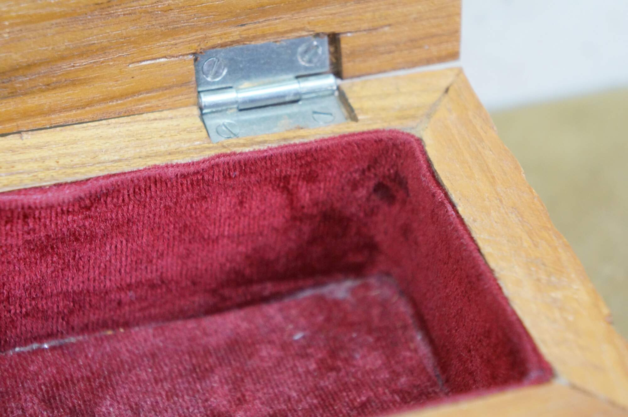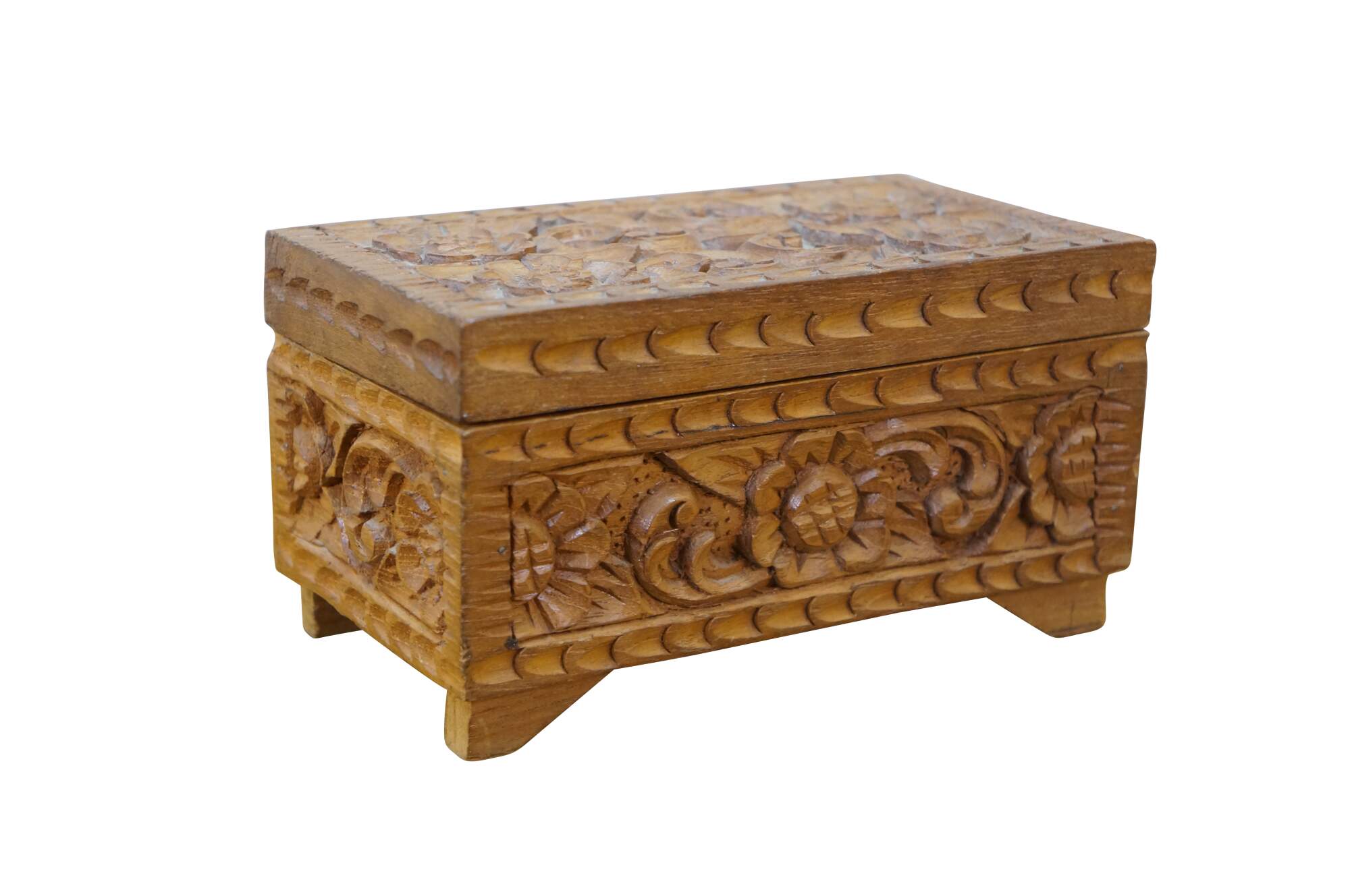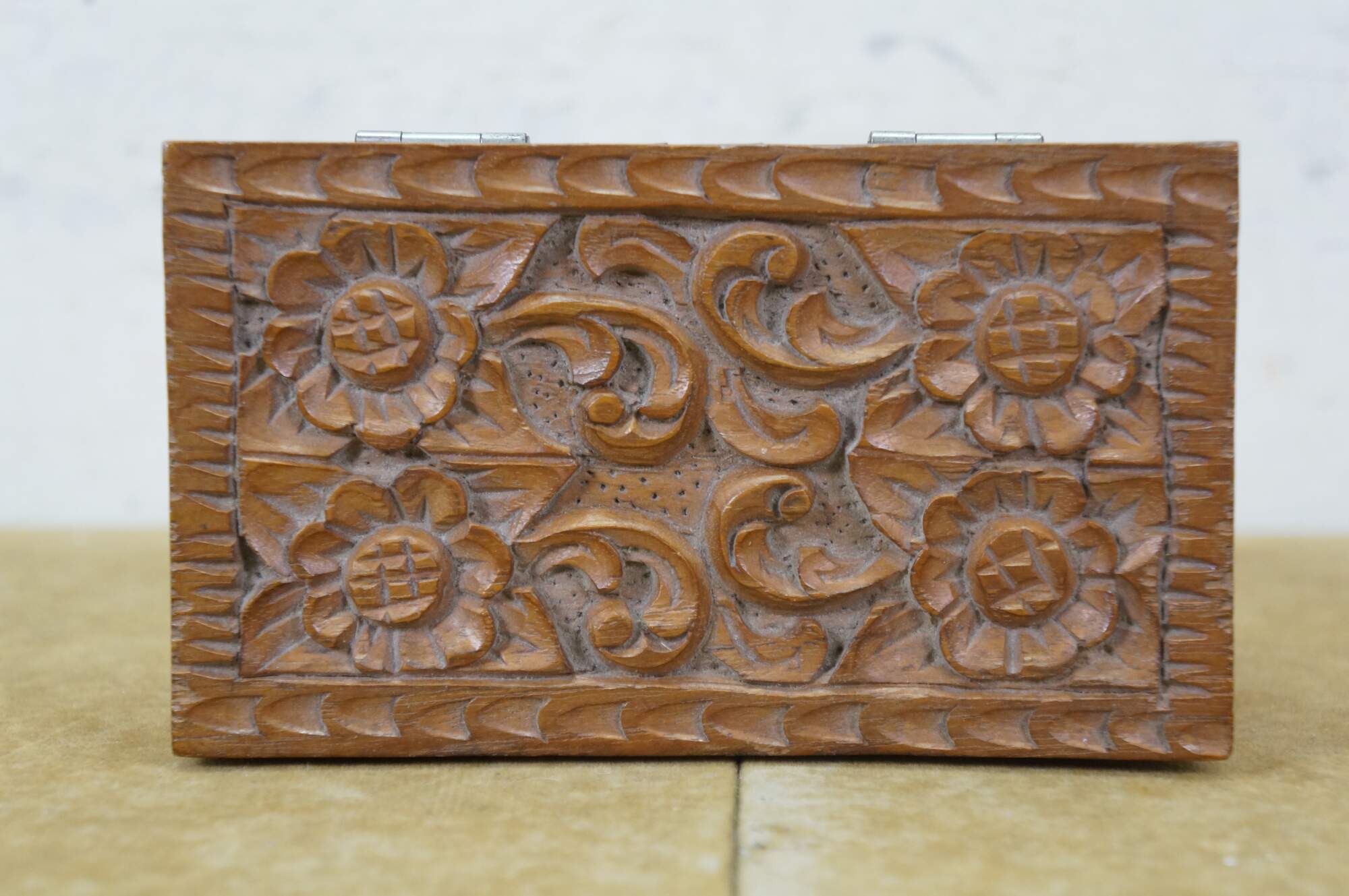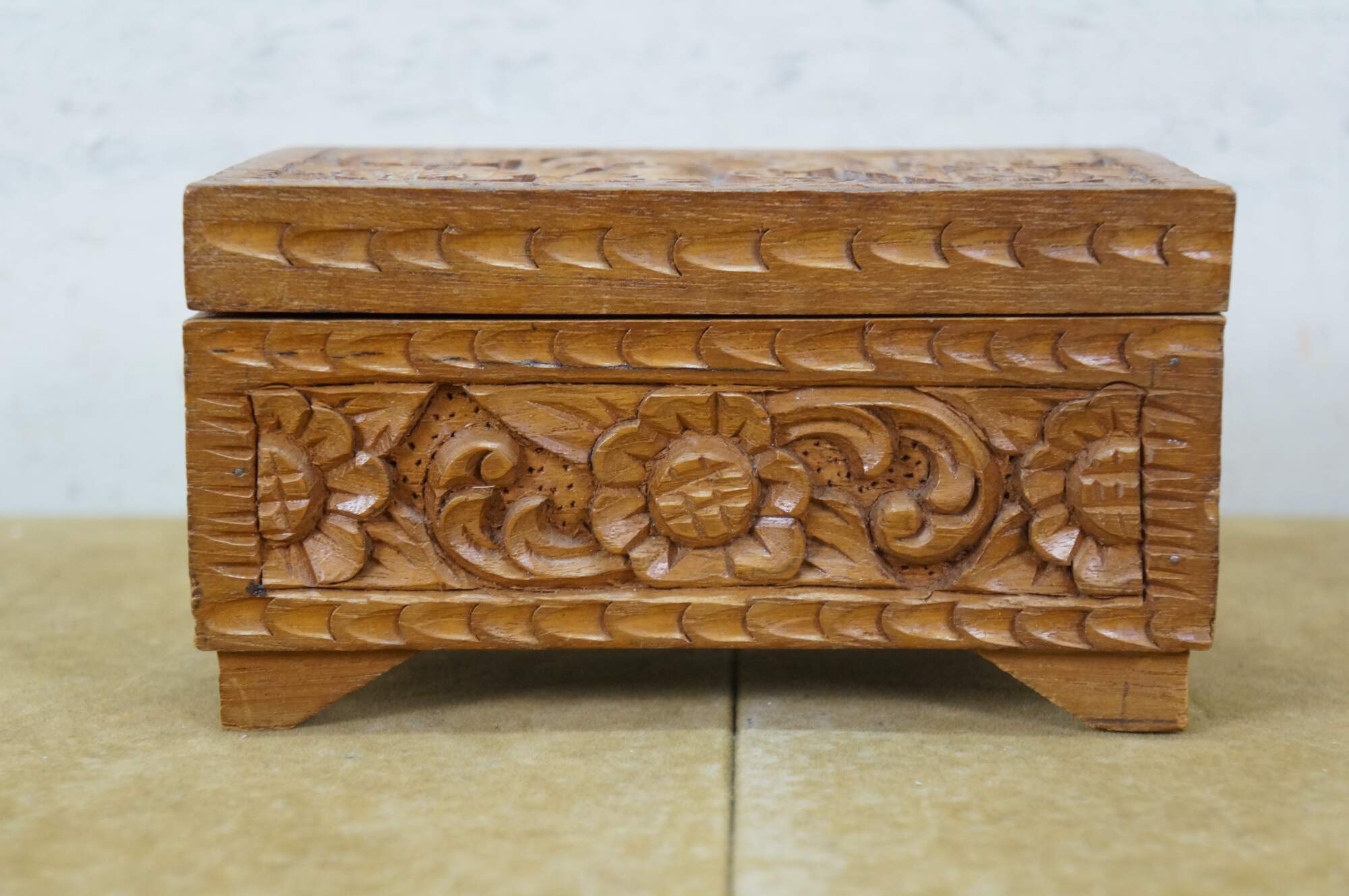 Vintage hand carved wooden jewelry / trinket / valet / treasure box featuring floral acanthus design with red velvet interior.