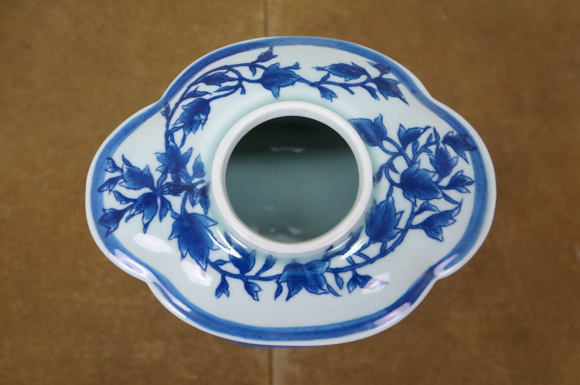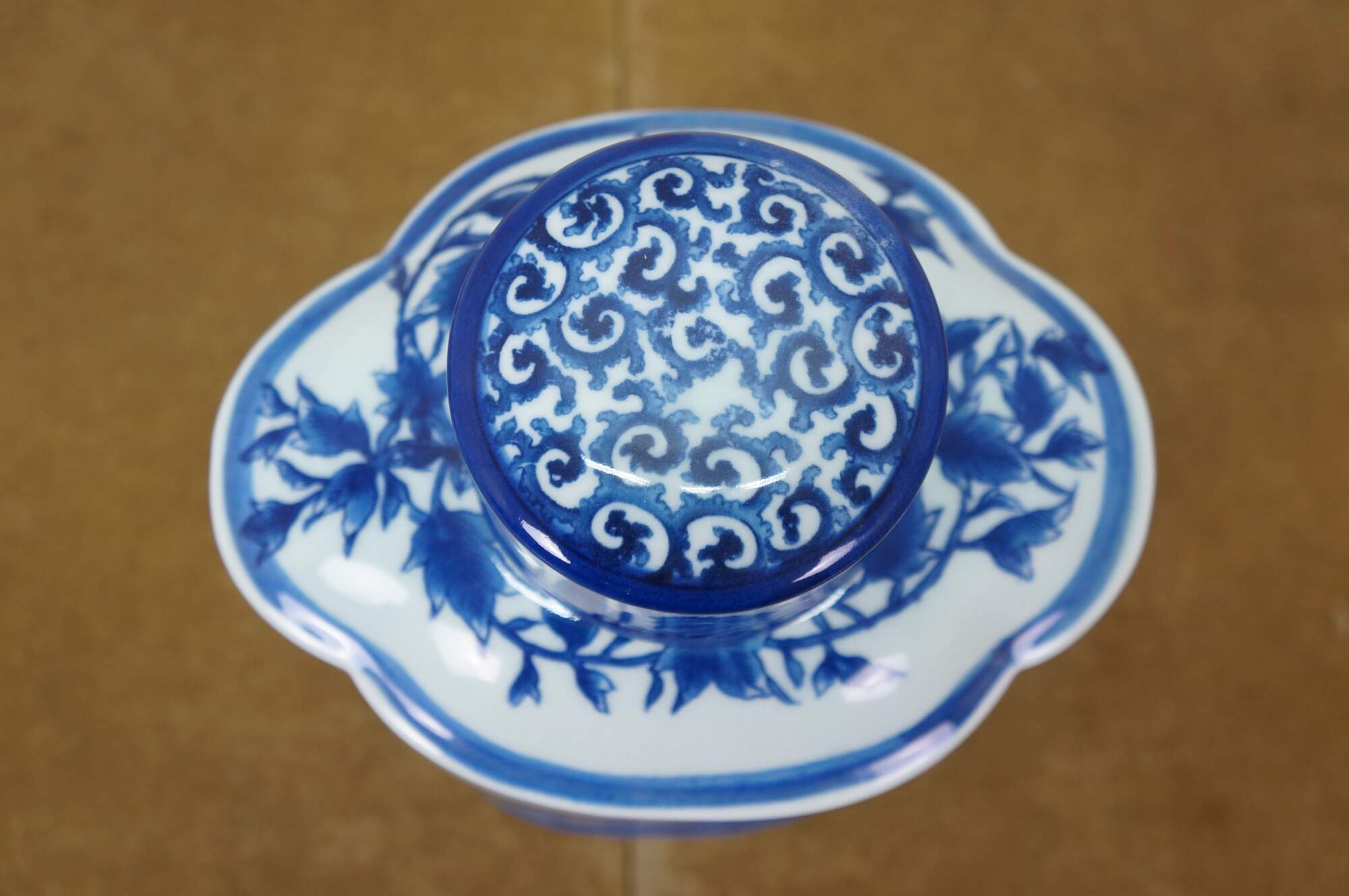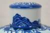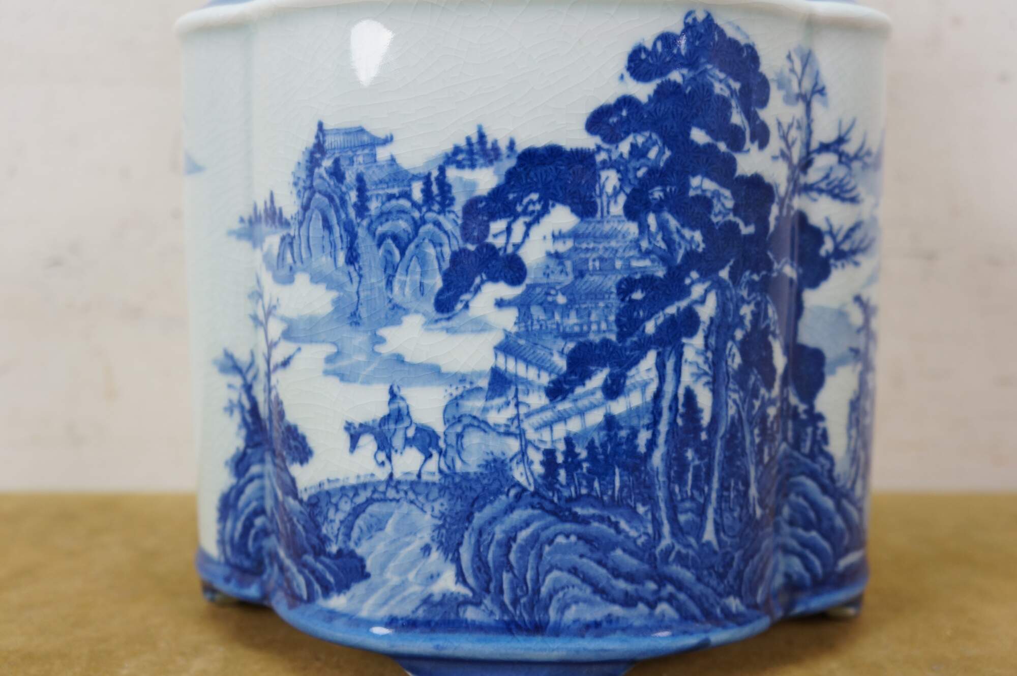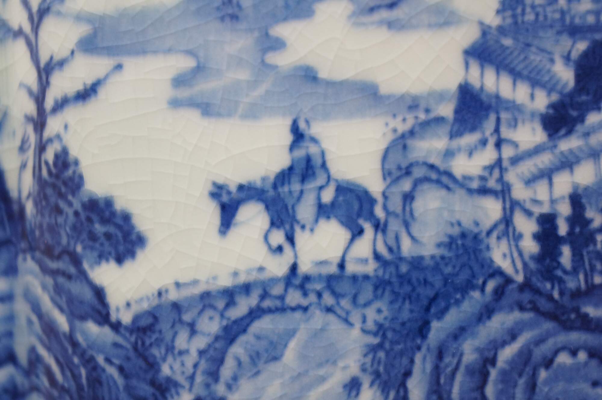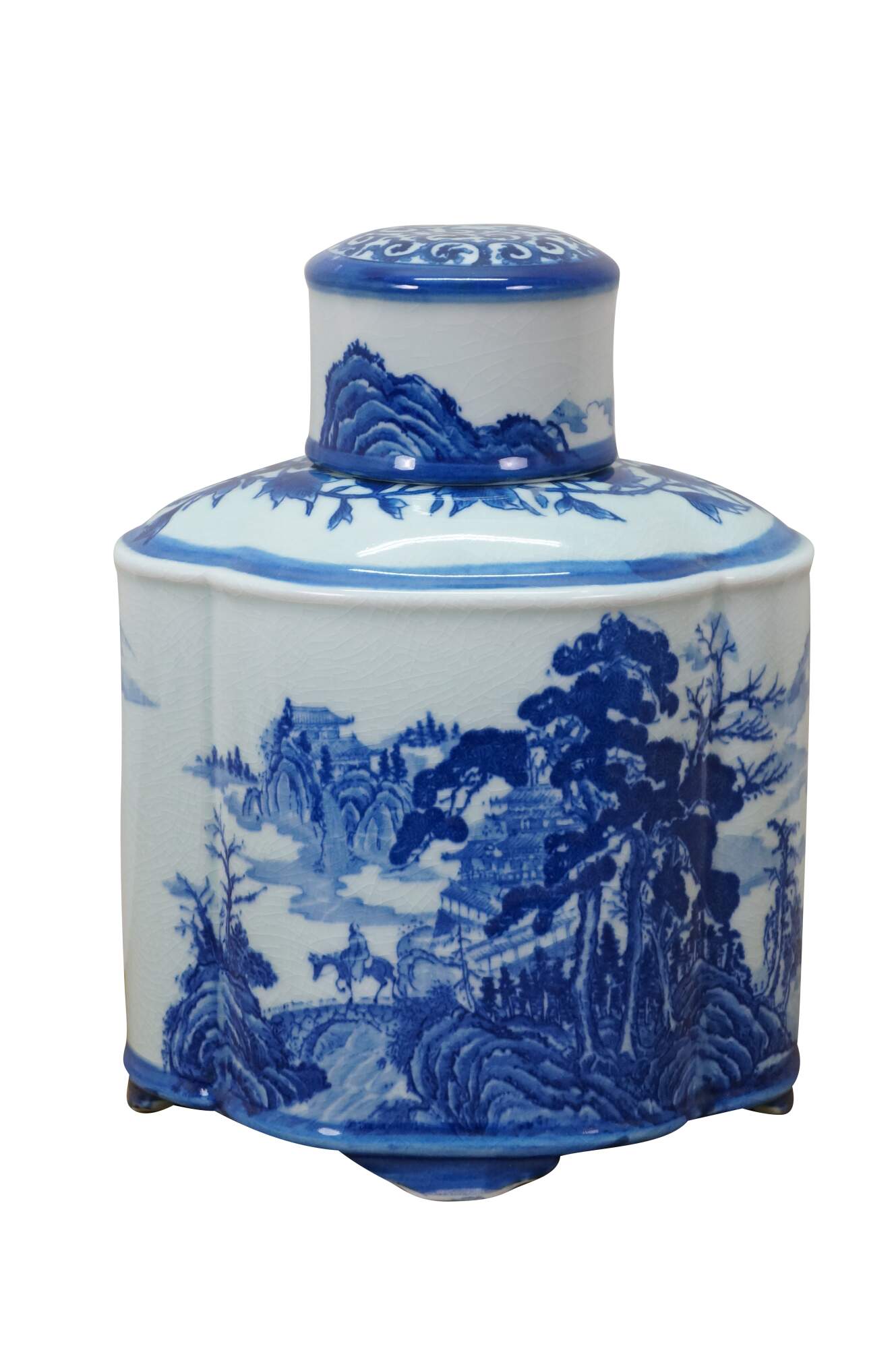Large antique Chinese export blue and white porcelain tea caddy / ginger jar / decanter featuring hand-painted mountain landscape scene with Pagodas and a figure on a horse or donkey.