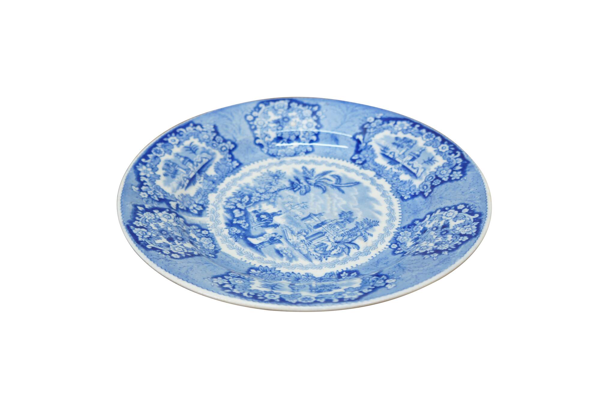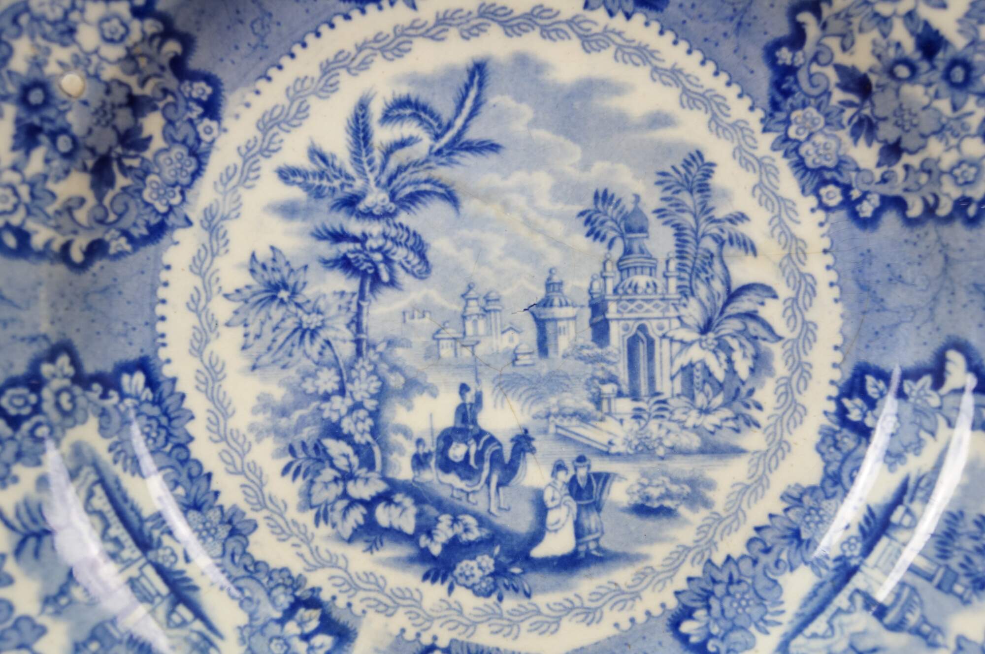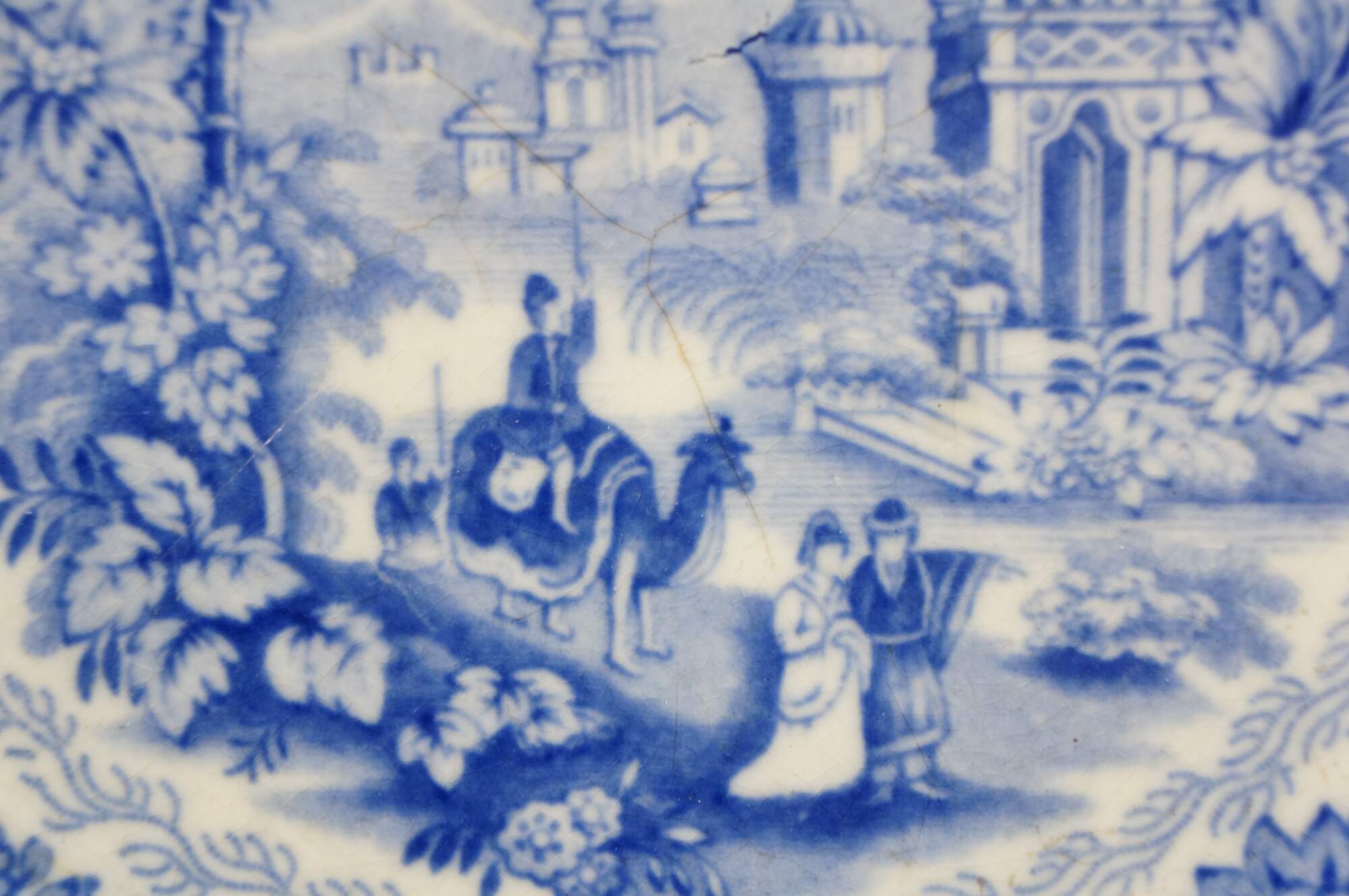 Antique Dutch transferware plate in the Oriental Blue pattern by Petrus Regout & Co. of Maastricht. The plate features a blue and white Chinoiserie design with an exotic landscape, Palaces / Castles, and a procession with camels.