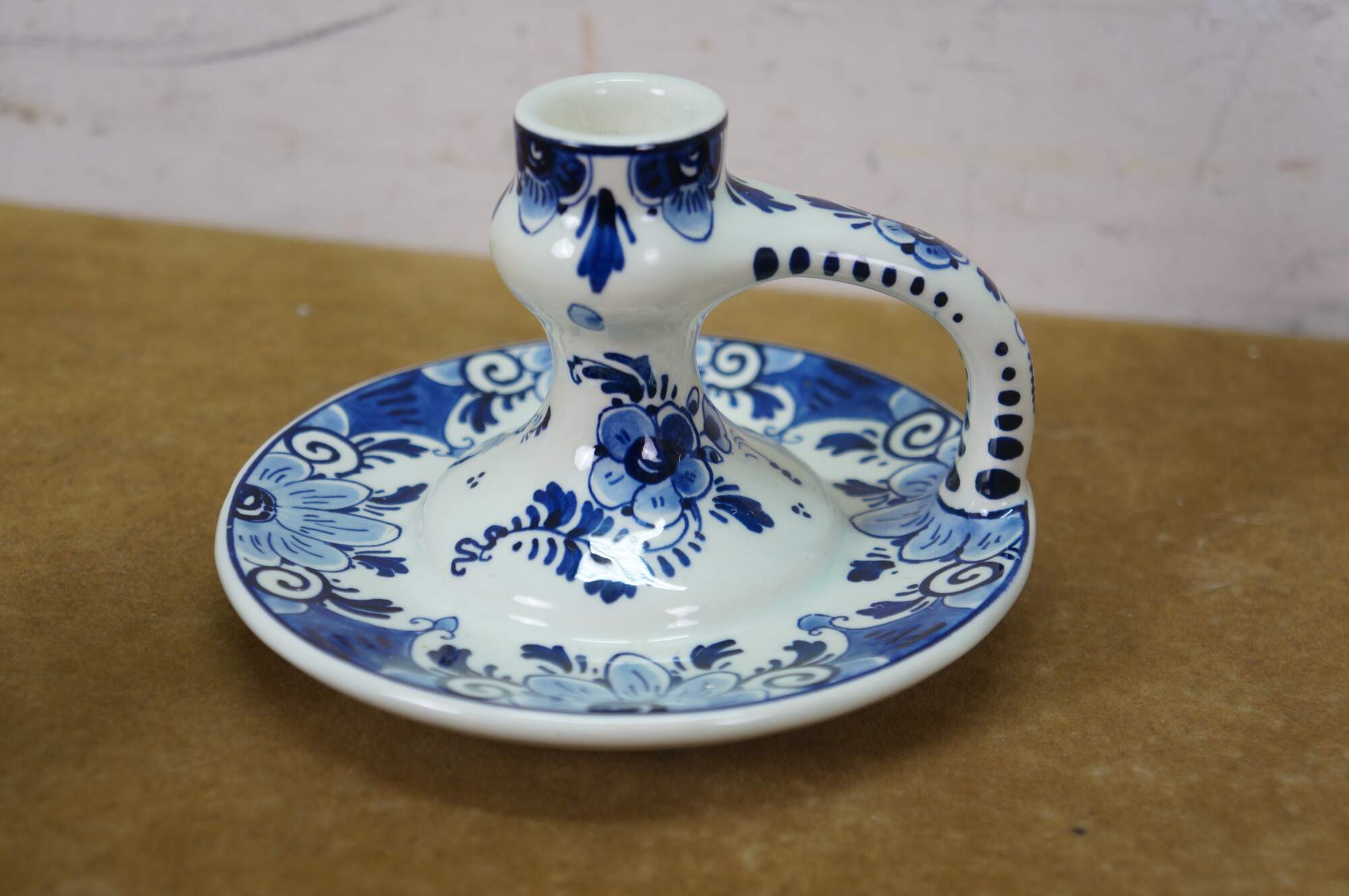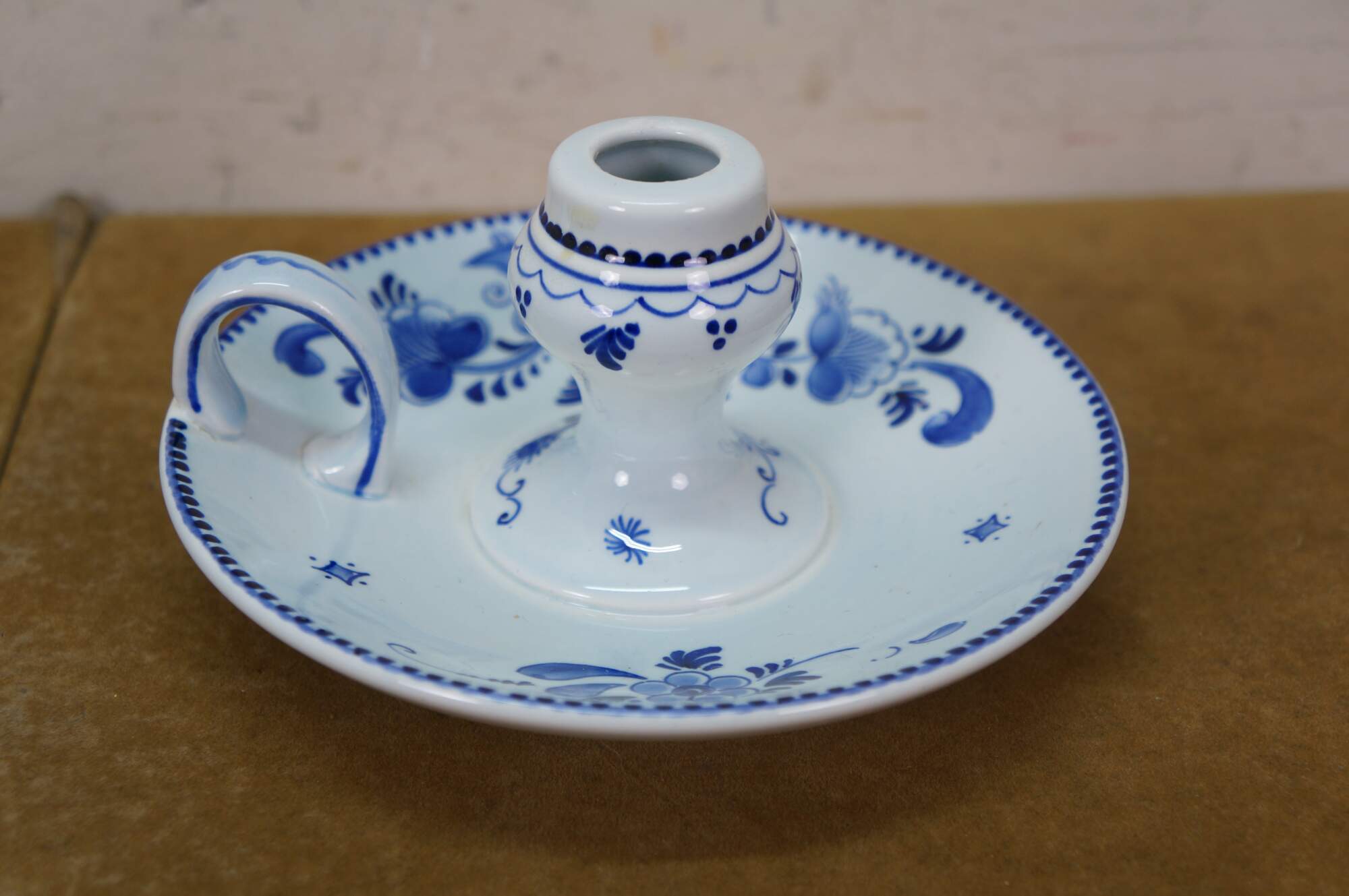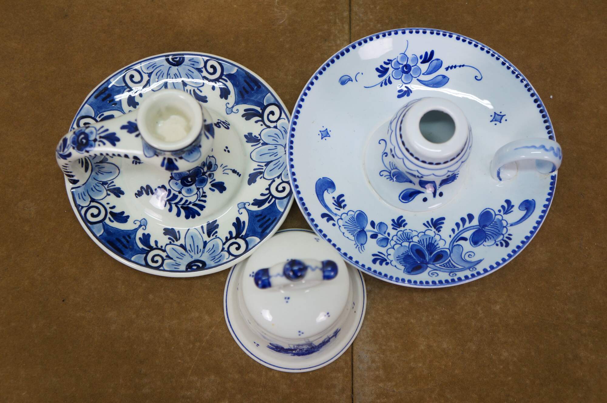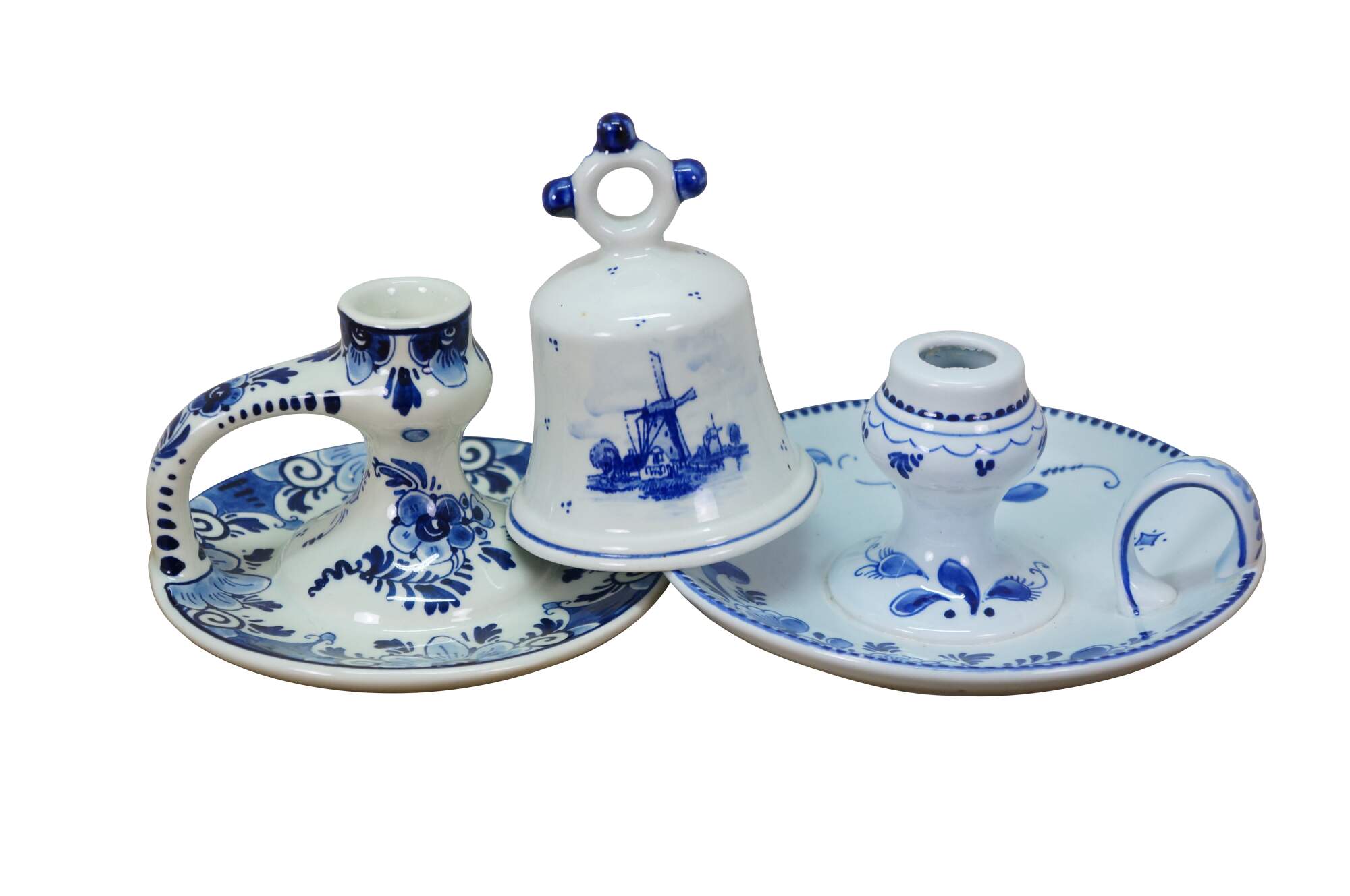 Vintage Dutch Holland Delft farmhouse wares. Includes two chamberstick candle holders and one butler valet service bell with windmill. Regina Blauw 1987, Schoonhaven 5126, Royal G Delfts 1549.