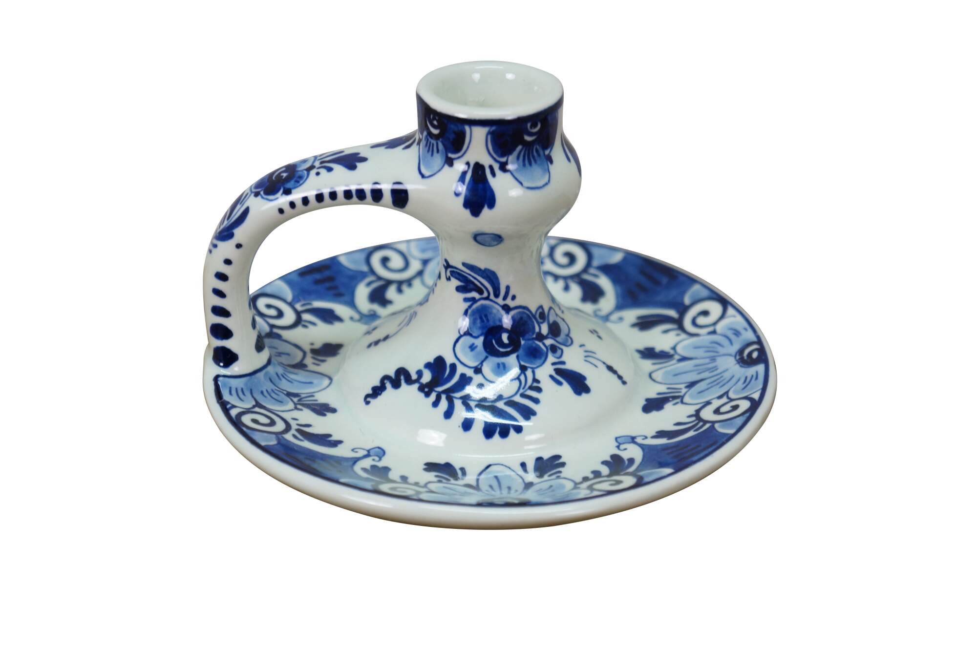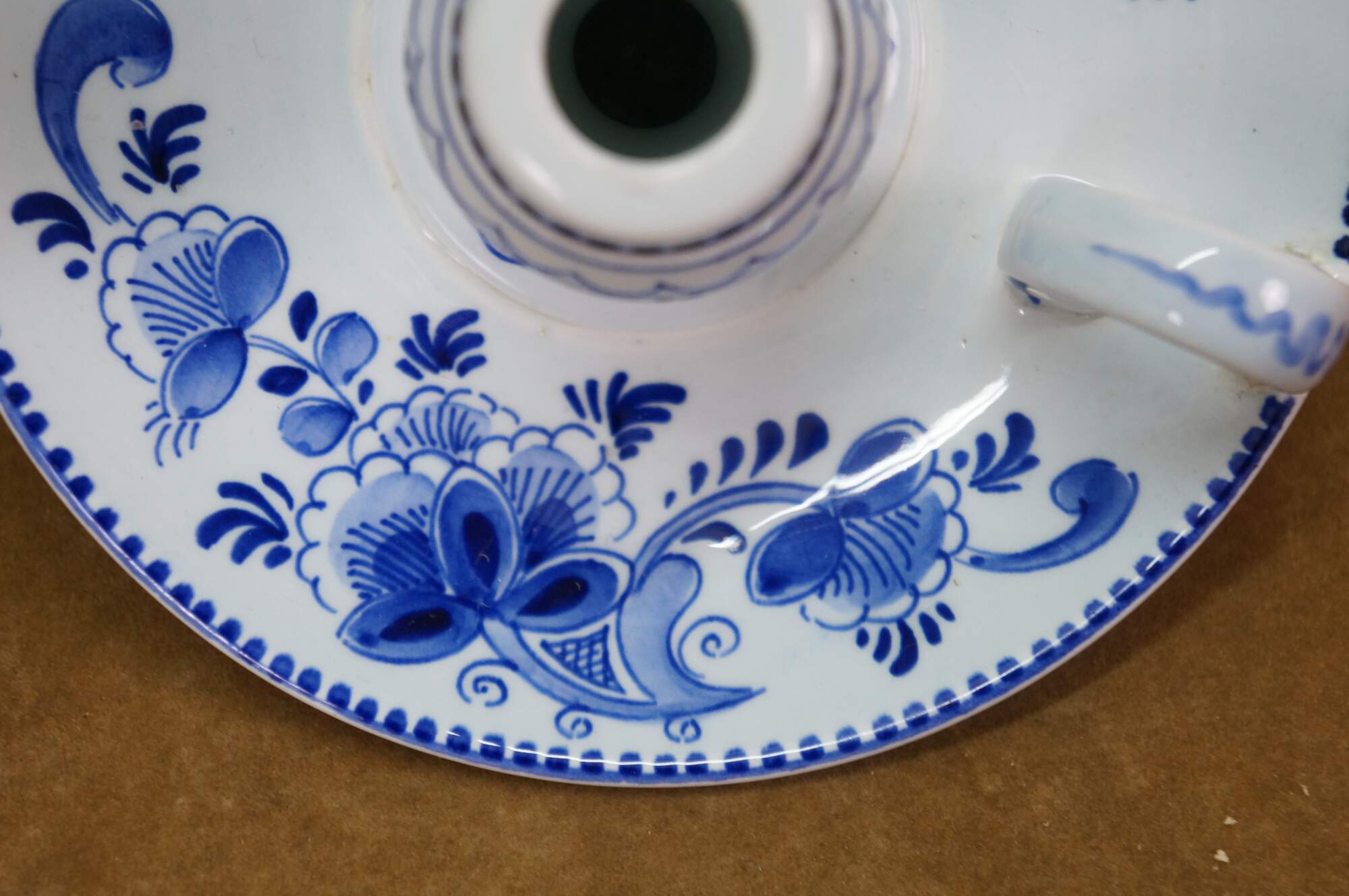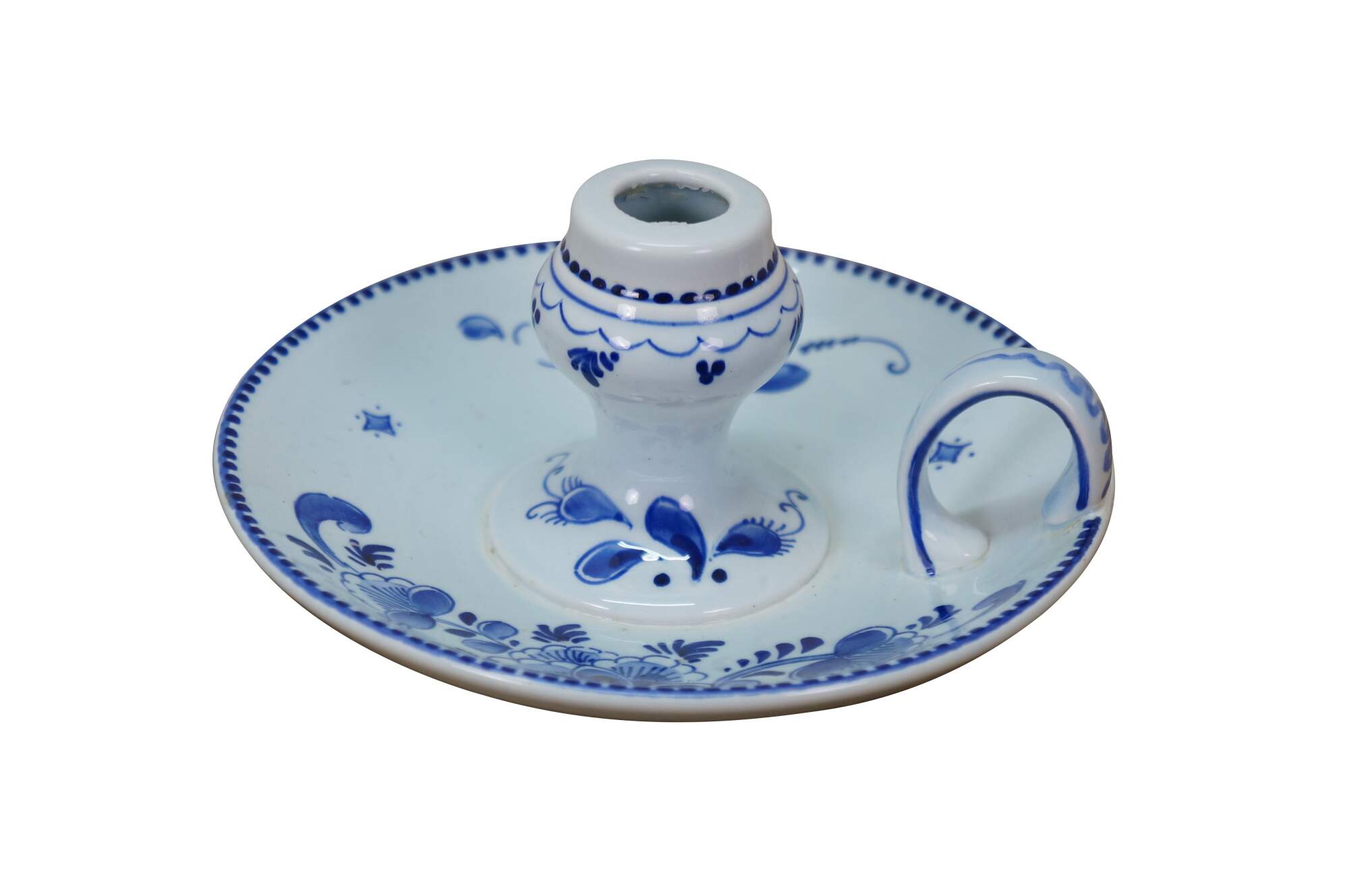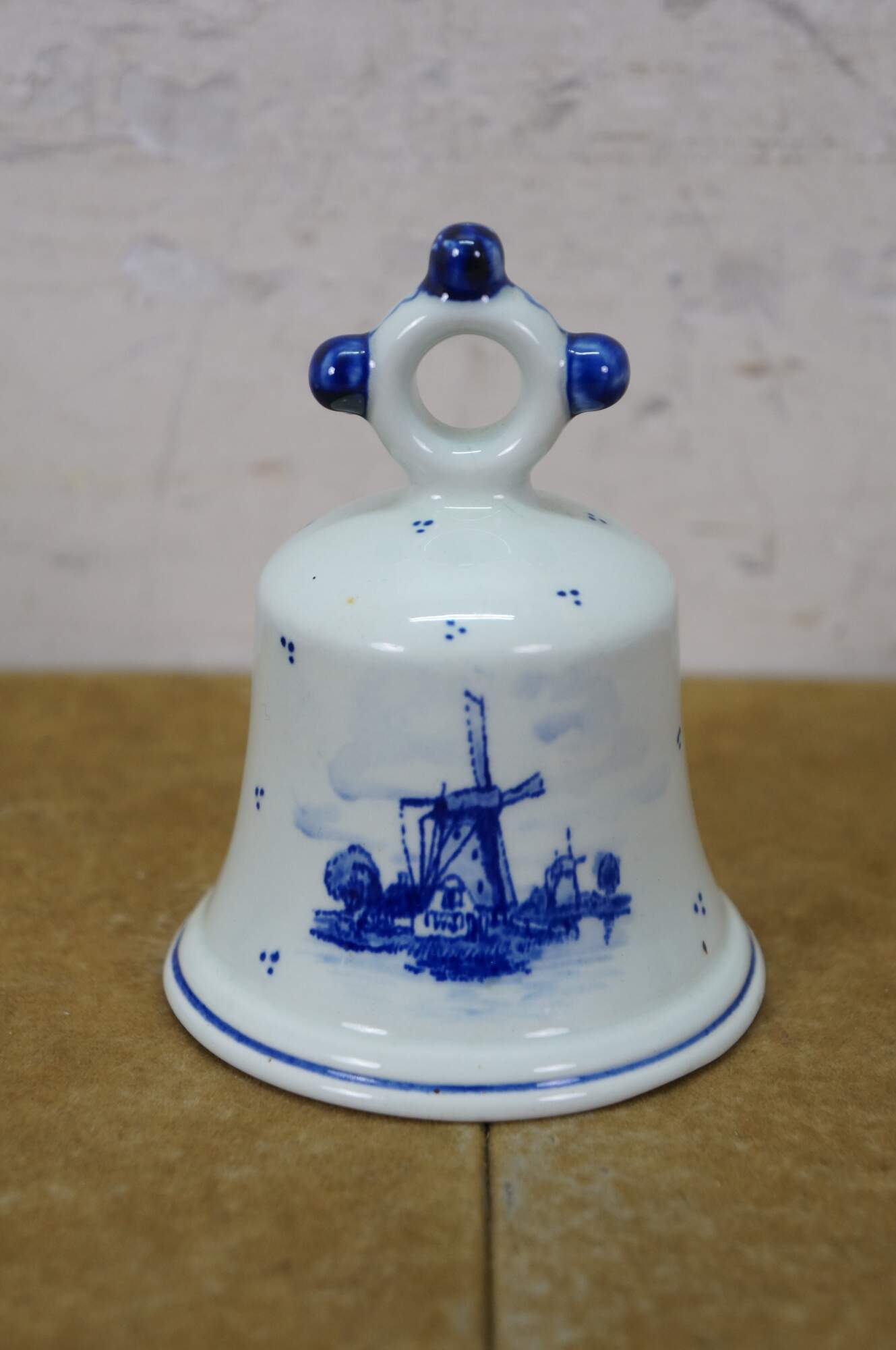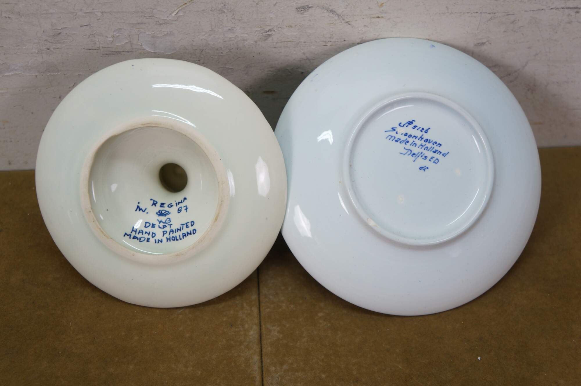 Vintage Dutch Holland Delft farmhouse wares. Includes two chamberstick candle holders and one butler valet service bell with windmill. Regina Blauw 1987, Schoonhaven 5126, Royal G Delfts 1549.