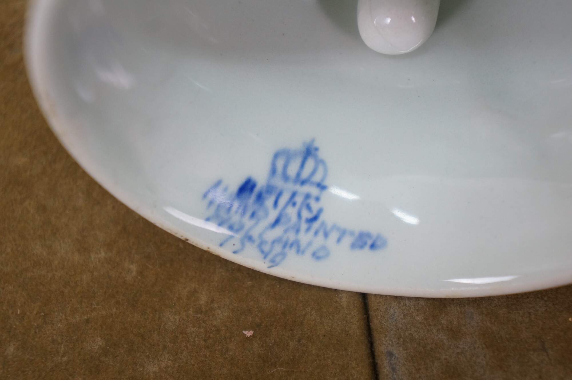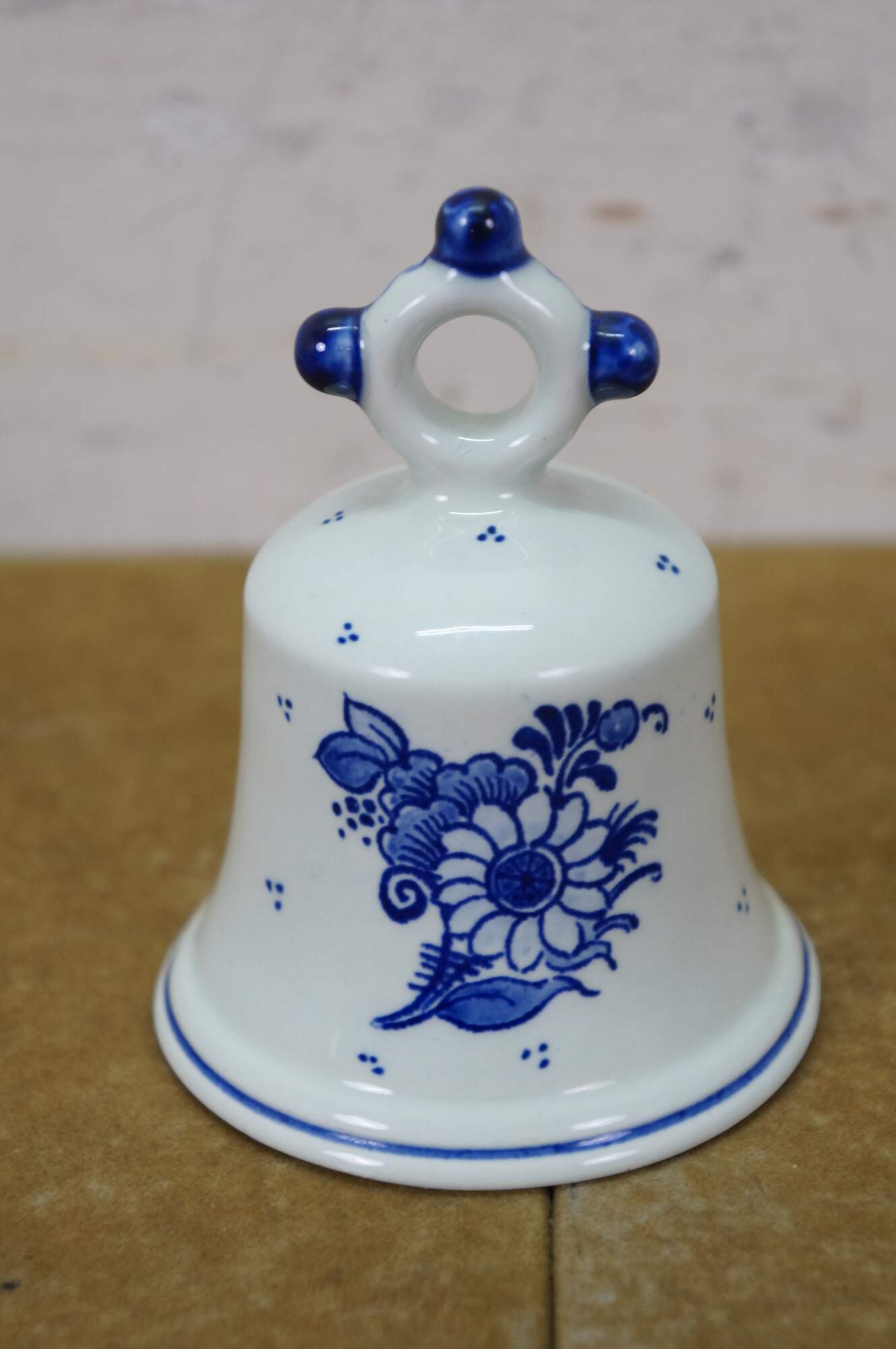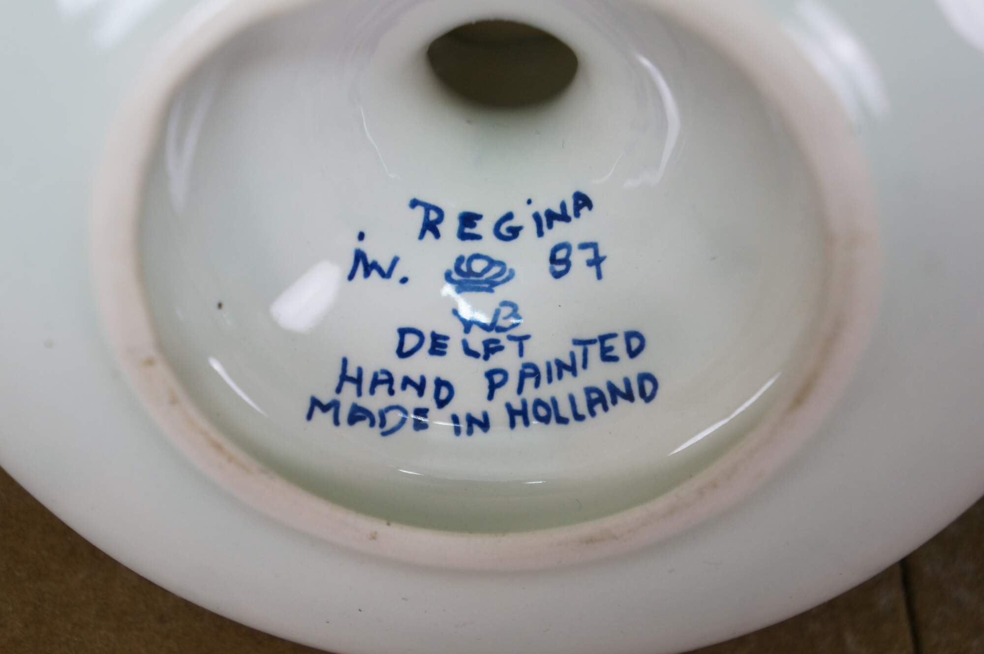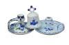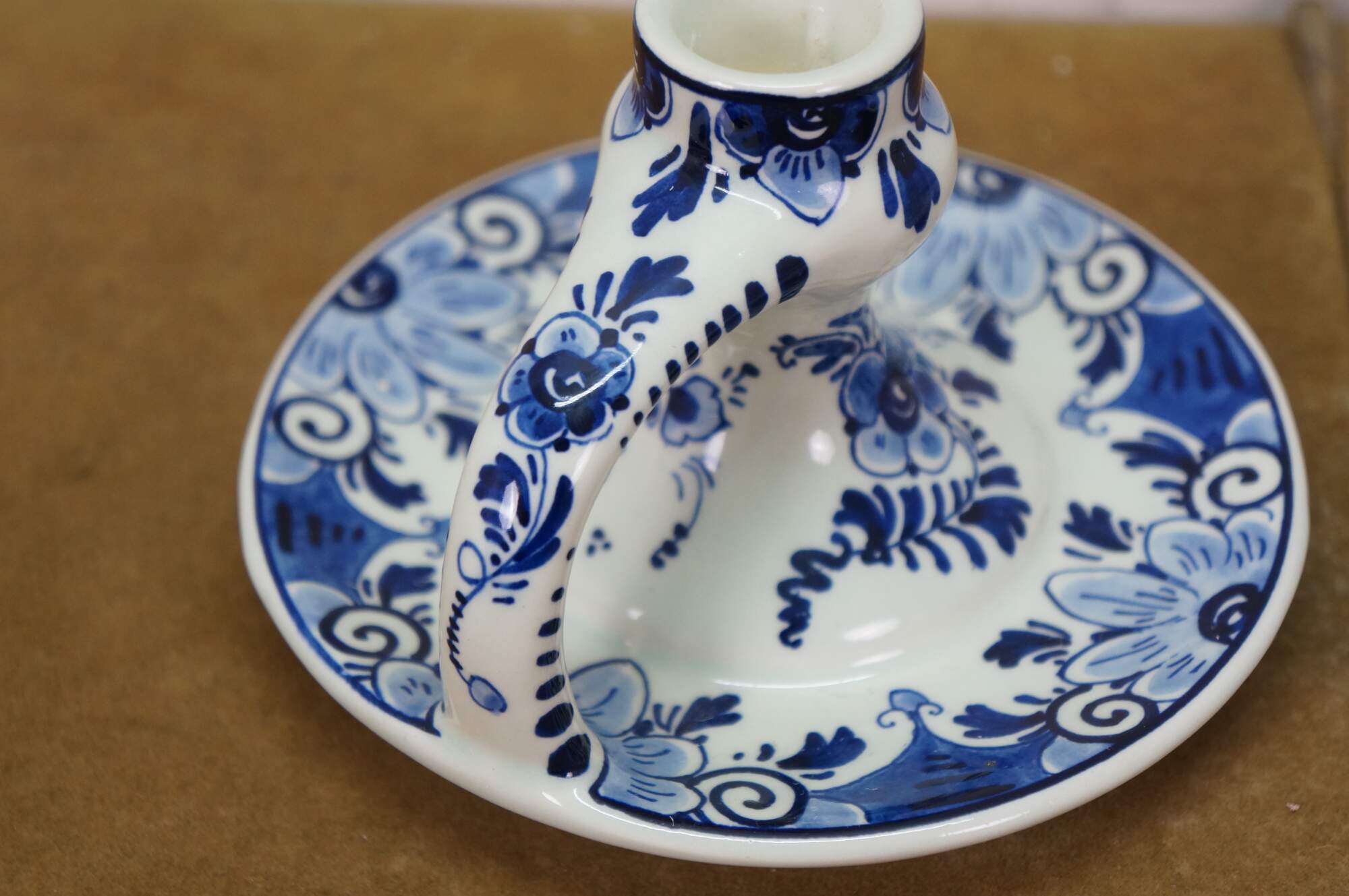 Vintage Dutch Holland Delft farmhouse wares. Includes two chamberstick candle holders and one butler valet service bell with windmill. Regina Blauw 1987, Schoonhaven 5126, Royal G Delfts 1549.