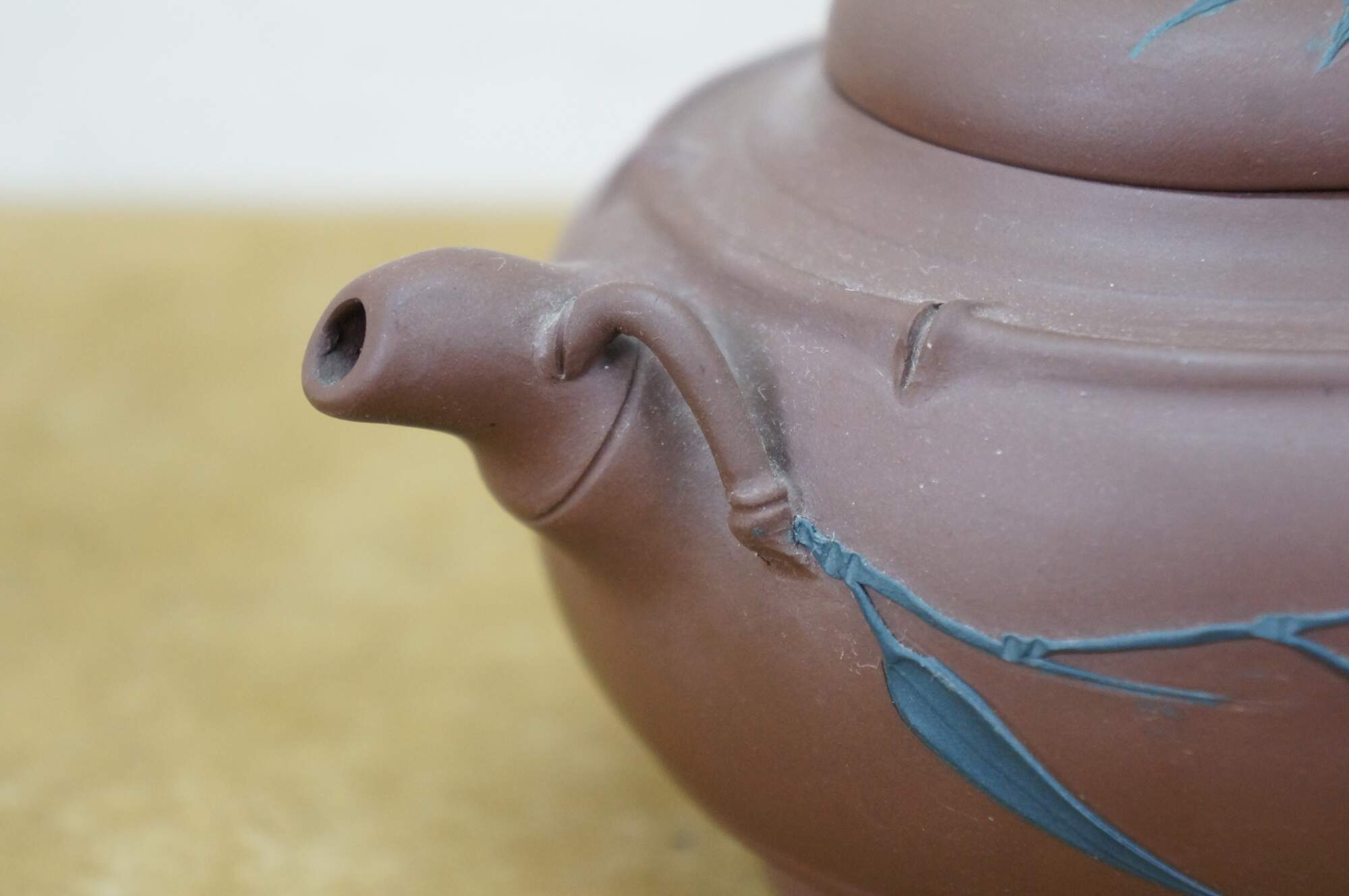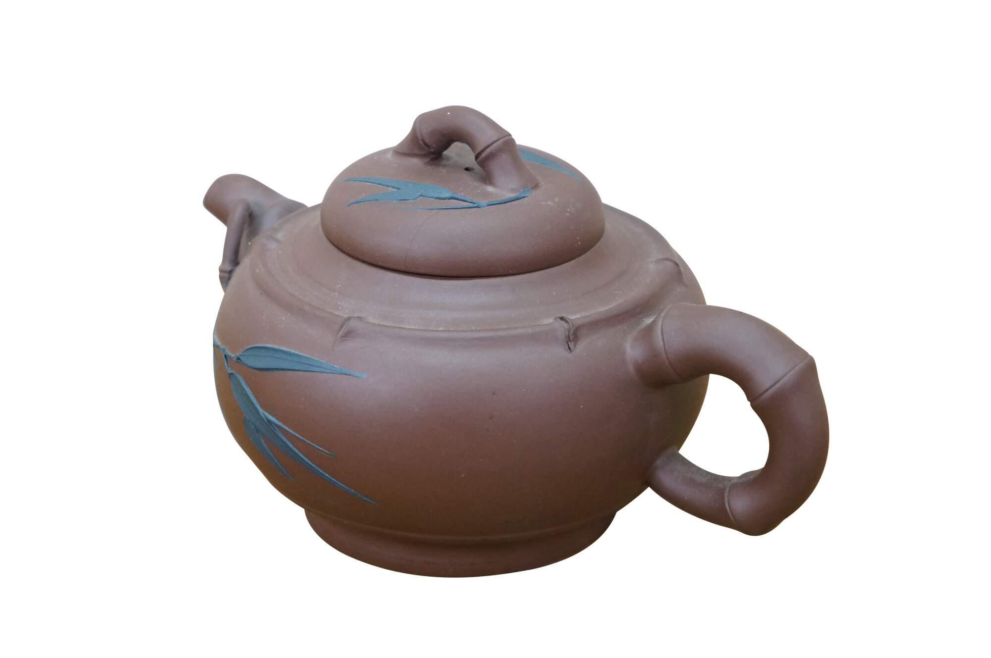 Vintage Chinese Yixing clay tea / coffee pot with a bamboo leaf motif. It is made from purple clay (zisha), a type of unglazed, porous earthenware from the Yixing region of China. The handle and spout are shaped like bamboo branches, and there are carved/applied blue bamboo leaves on the body and lid.