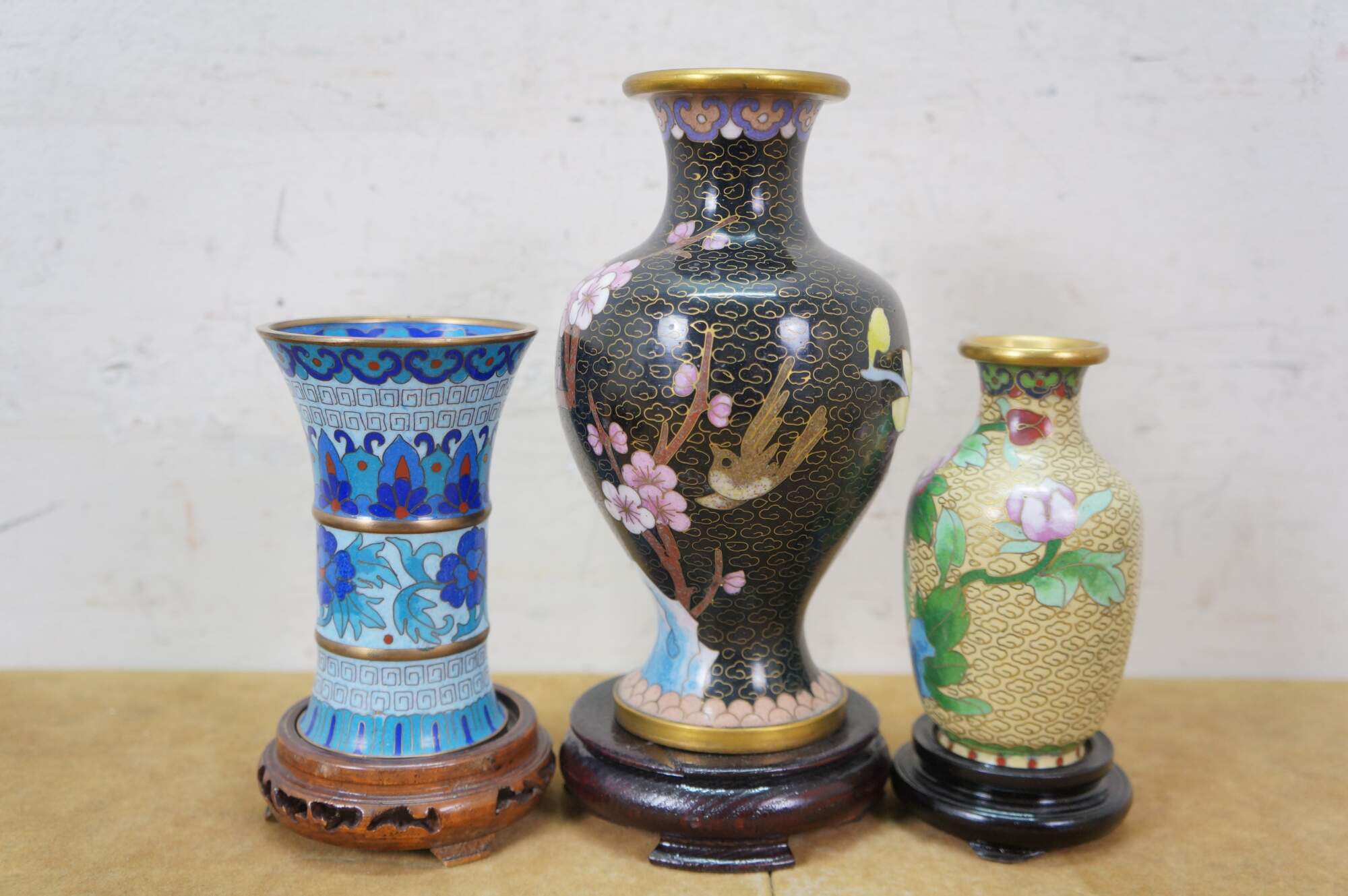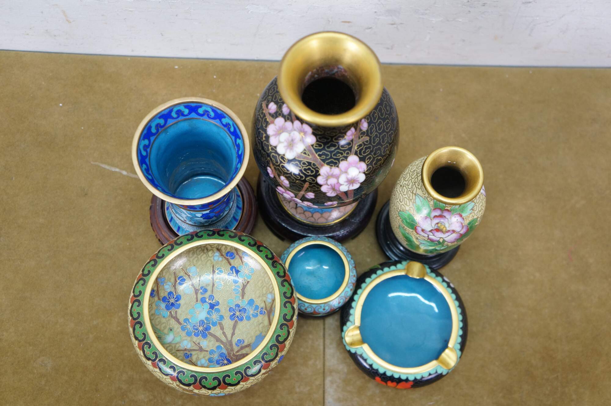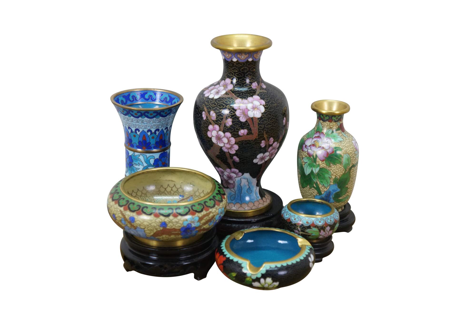 Six vintage Chinese cloisonné enamel vases, bowls / ashtrays, and vases featuring a variety of style and patterns, including cherry blossoms, chrysanthemums, peonies, and birds. Each piece includes a base.