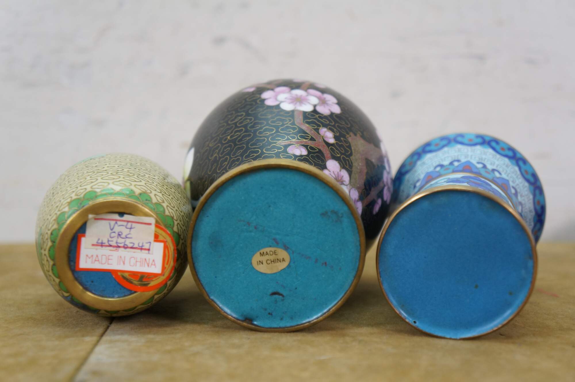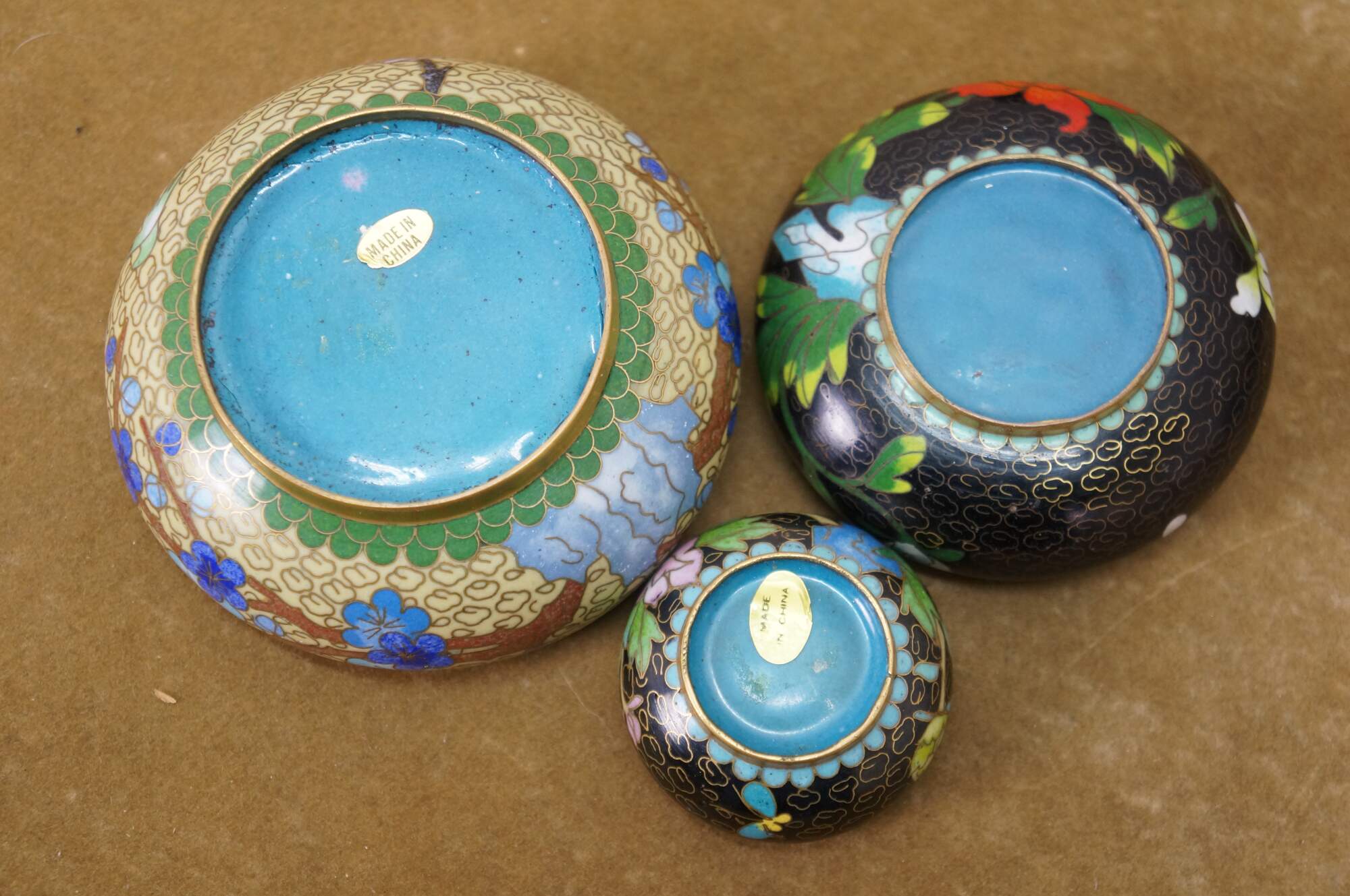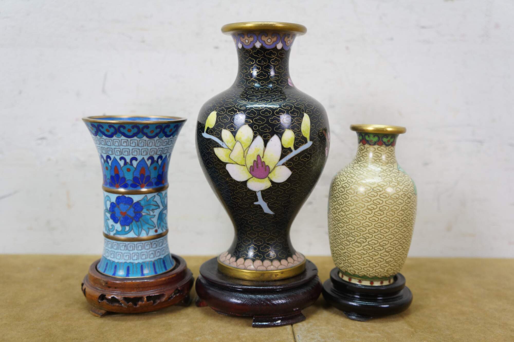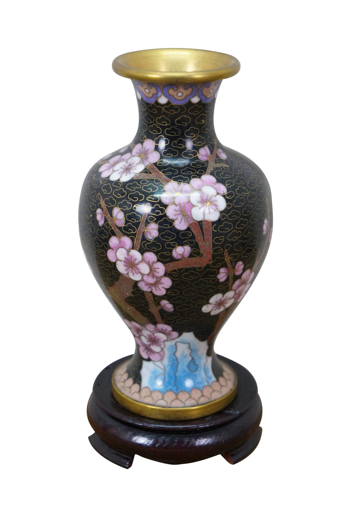Six vintage Chinese cloisonné enamel vases, bowls / ashtrays, and vases featuring a variety of style and patterns, including cherry blossoms, chrysanthemums, peonies, and birds. Each piece includes a base.