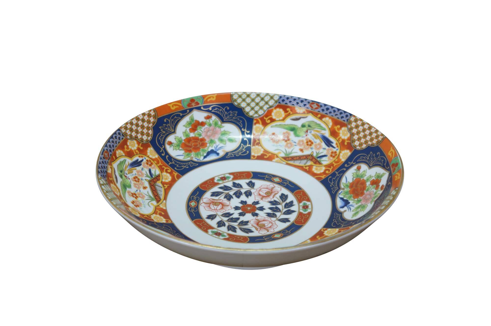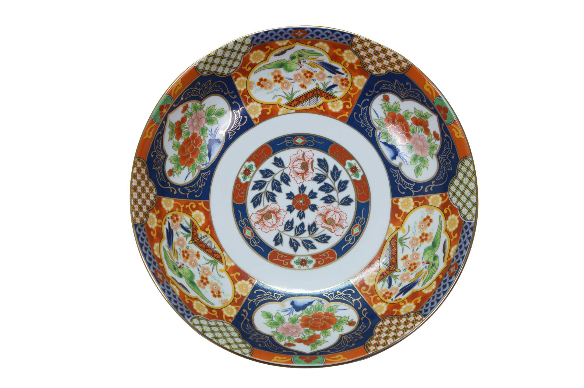 Large vintage Japanese Imari porcelain bowl featuring a traditional Imari color palette of cobalt blue, vibrant red-orange, green, and rich gold accents including a central floral medallion surrounded by panels with alternating floral and mystical bird motifs.