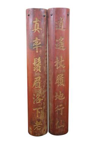 Beautiful pair of antique Chinese wooden couplet wall plaques dating to the late Qing Dynasty. Hand-carved with traditional Chinese gold calligraphy and red lacquer, these panels were a birthday gift given by a person named Tingjing Zhang 張廷