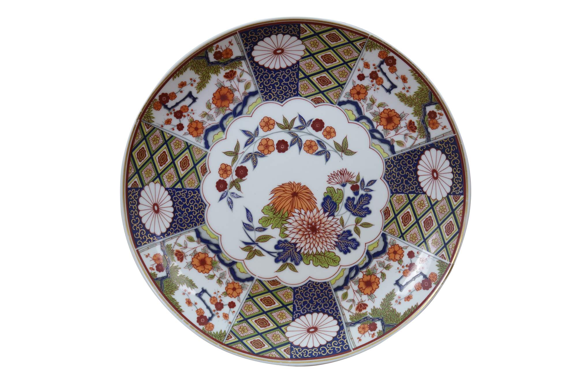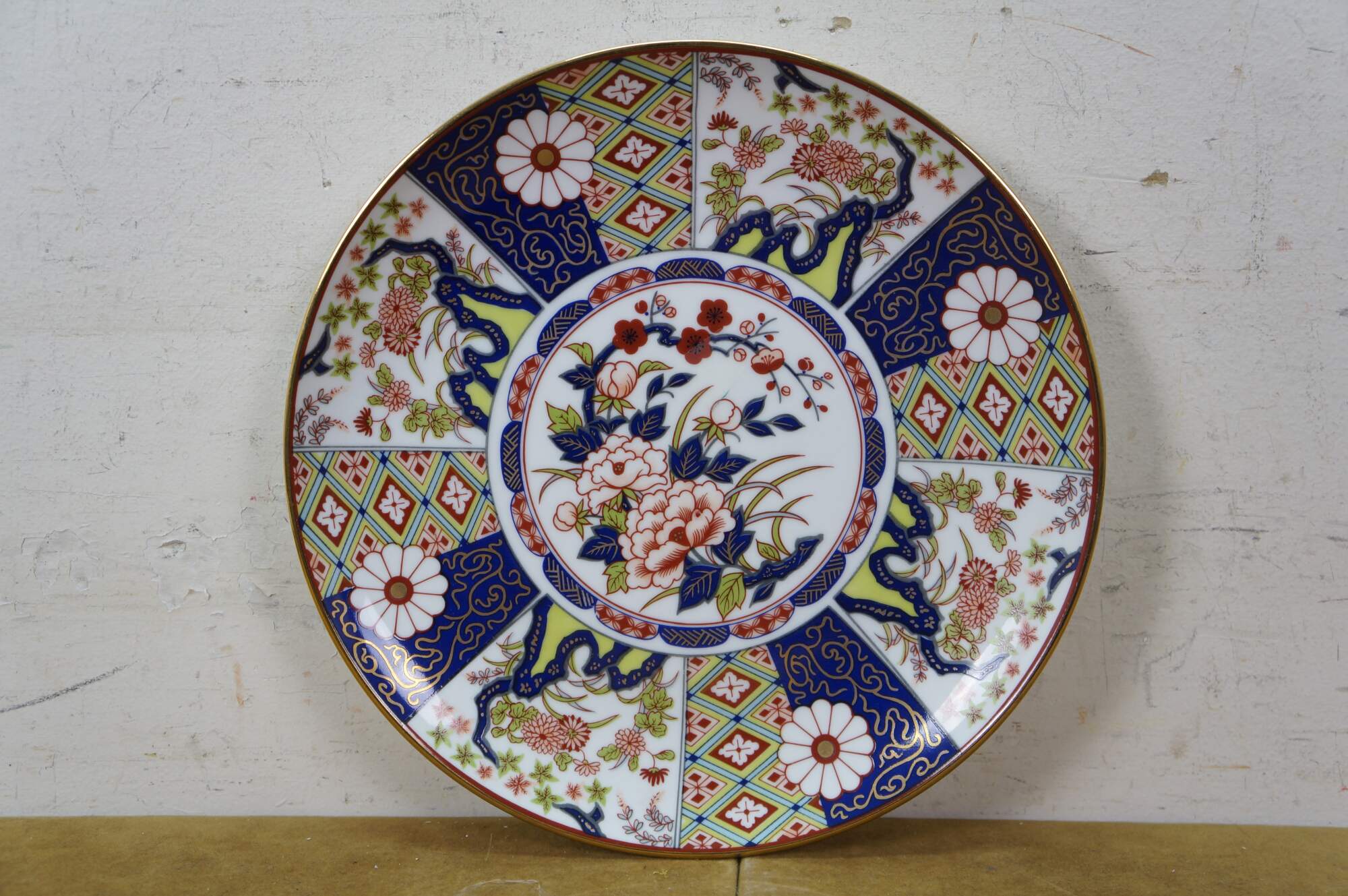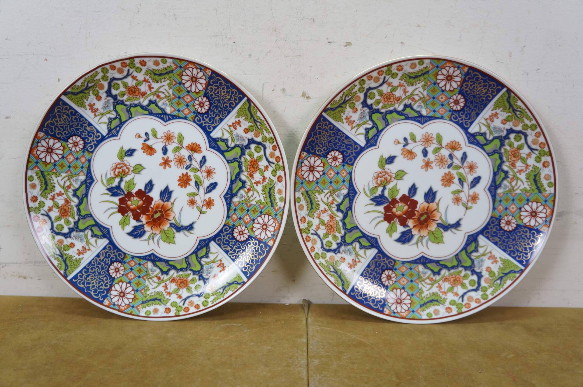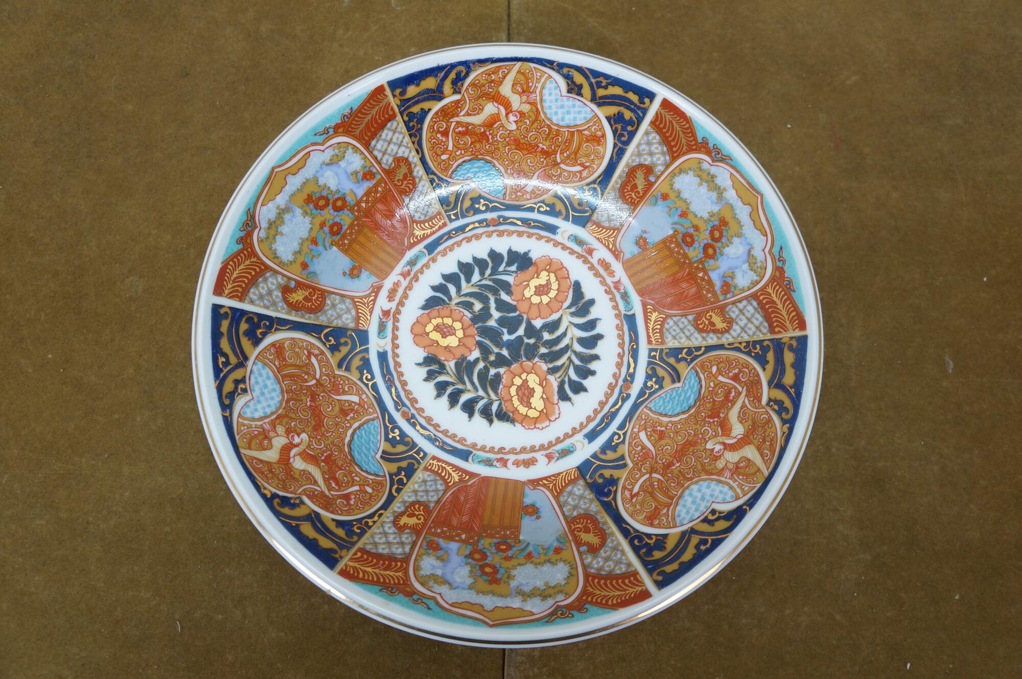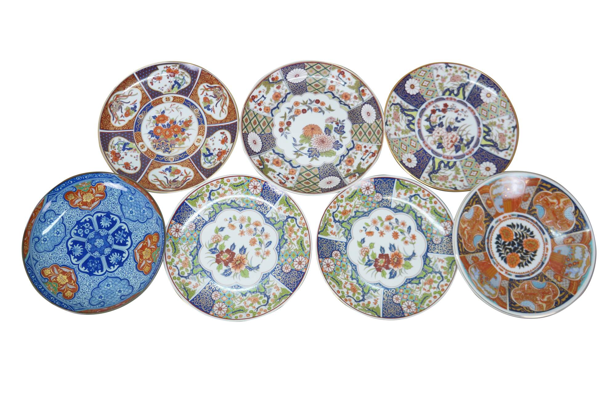 Seven vintage Japanese Imari porcelain plates / plaques featuring a variety of traditional designs. The plates mostly feature elaborate Empress patterns with floral / garden motifs of Chrysanthemums and Peonies. One plate features a central medallion with a cart and flowers, surrounded by six paneled reserves with alternating designs of phoenix birds and floral motifs. Makers include Toyo, Andrea by Sadek, and OMC Otagiri Mercantile.
