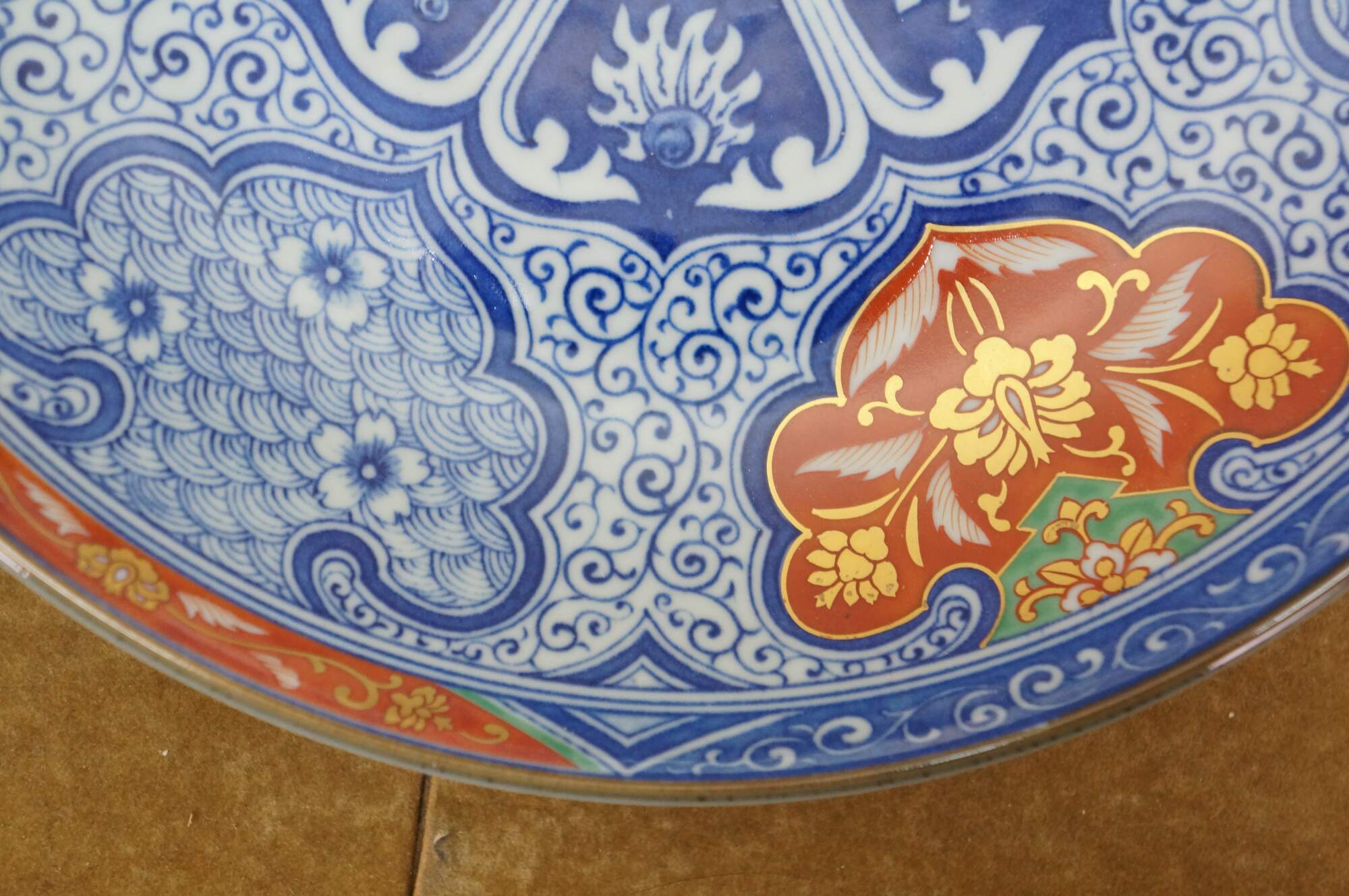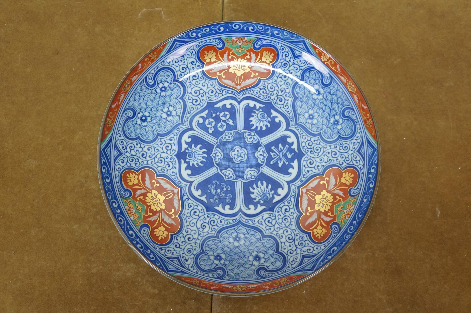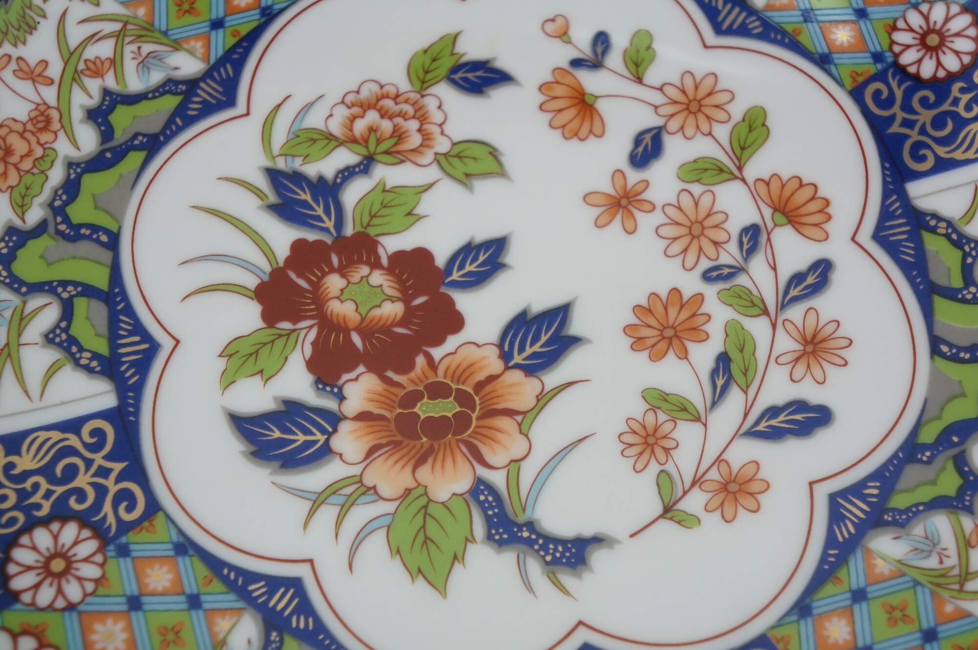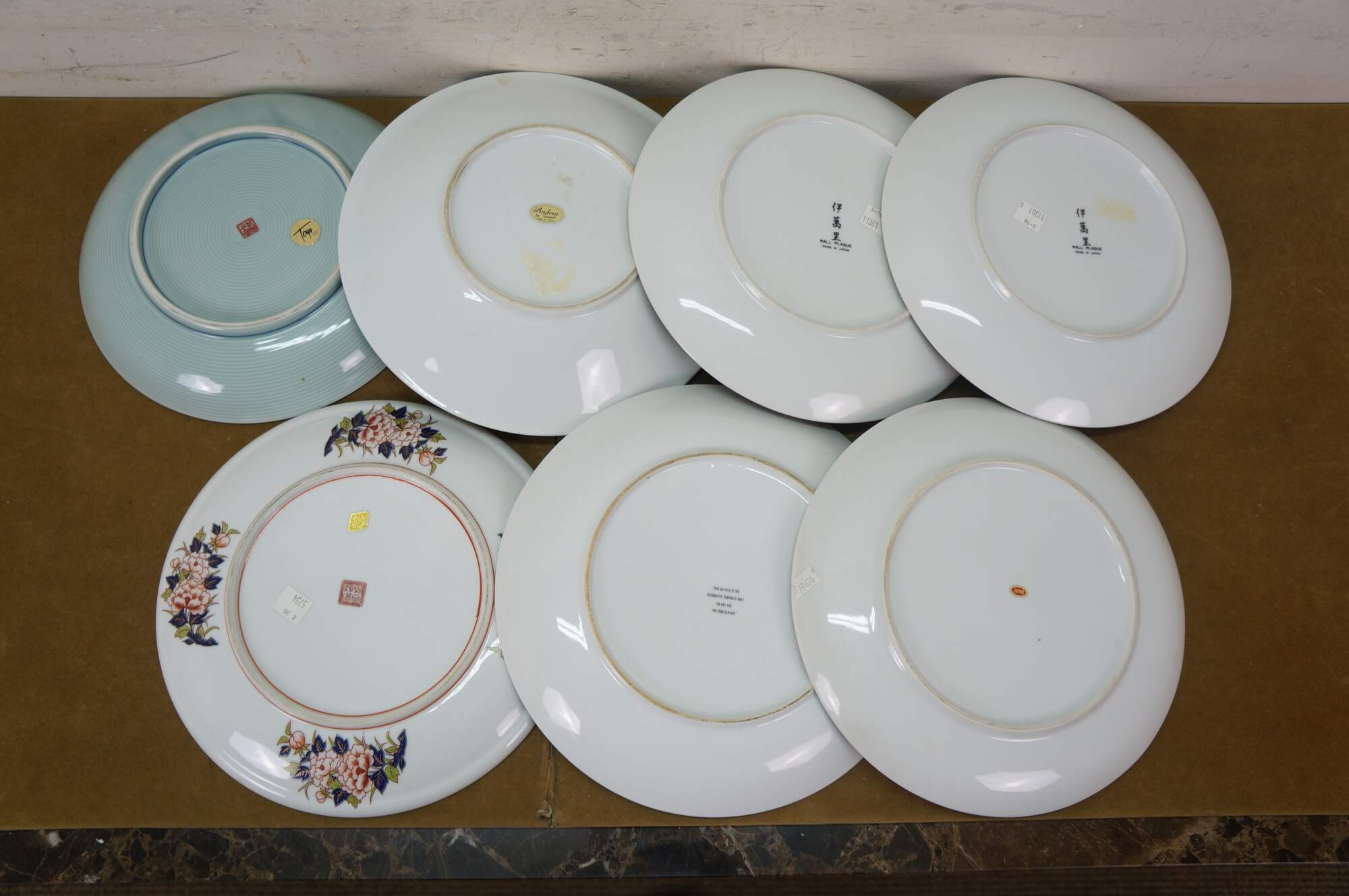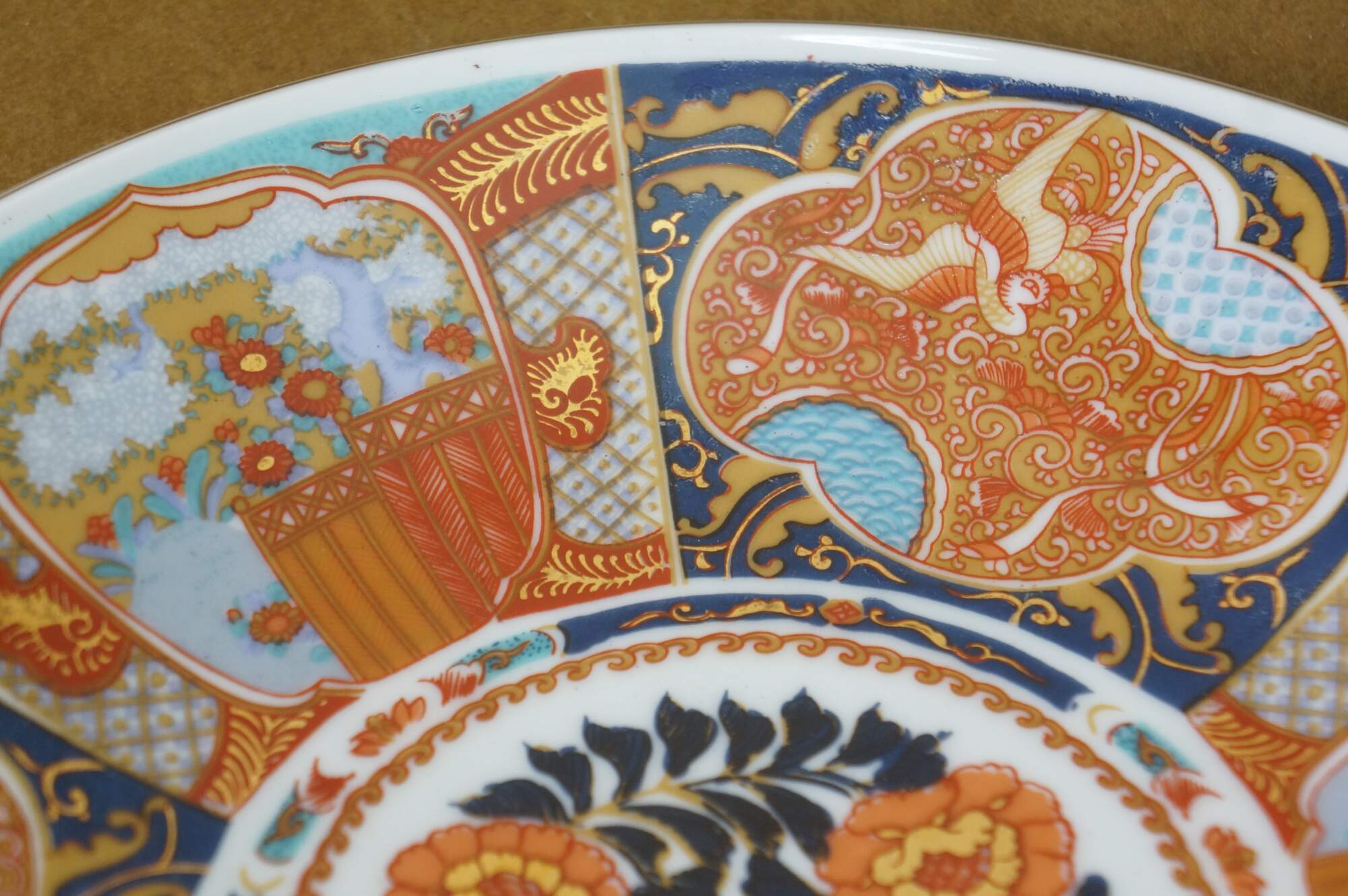 Seven vintage Japanese Imari porcelain plates / plaques featuring a variety of traditional designs. The plates mostly feature elaborate Empress patterns with floral / garden motifs of Chrysanthemums and Peonies. One plate features a central medallion with a cart and flowers, surrounded by six paneled reserves with alternating designs of phoenix birds and floral motifs. Makers include Toyo, Andrea by Sadek, and OMC Otagiri Mercantile.