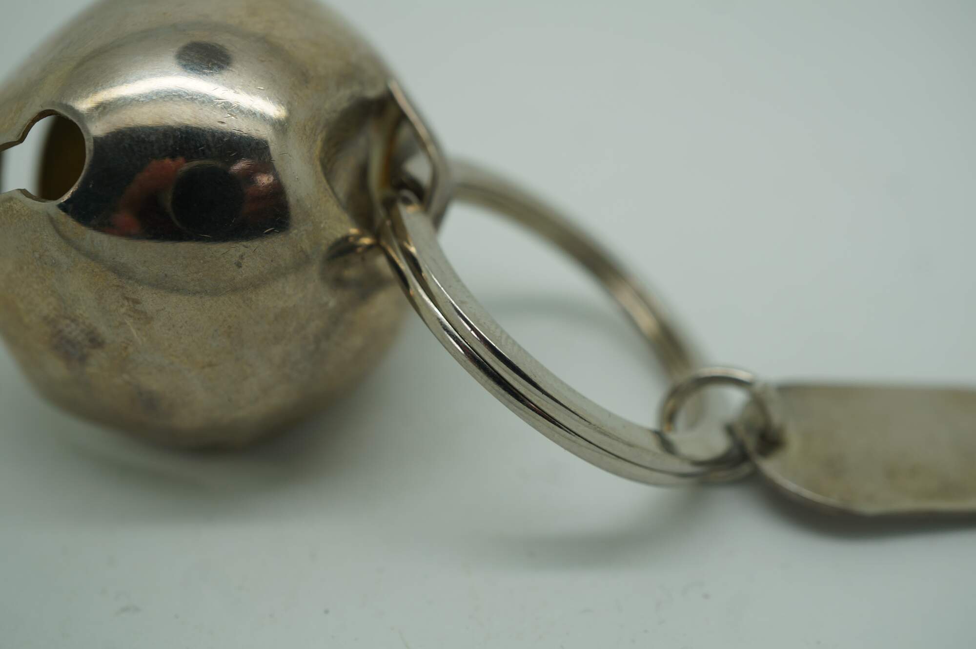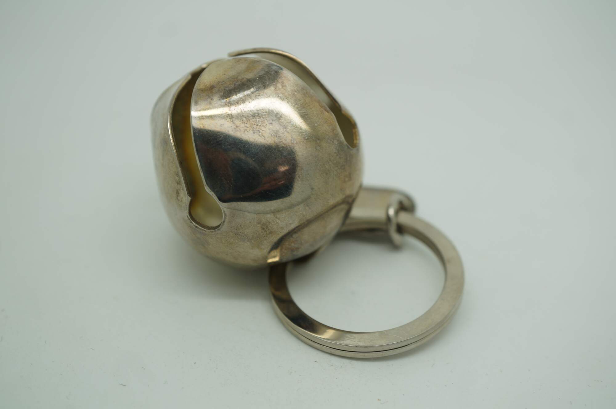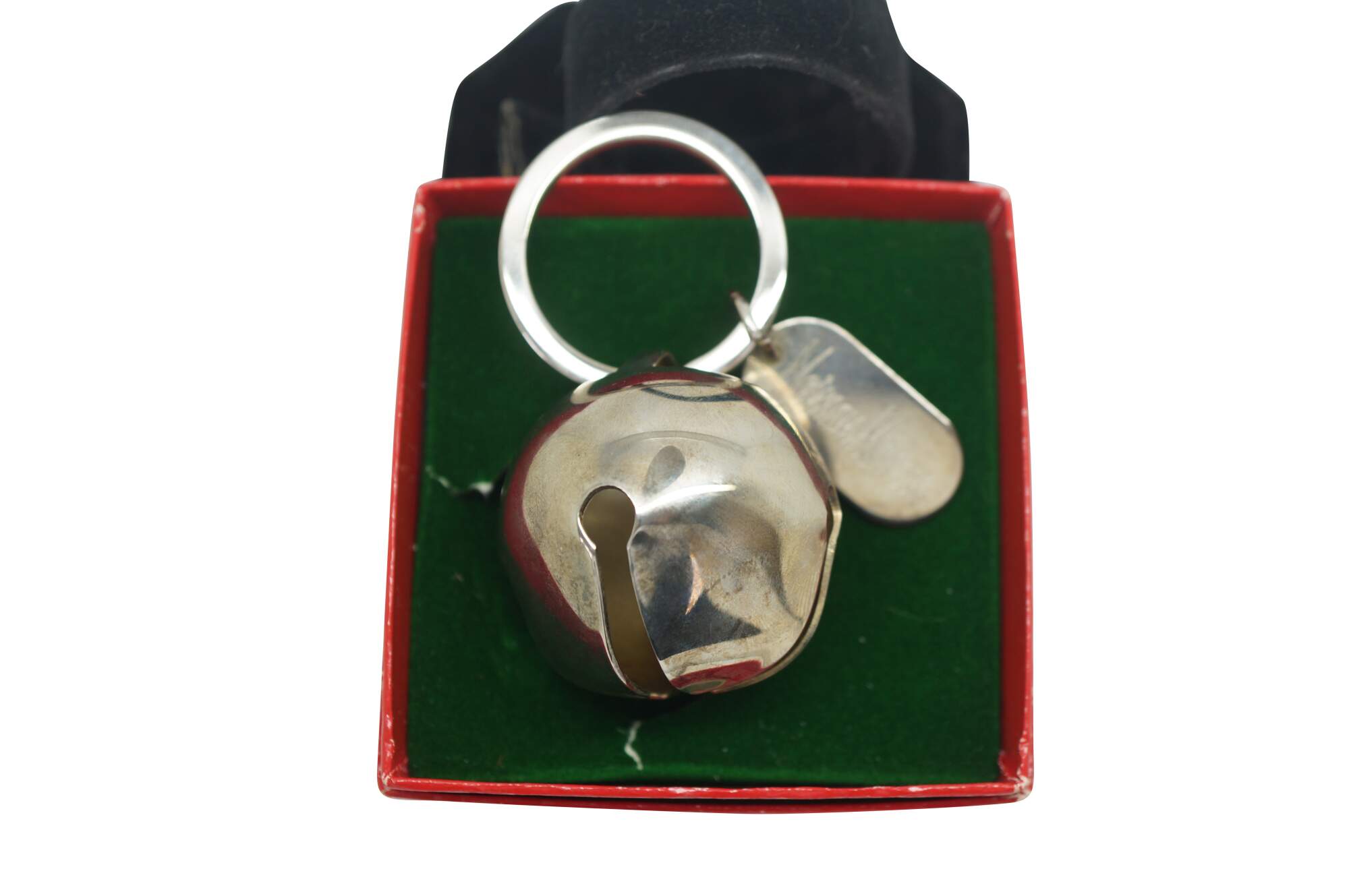 Vintage Neiman Marcus silver plate bell keyring key chain that features a large, functioning jingle bell attached to a keyring in a festive Christmas box.