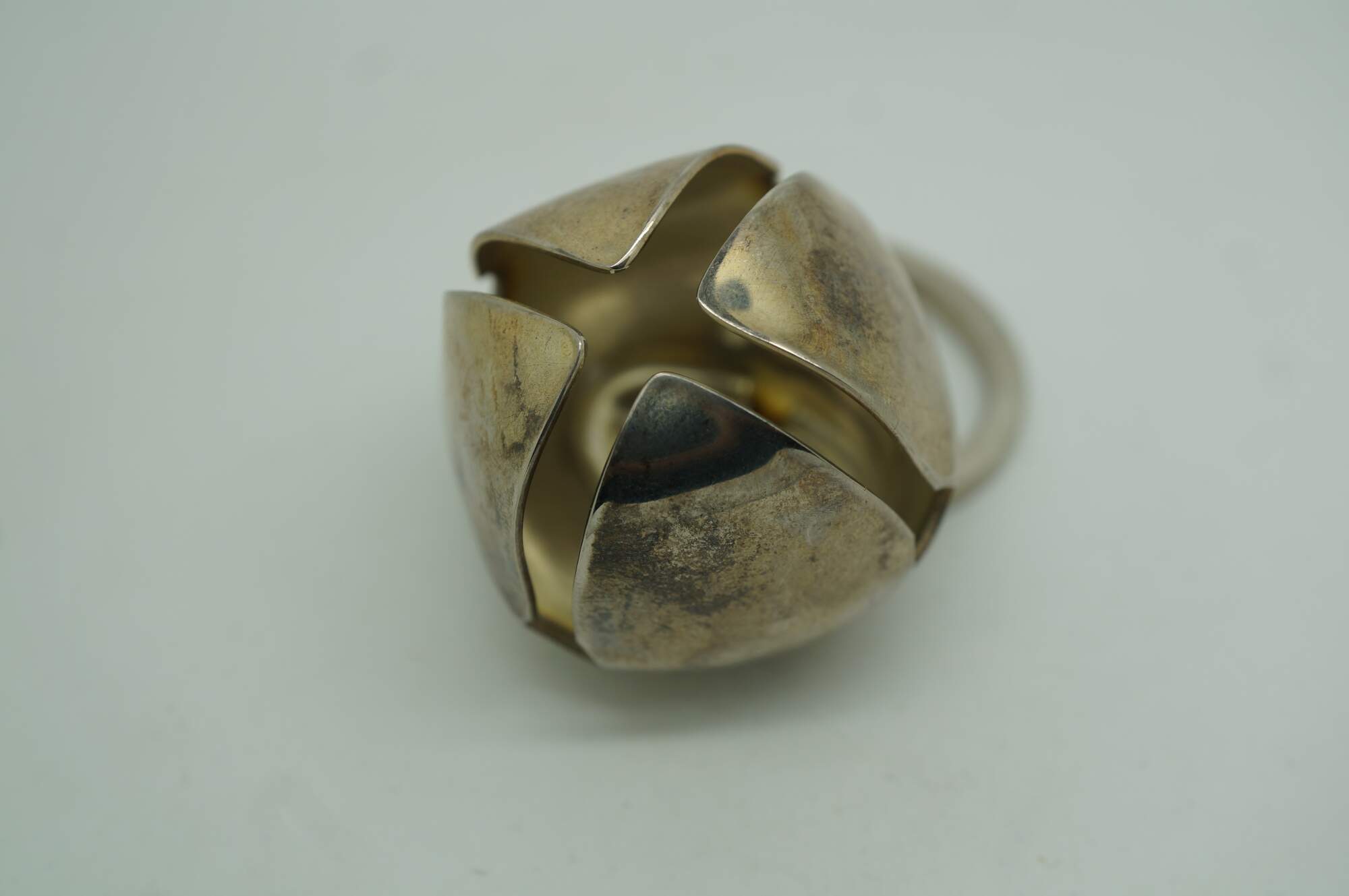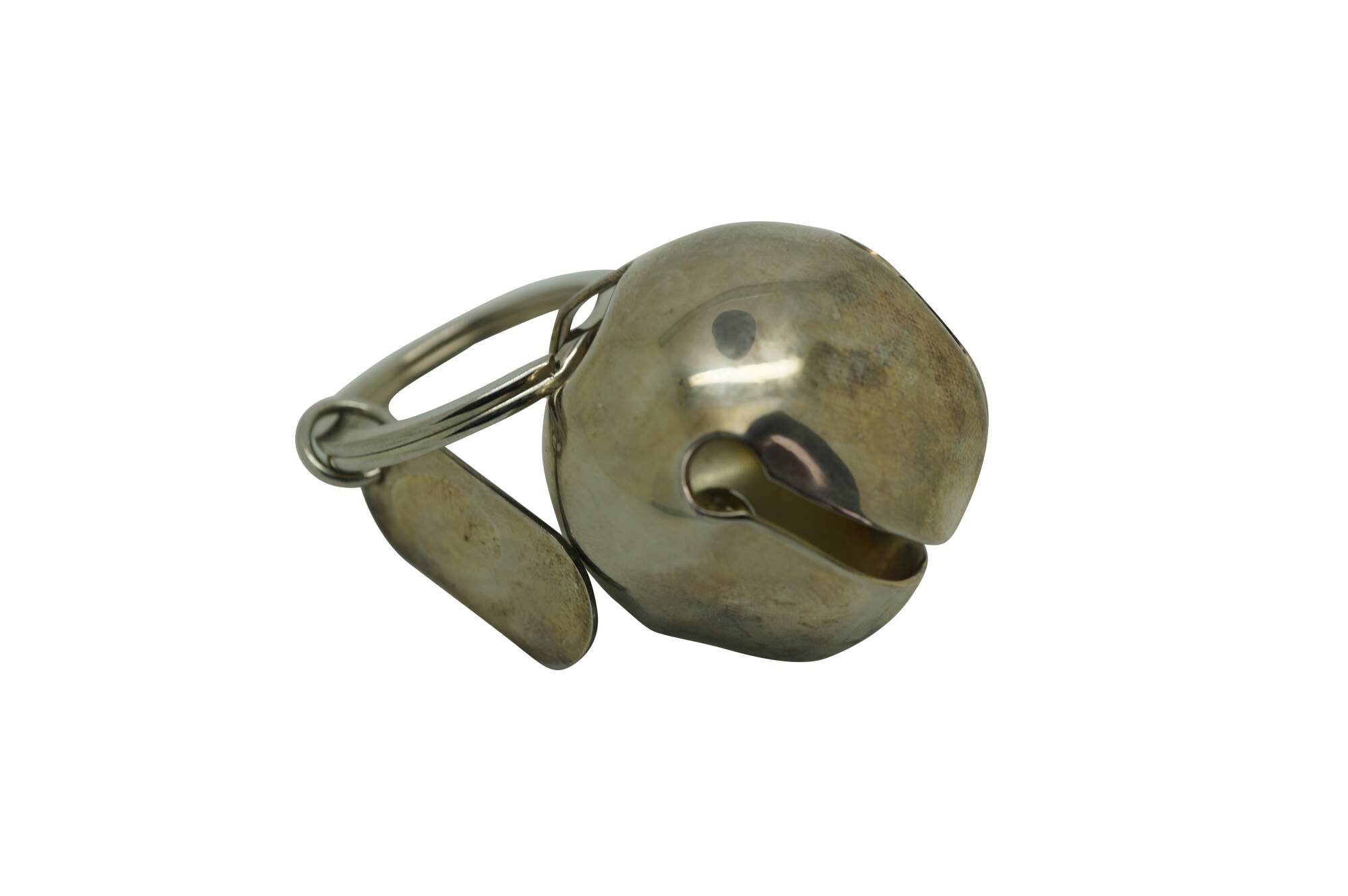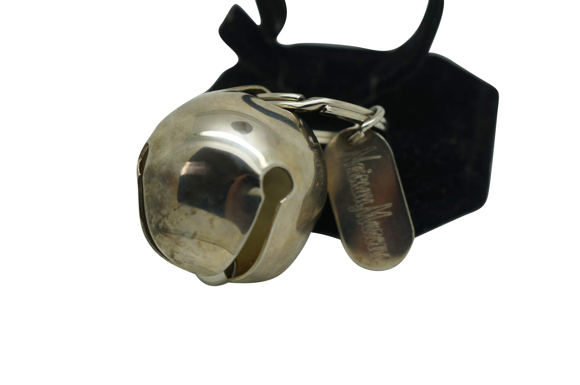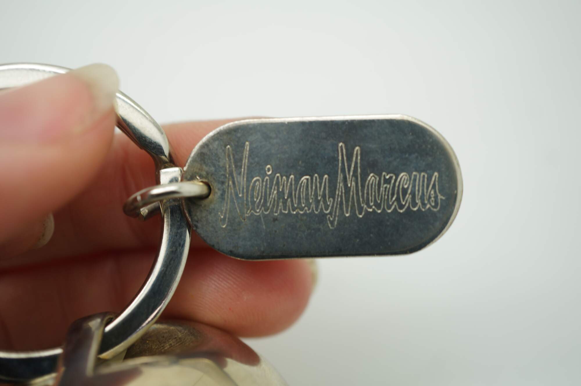 Vintage Neiman Marcus silver plate bell keyring key chain that features a large, functioning jingle bell attached to a keyring in a festive Christmas box.