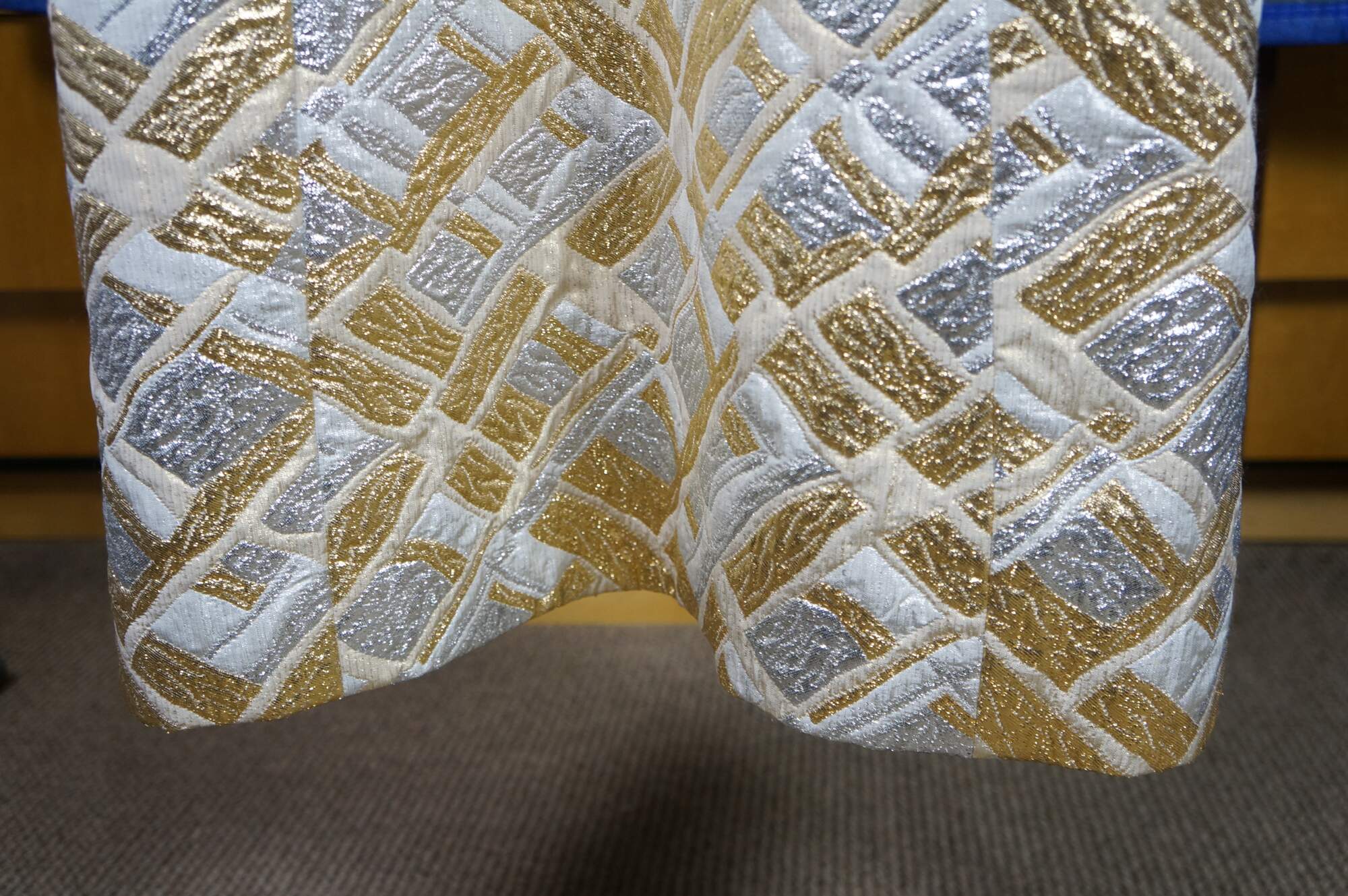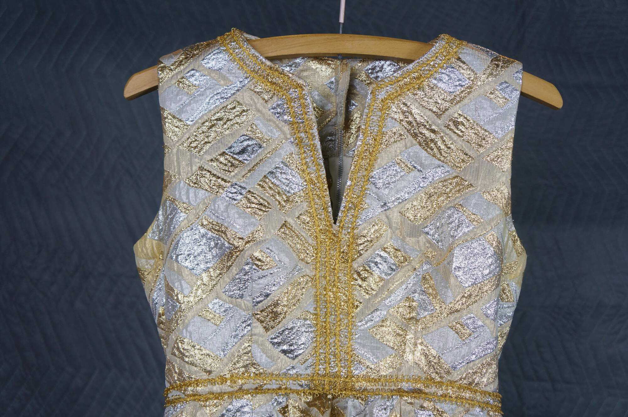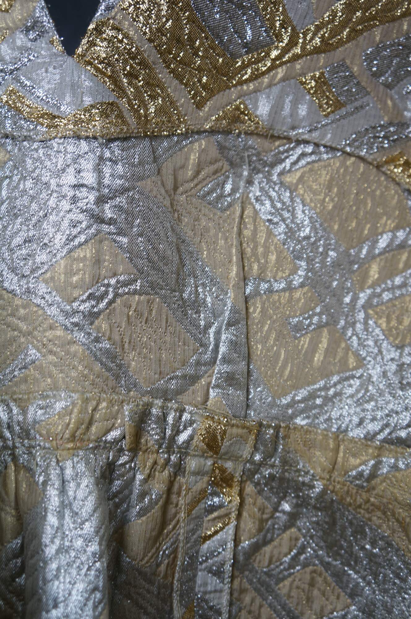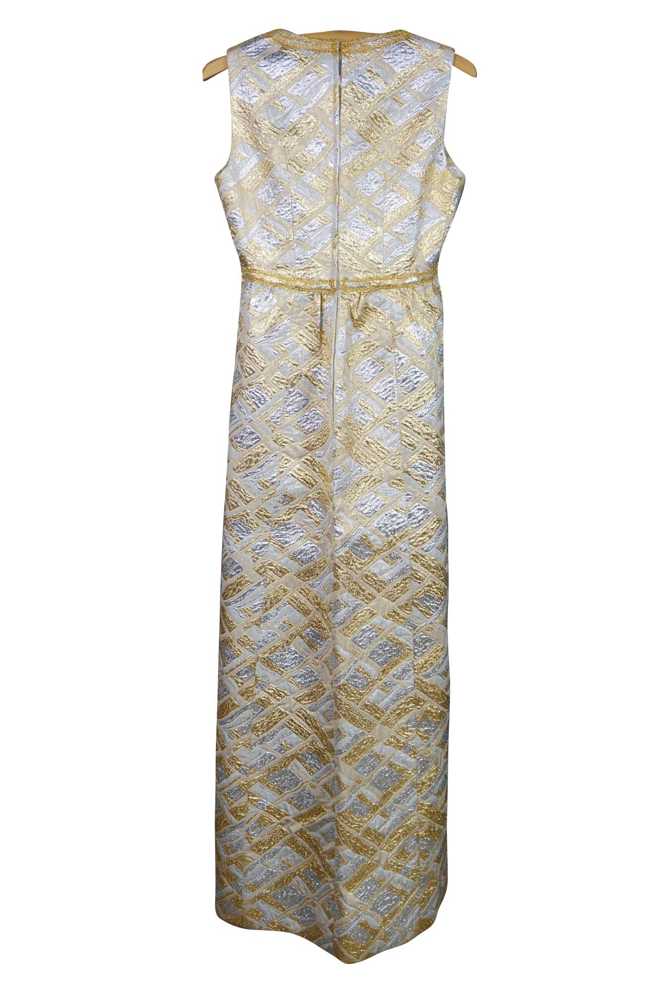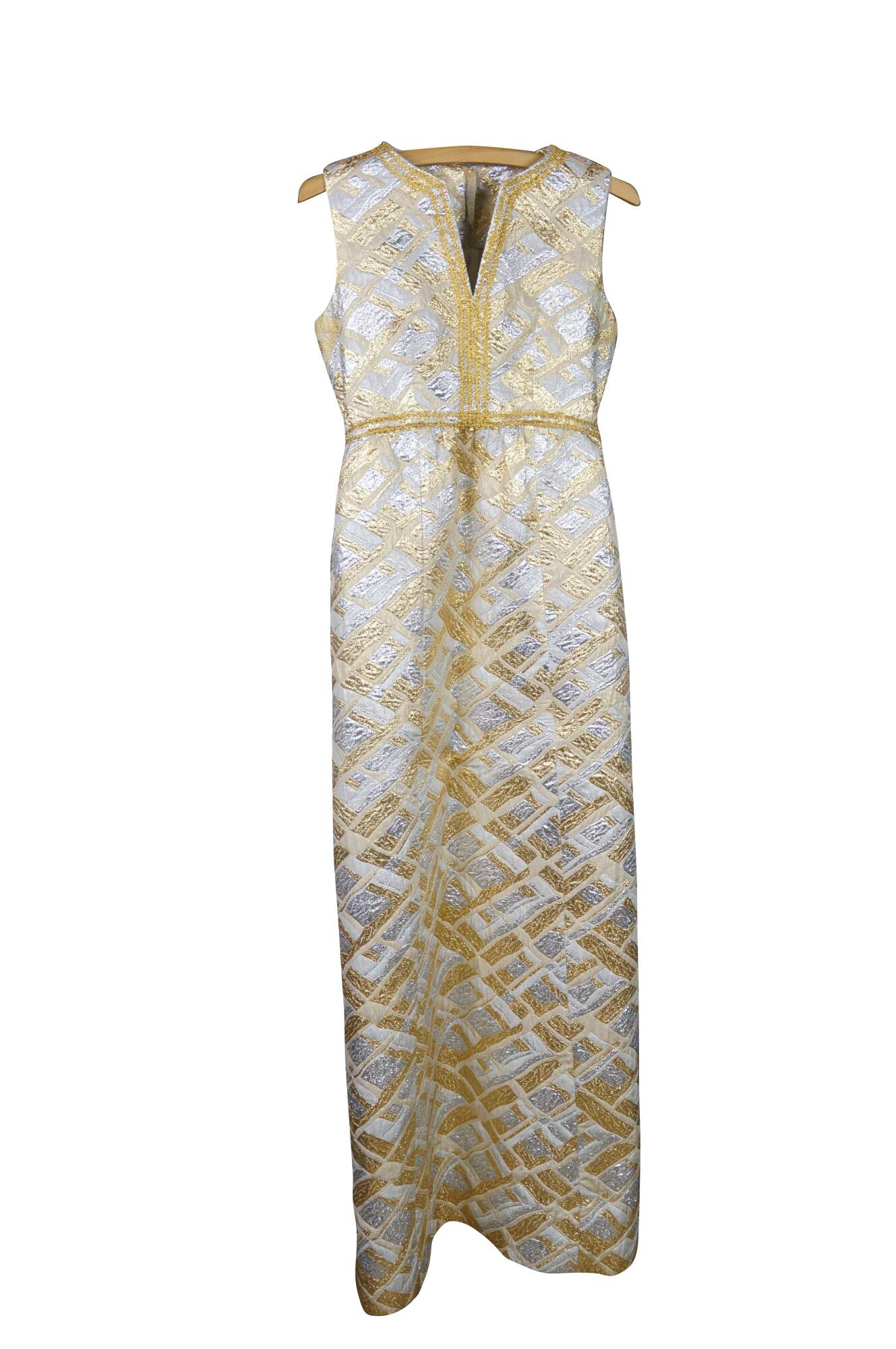 Vintage sleeveless 1960s gold and silver brocade maxi dress featuring an abstract geometric pattern and V-neckline.