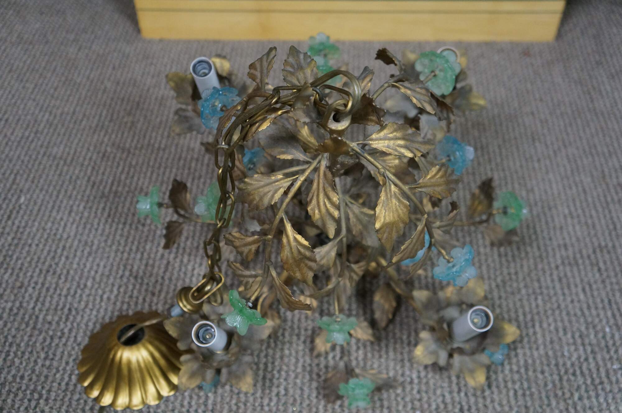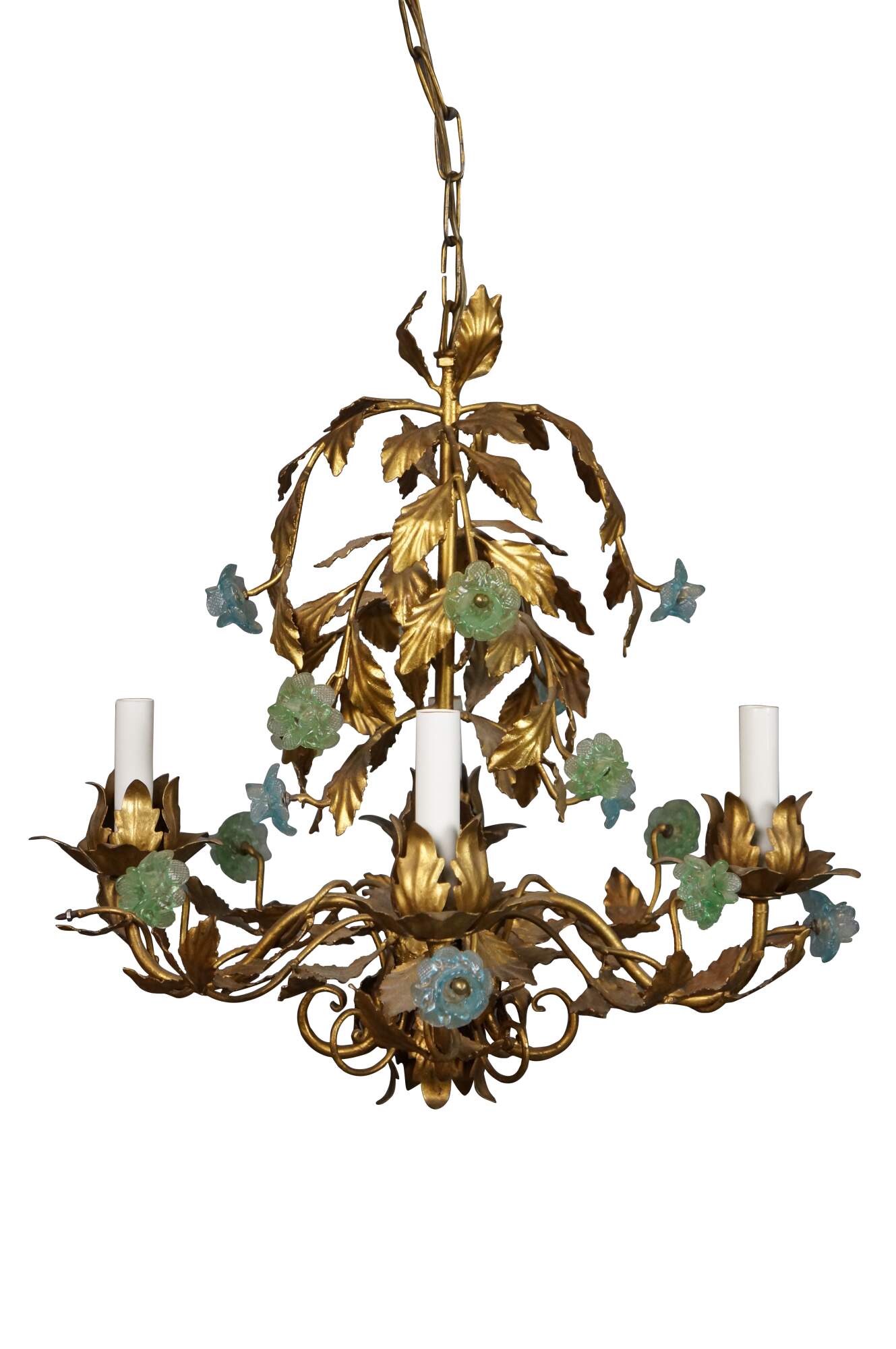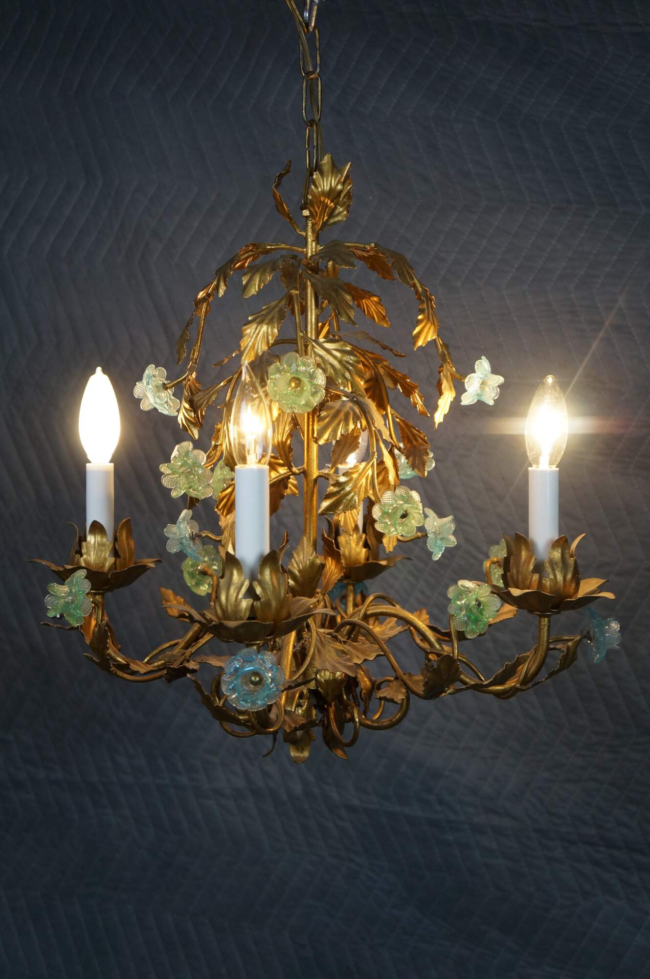 Vintage Italian Hollywood Regency Venetian Florentine Murano glass chandelier featuring gilt gold painted leaves, blue and green rosettes, and four candlestick lights. Circa 1970s.
