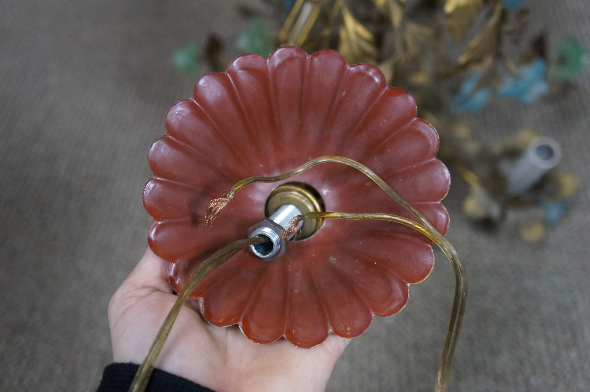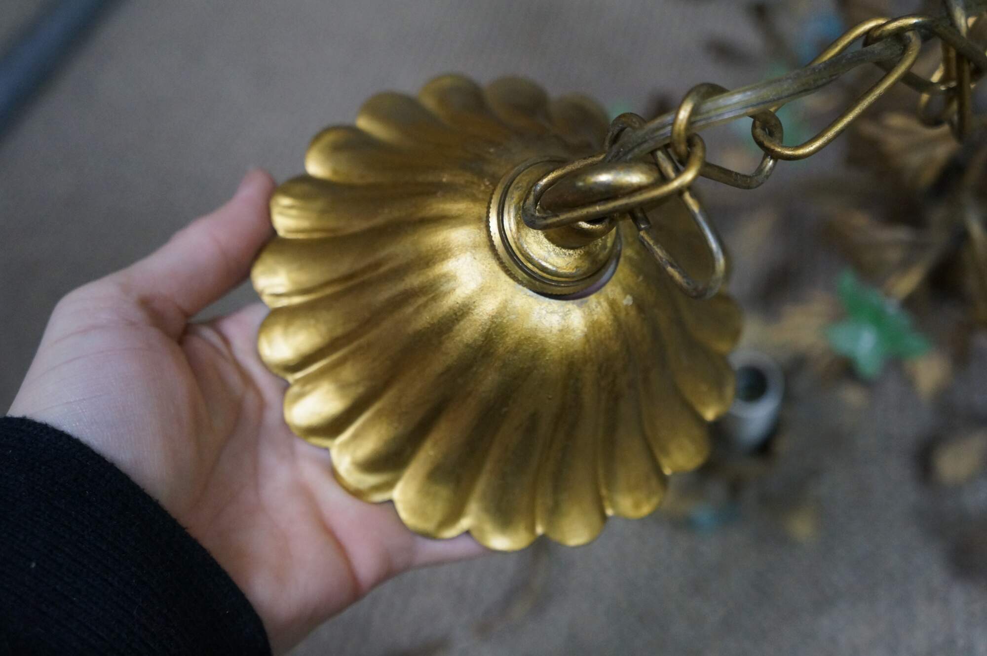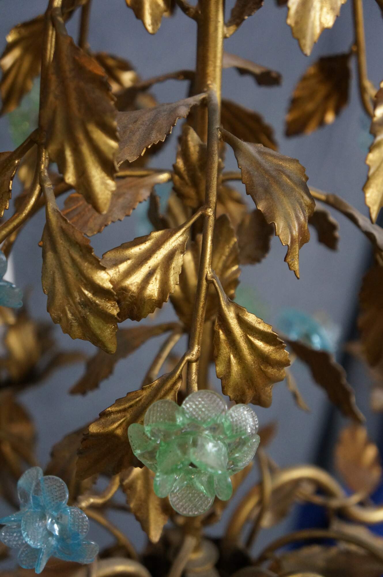 Vintage Italian Hollywood Regency Venetian Florentine Murano glass chandelier featuring gilt gold painted leaves, blue and green rosettes, and four candlestick lights. Circa 1970s.
