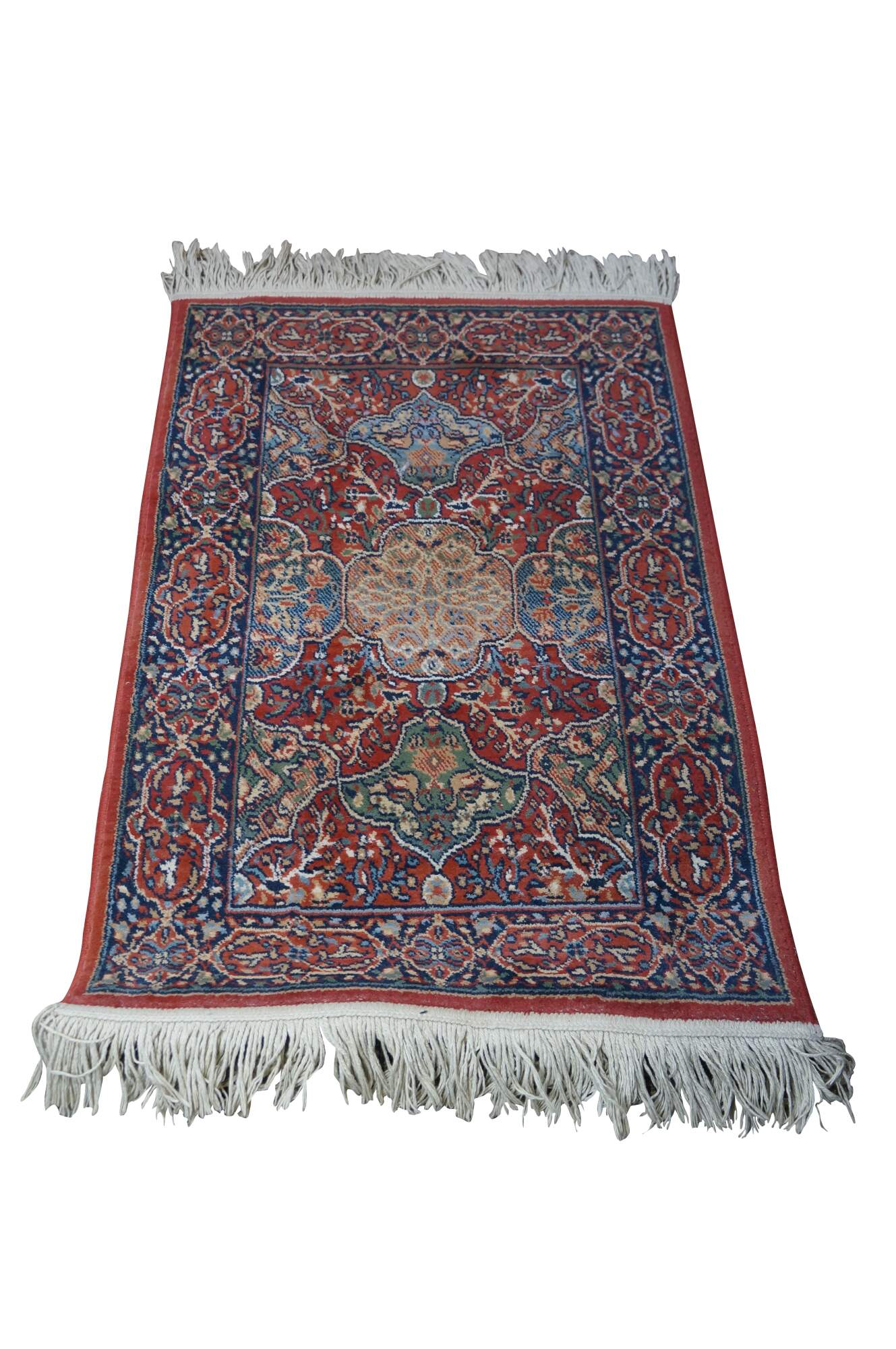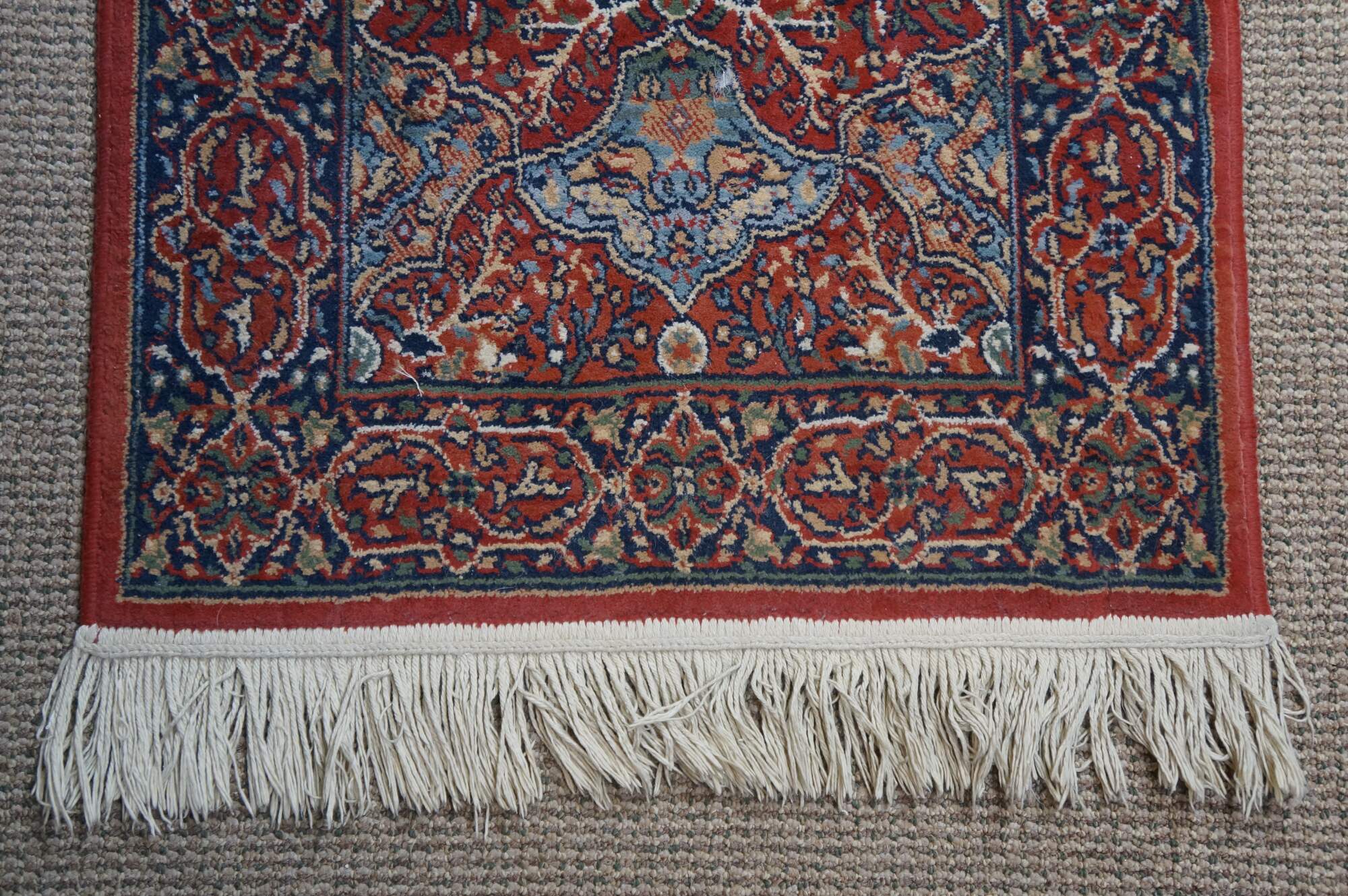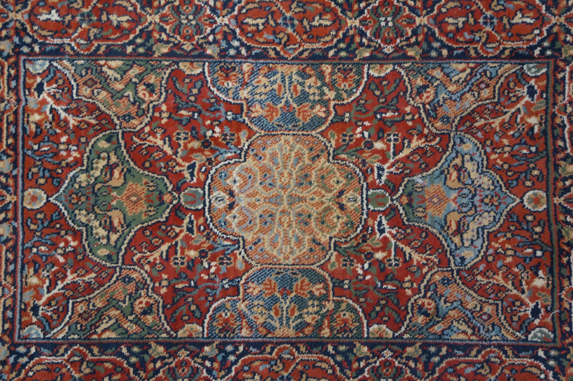Vintage Belgian synthetic rug runner featuring a abstract floral medallion pattern in red, green, beige, and blue.