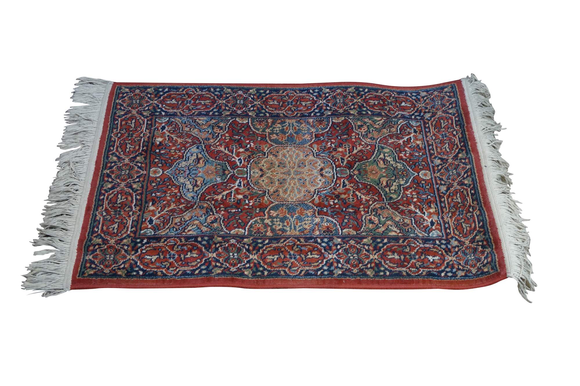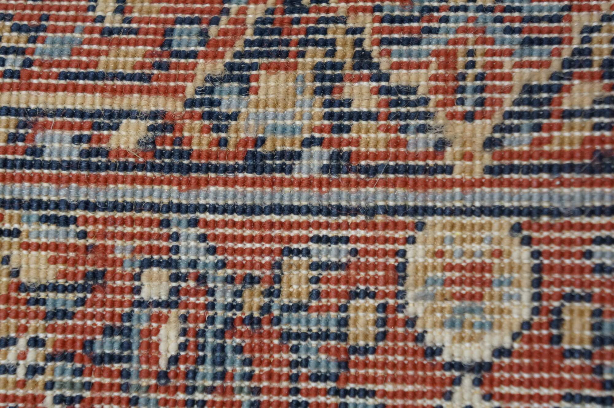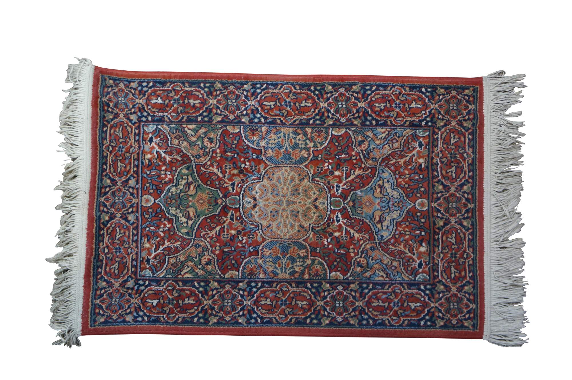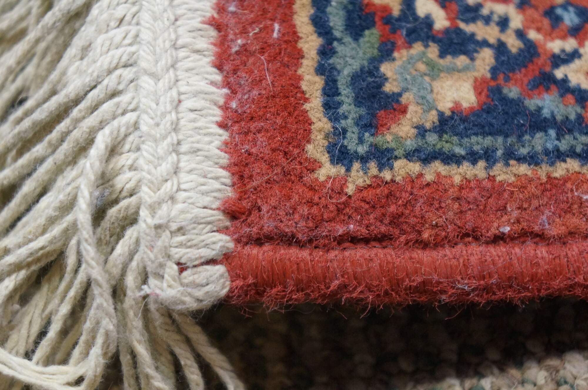 Vintage Belgian synthetic rug runner featuring a abstract floral medallion pattern in red, green, beige, and blue.