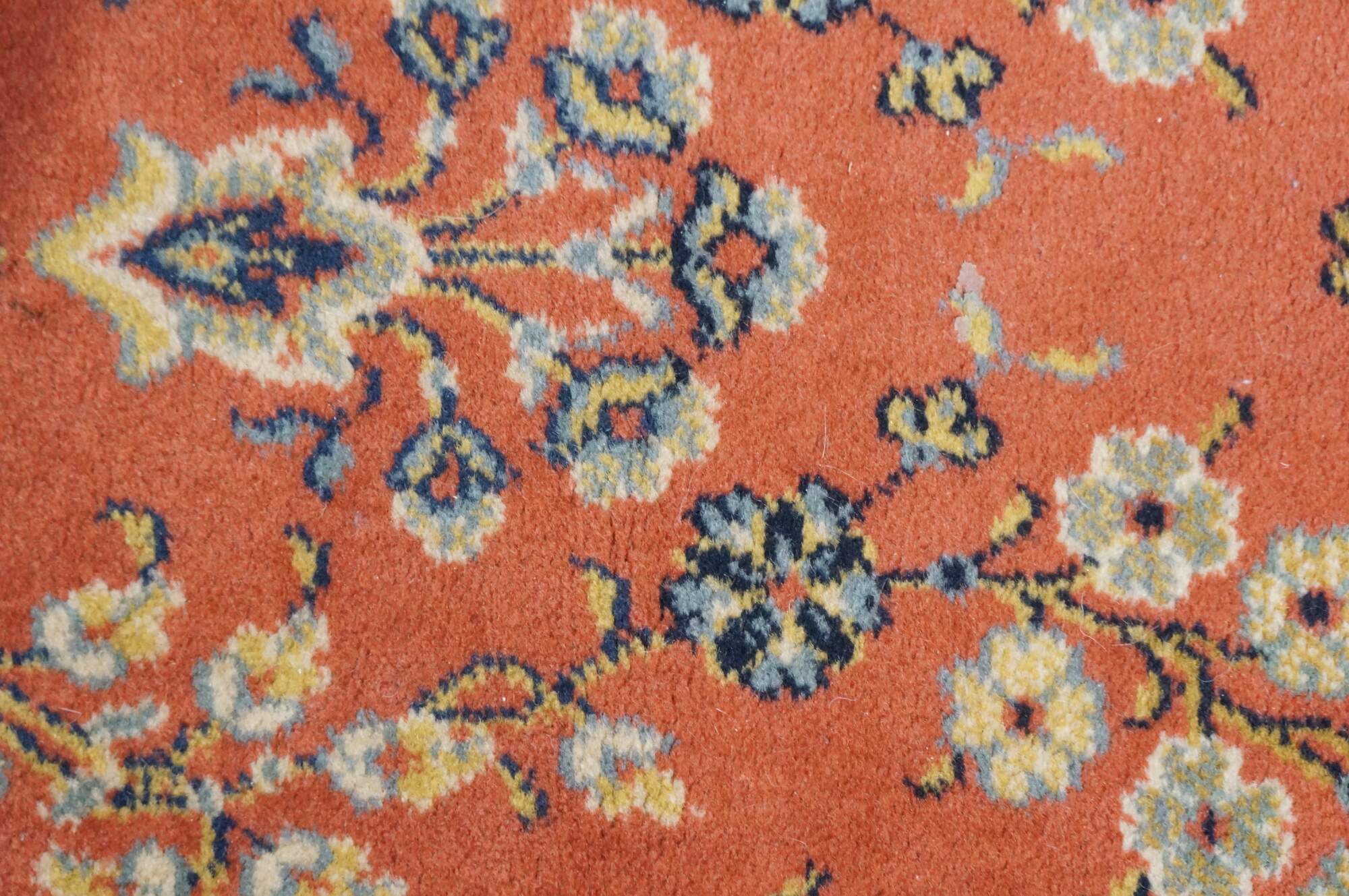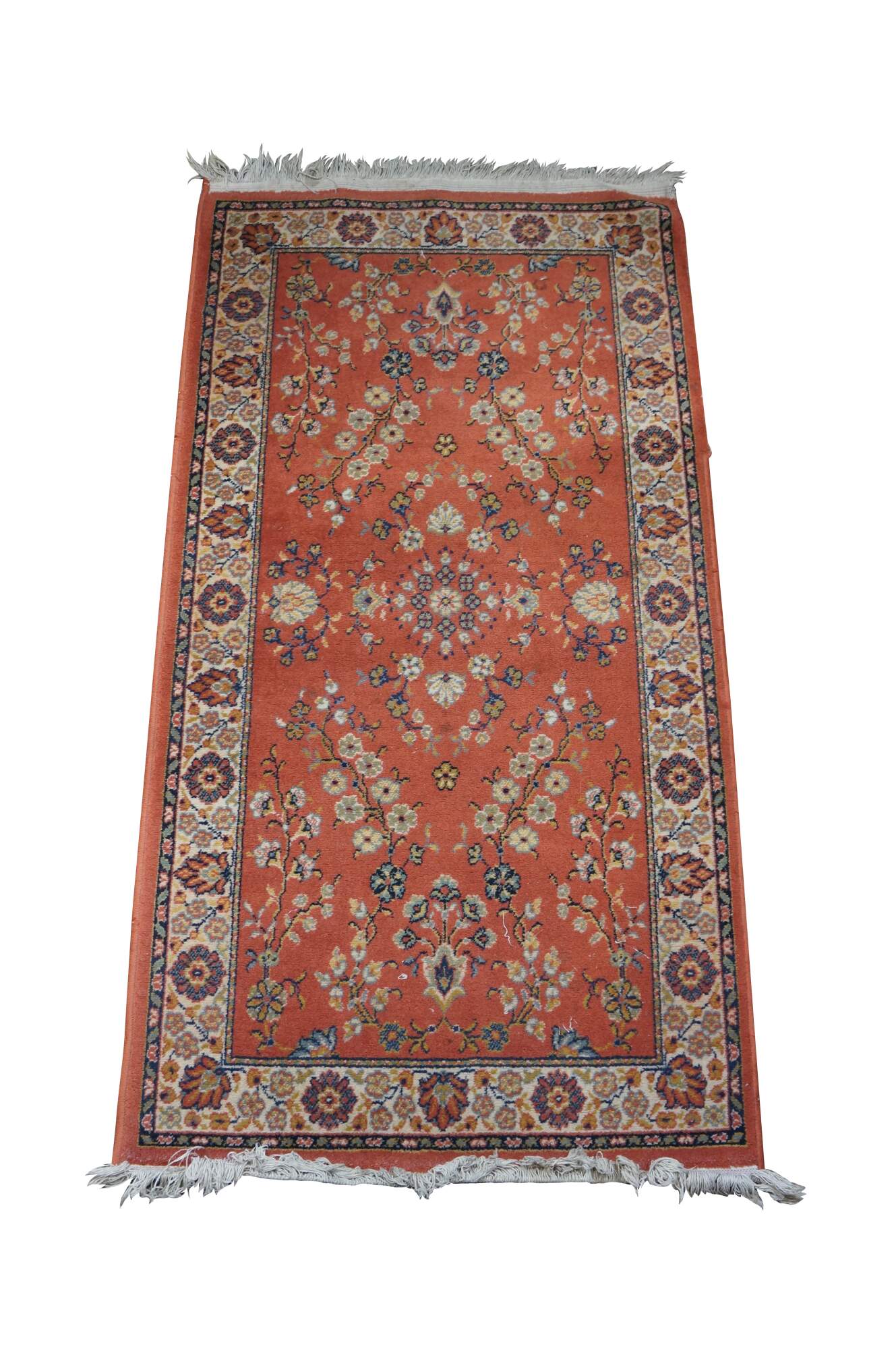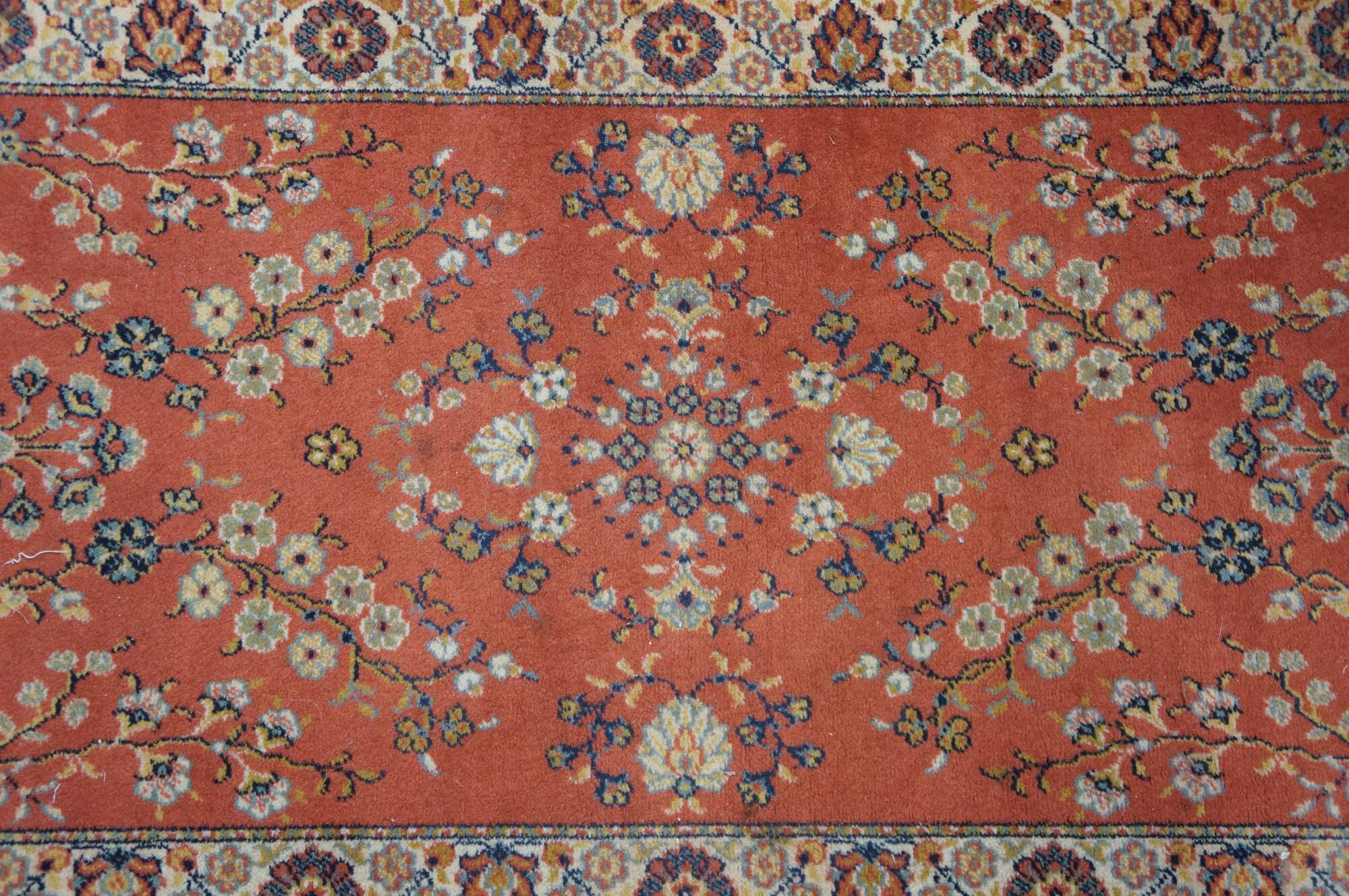 Vintage German Belgium Orienta rug runner featuring a floral medallion design in red / orange, blue, pink, green, and beige.