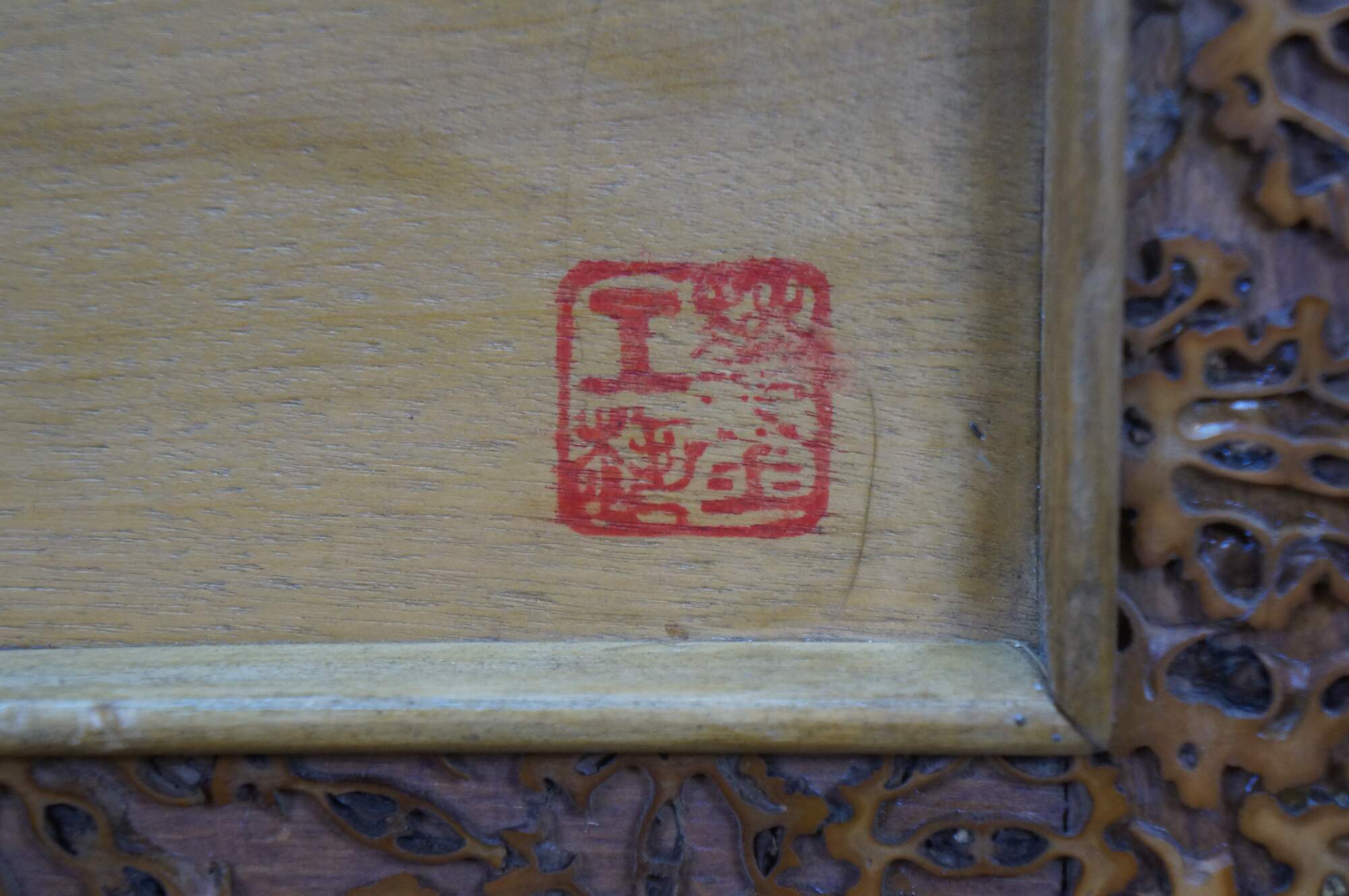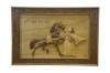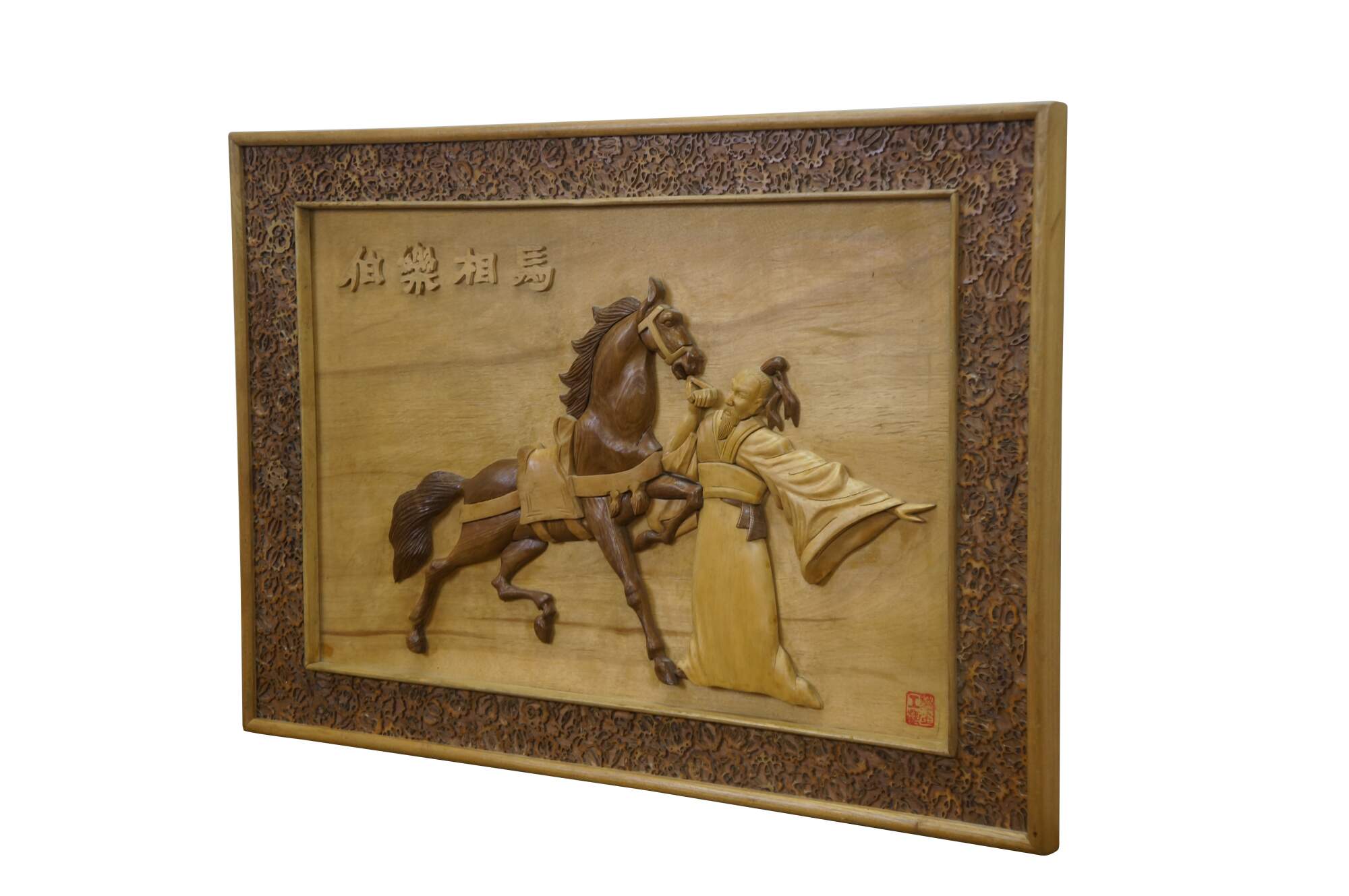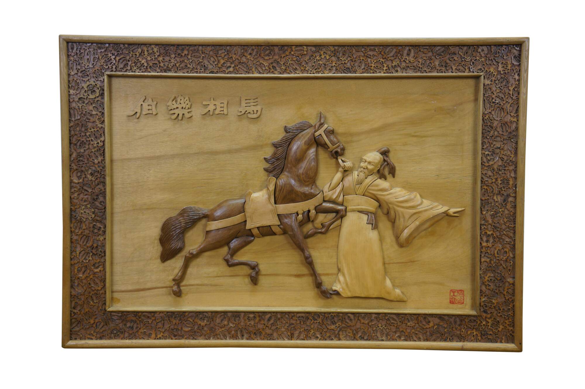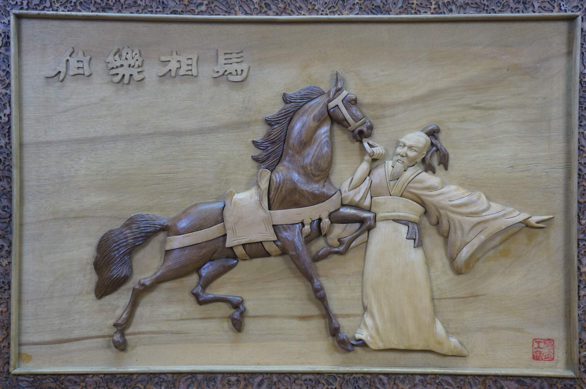 Vintage Chinese Chinoiserie hand-carved wood relief panel / plaque depicting the famous Chinese idiom Bole Xiang Ma (伯樂相馬), Calligraphy translates to Bole selecting a horse, and represents finding hidden talent. The scene shows Bole, a legendary figure known for his ability to judge horses, interacting with a fine Tang horse. The legendary horse-tamer, who possessed the unique ability to recognize a qianlima 千里馬, thousand-li horse, a rare horse capable of galloping 400 km in a day. Frame border features sliced silvers of what appear to be walnuts.