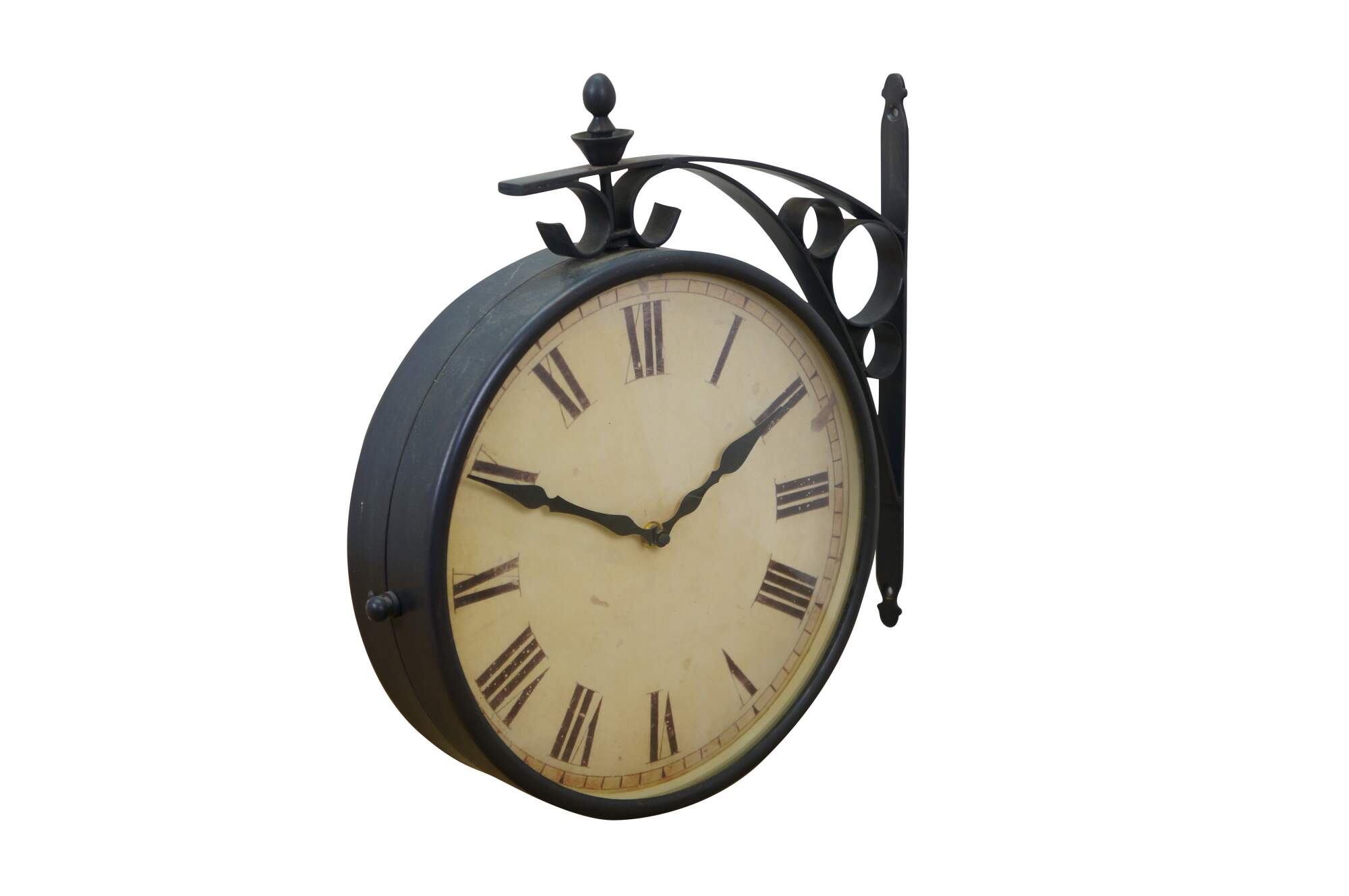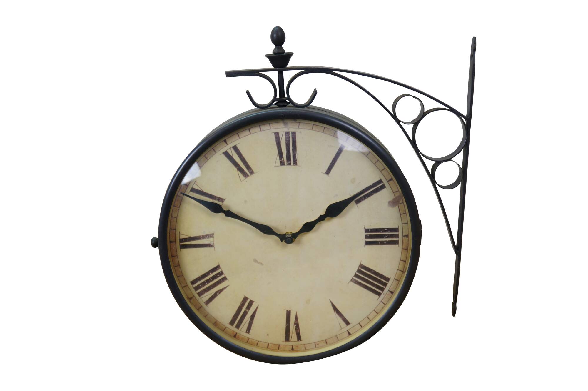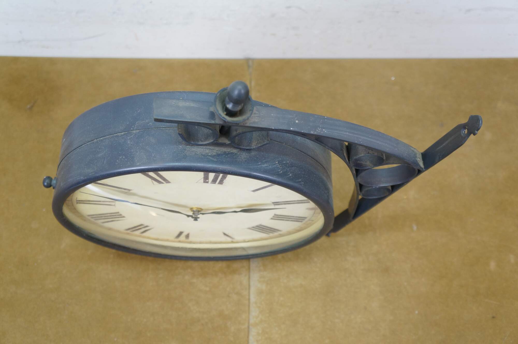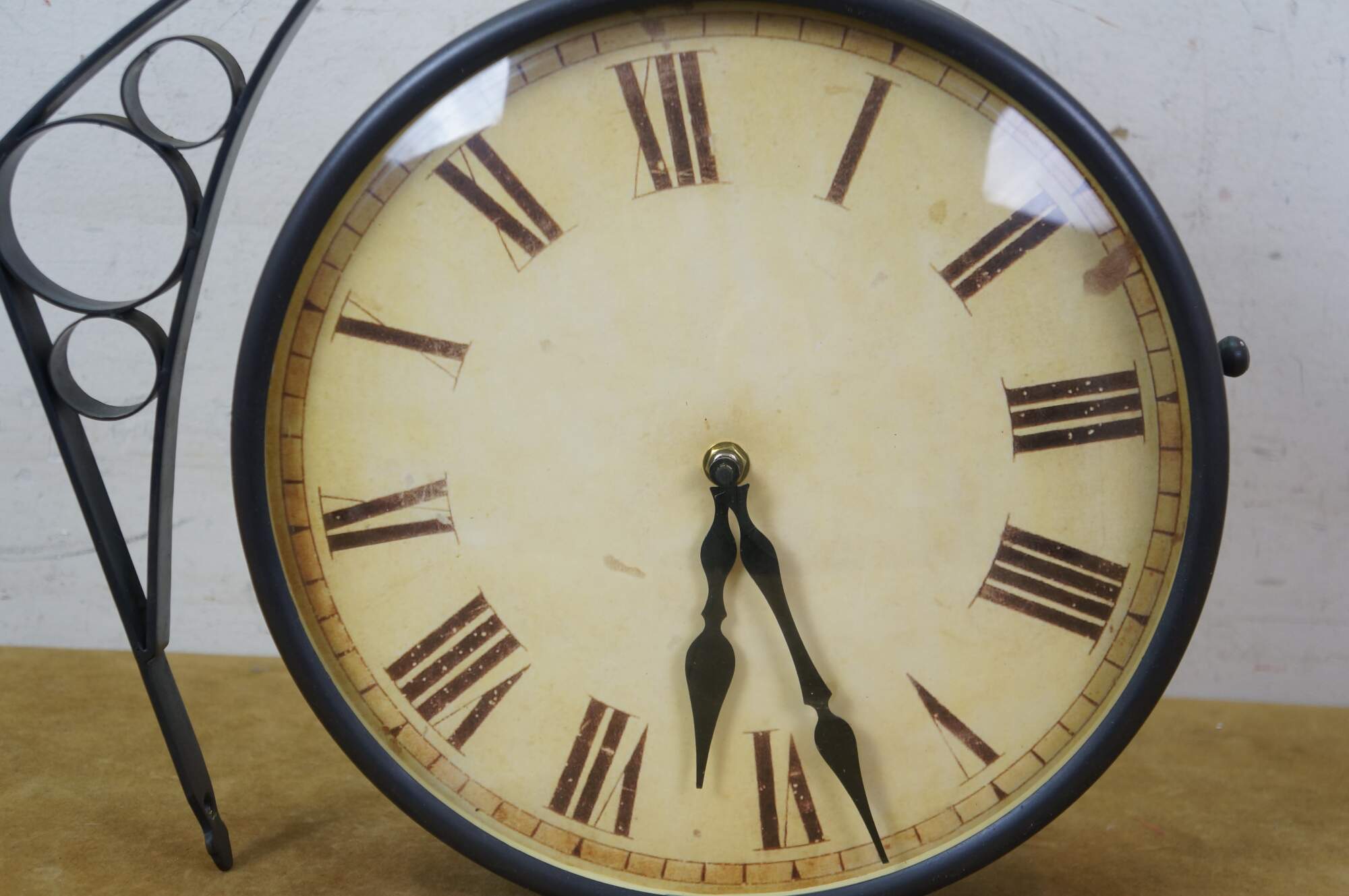 Late 20th century double sided railway clock styled after the famous clock at Victoria Station, London. Wrought metal wall mounted support and case in a dark bronze finish. 11 inch diameter printed face with faux distressing and Roman numerals. Black metal hands. Young Town Quartz, battery operated movement.