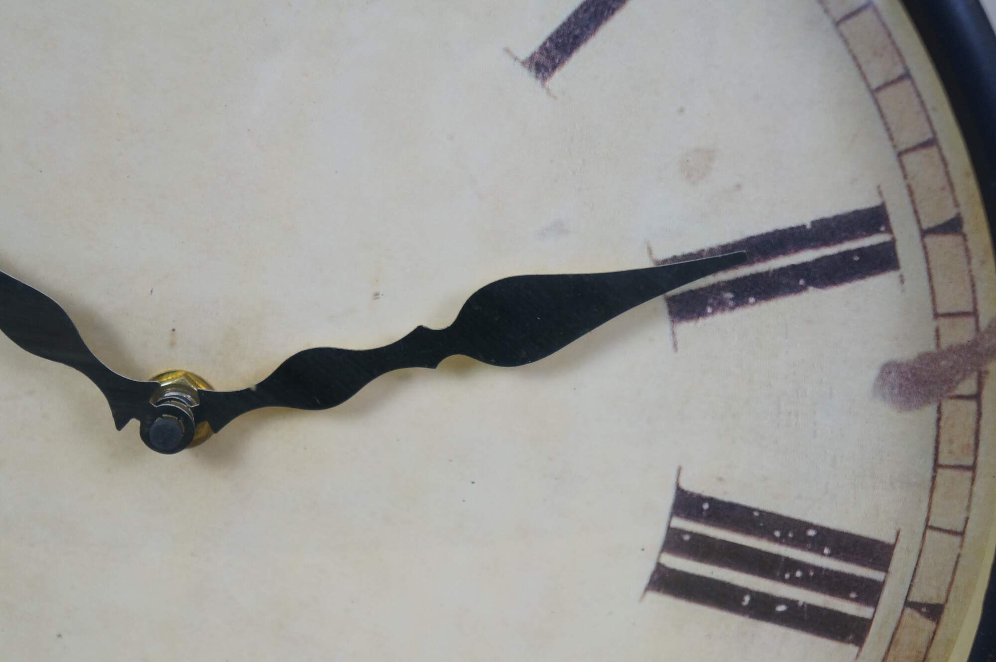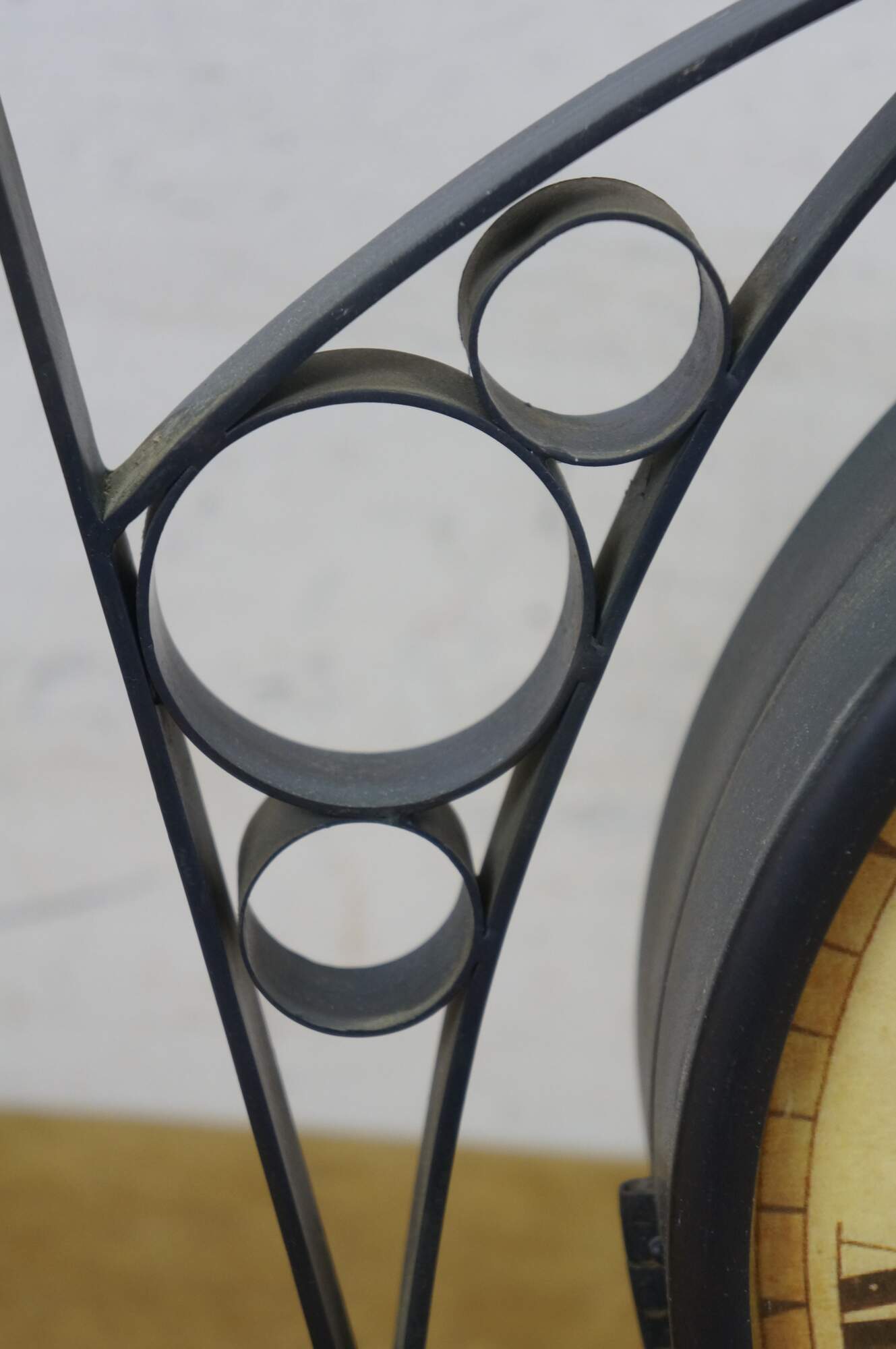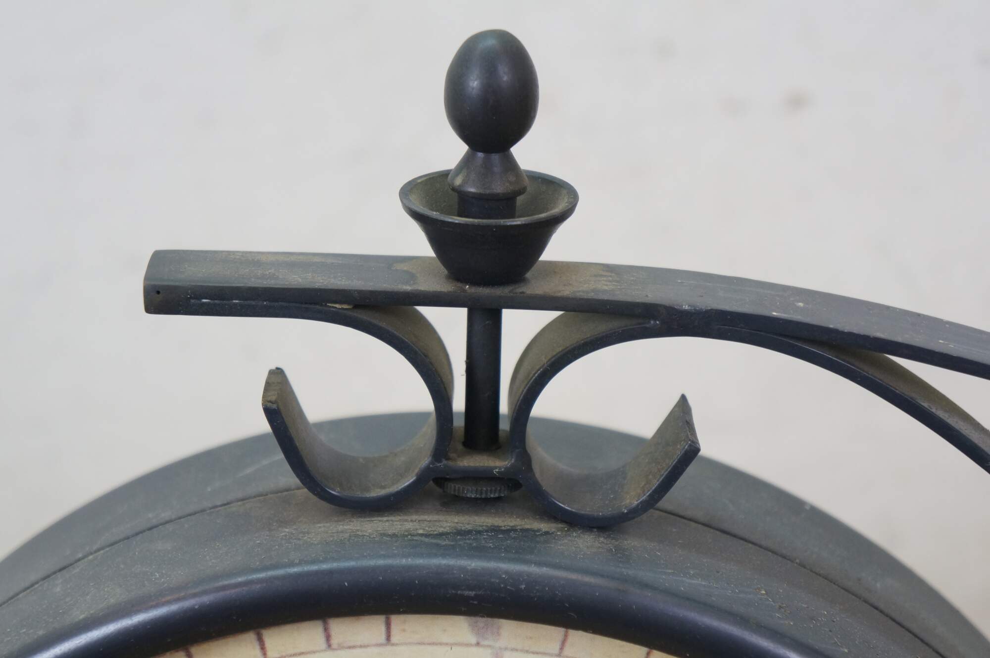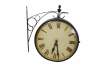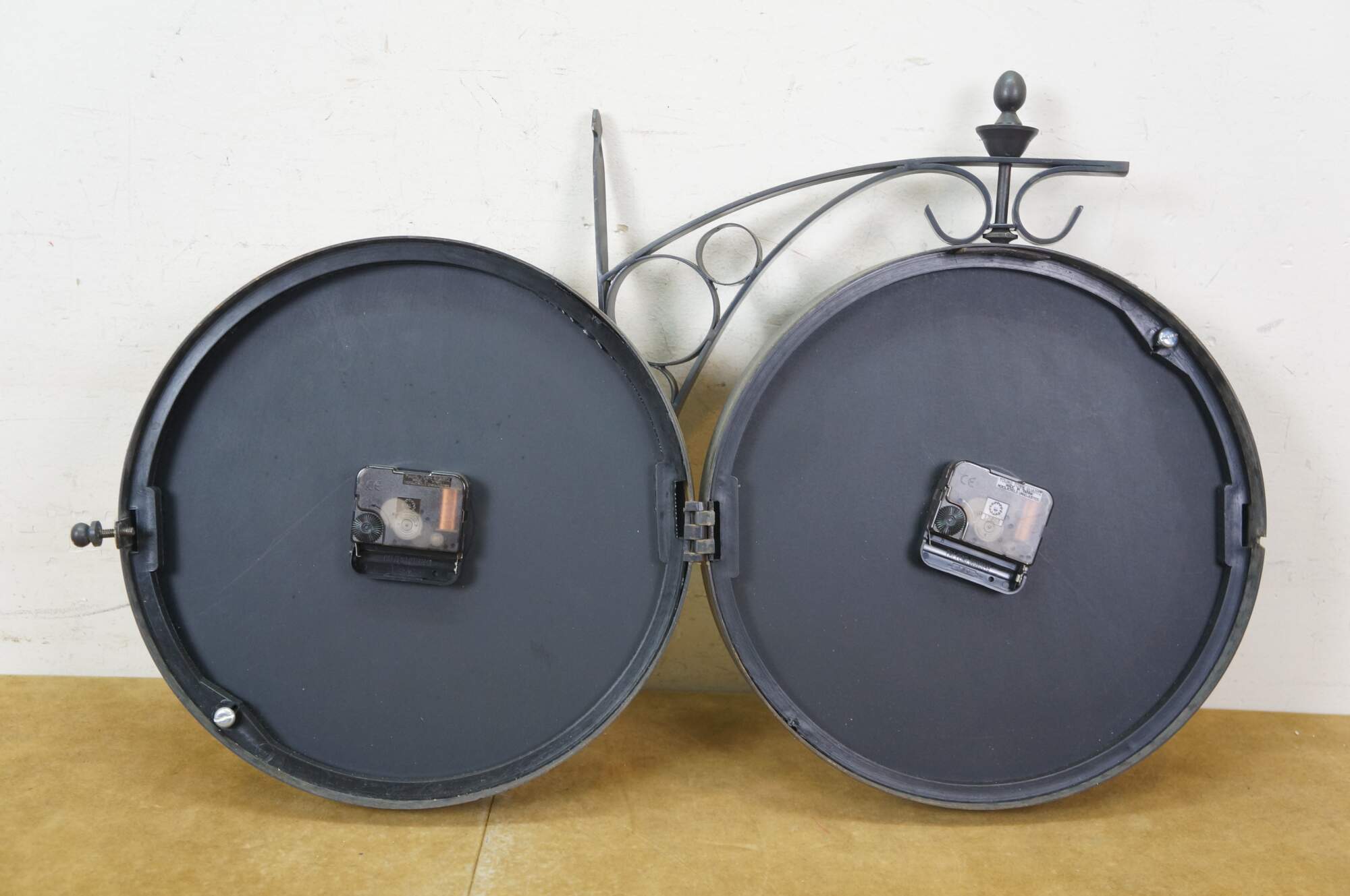 Late 20th century double sided railway clock styled after the famous clock at Victoria Station, London. Wrought metal wall mounted support and case in a dark bronze finish. 11 inch diameter printed face with faux distressing and Roman numerals. Black metal hands. Young Town Quartz, battery operated movement.