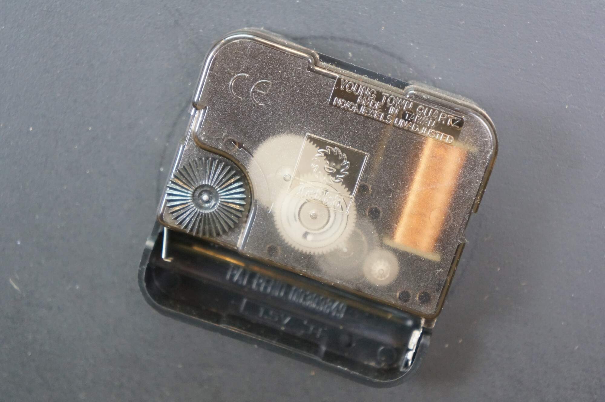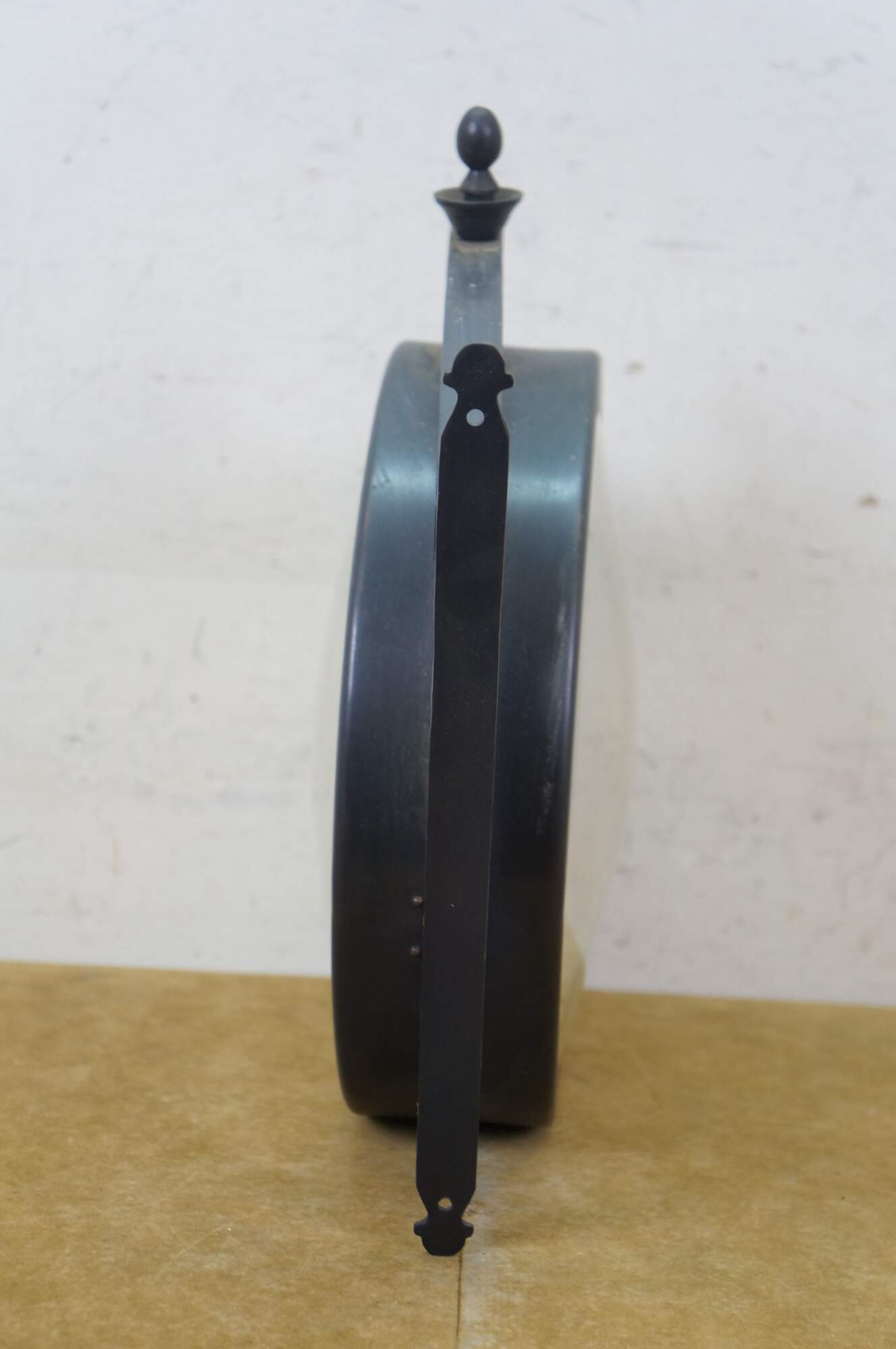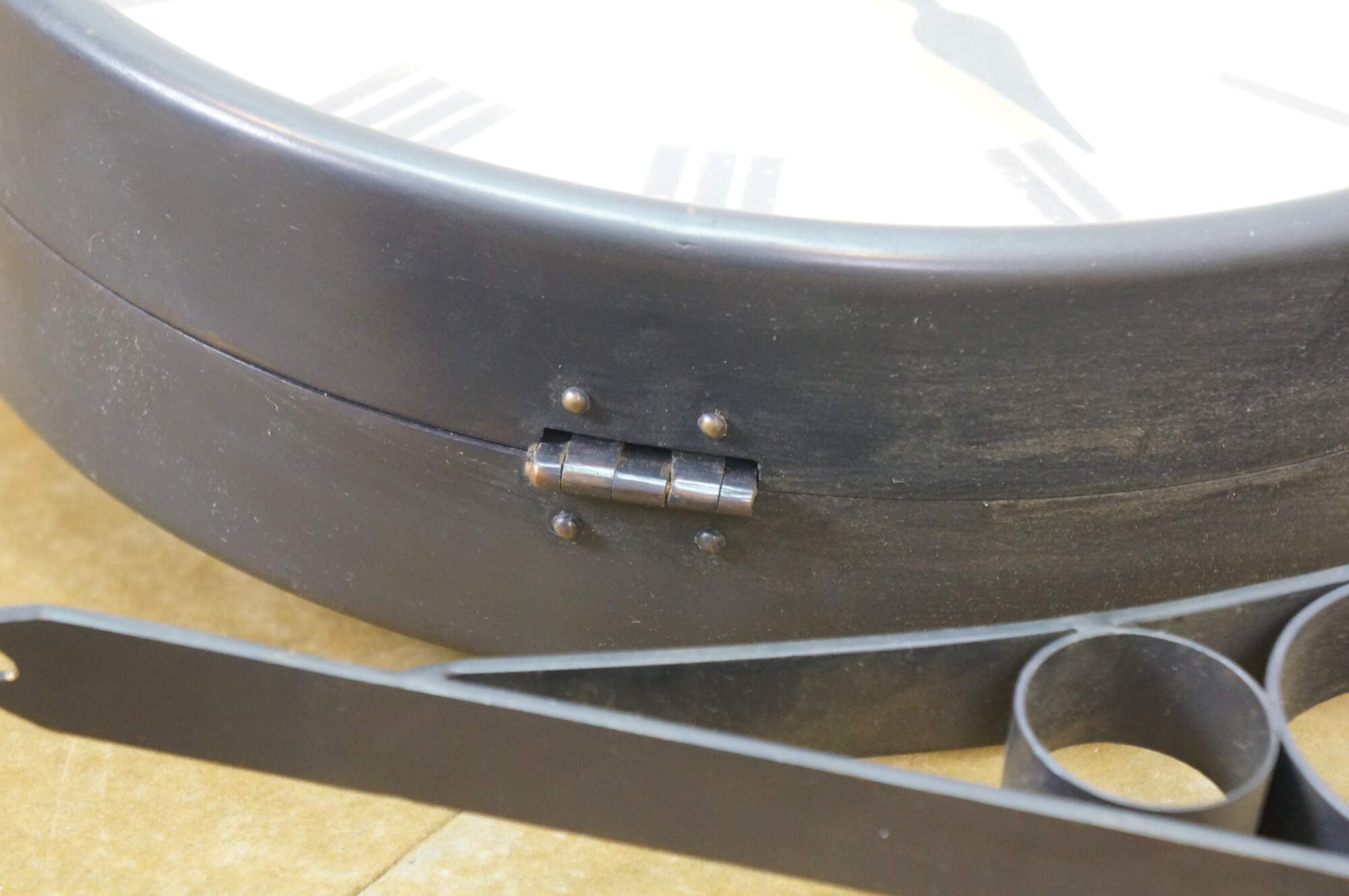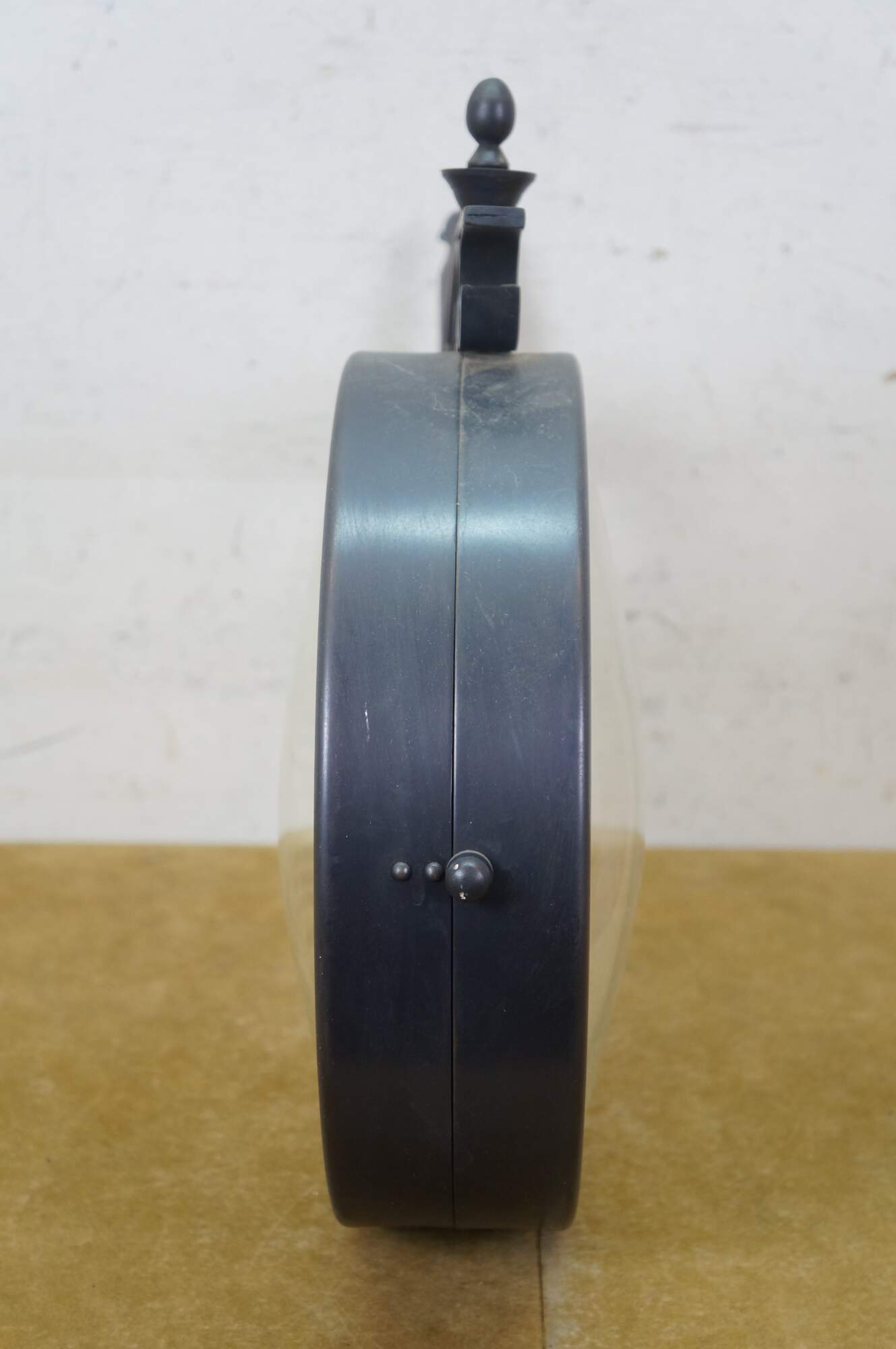 Late 20th century double sided railway clock styled after the famous clock at Victoria Station, London. Wrought metal wall mounted support and case in a dark bronze finish. 11 inch diameter printed face with faux distressing and Roman numerals. Black metal hands. Young Town Quartz, battery operated movement.