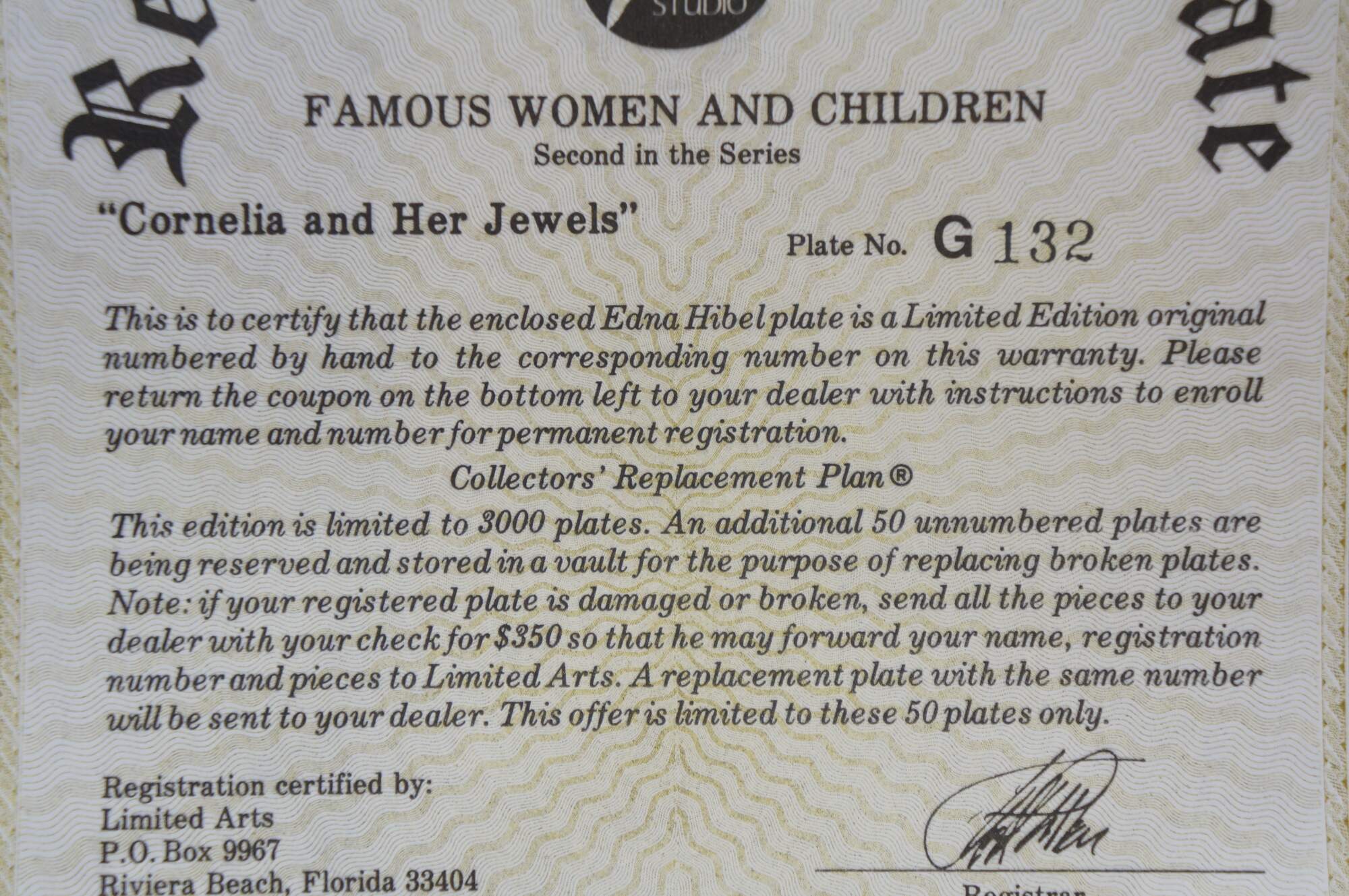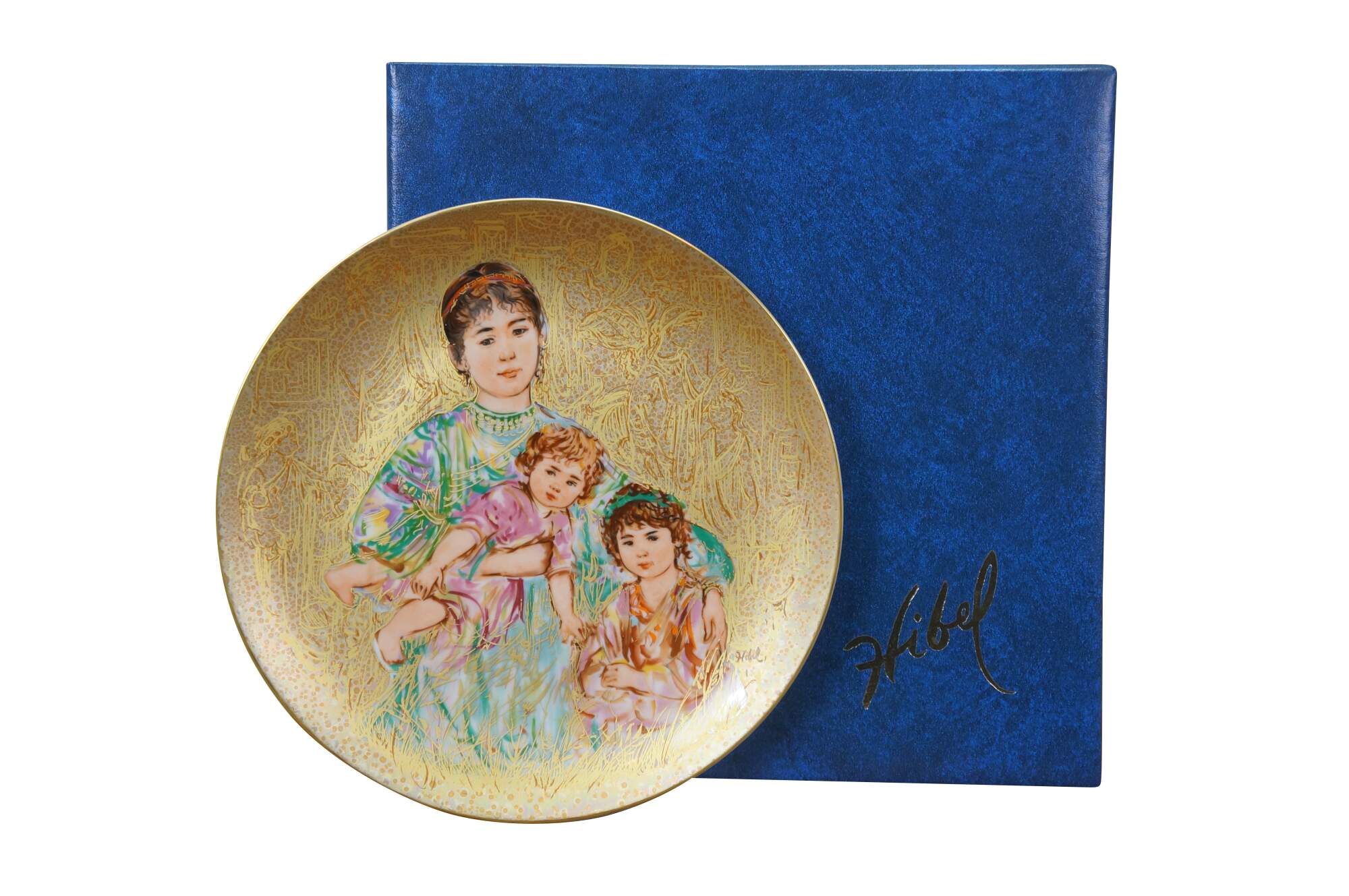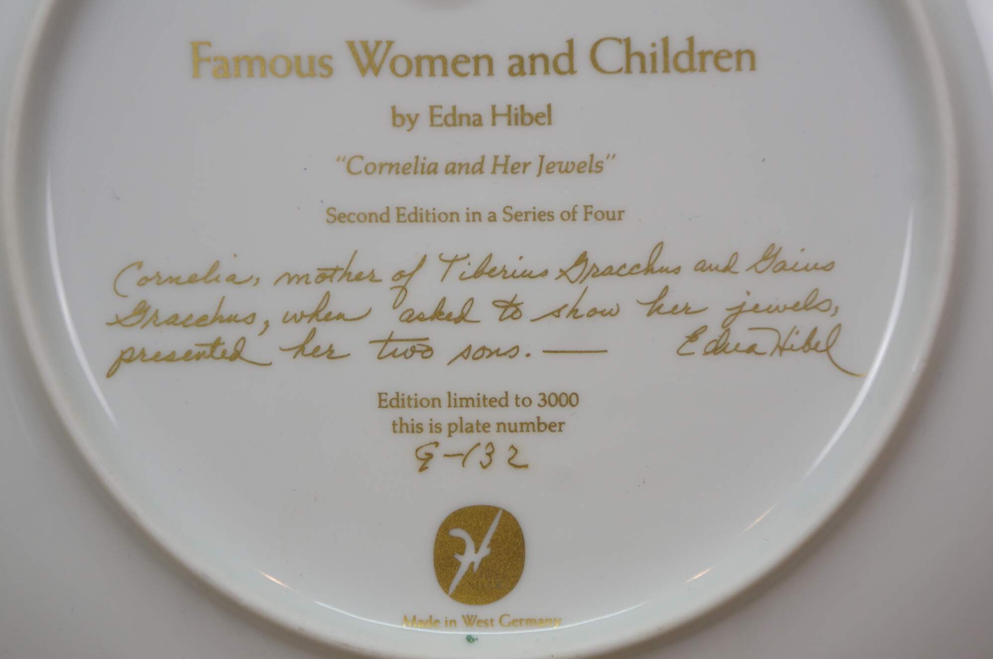 Vintage limited edition collector's plate titled Cornelia and Her Jewels from the Famous Women and Children series by artist Edna Hibel.