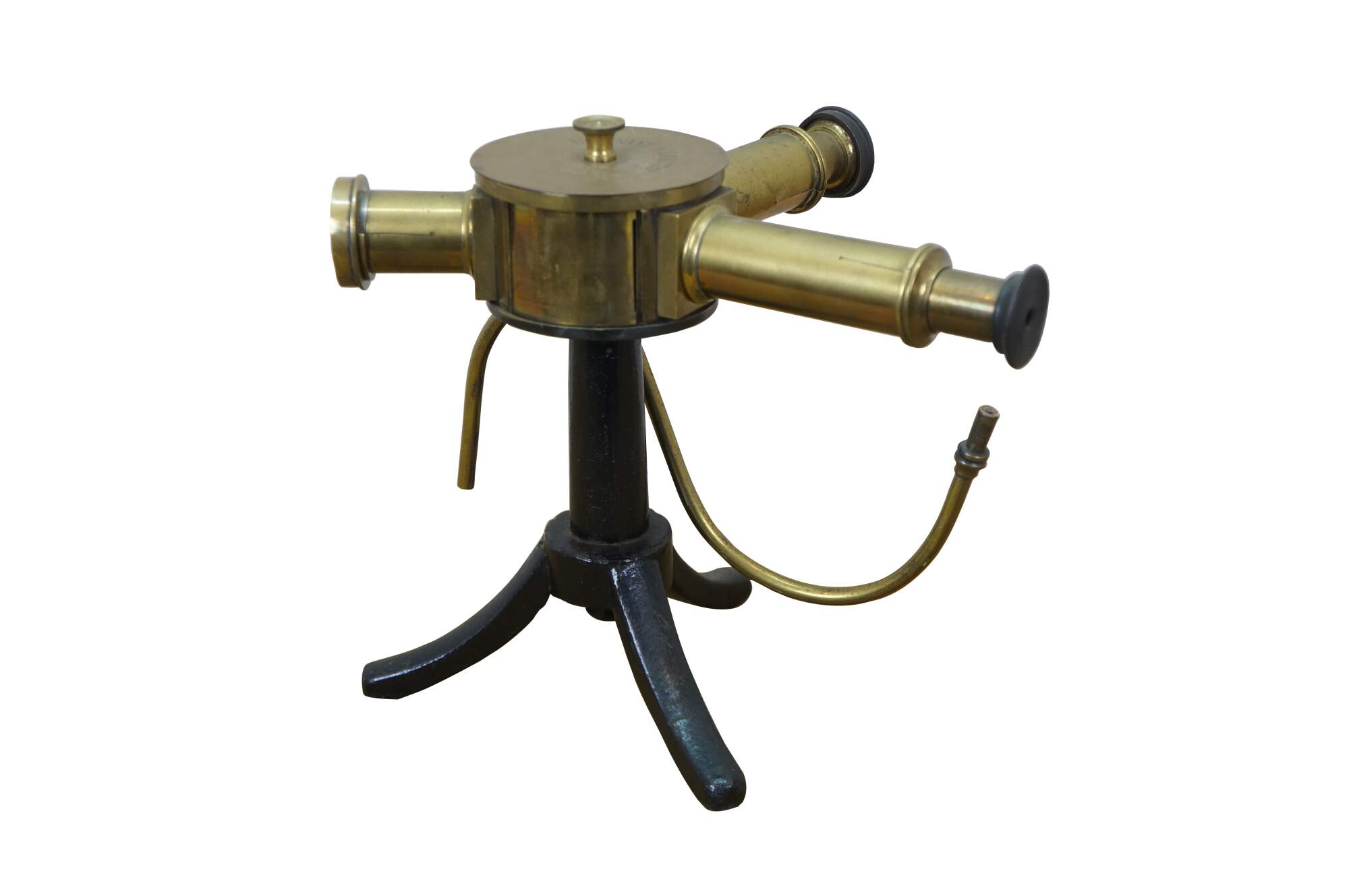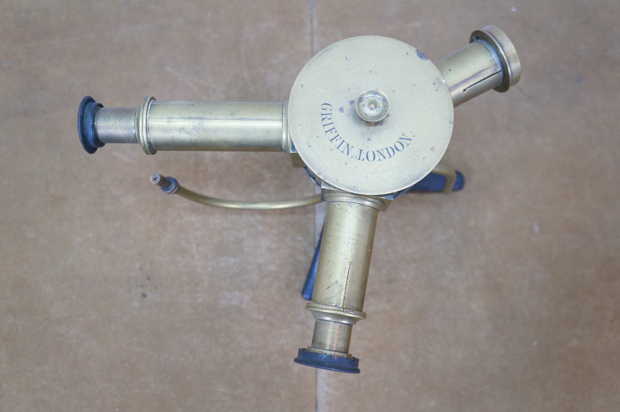 Antique Griffin London brass scientific laboratory spectroscope used to separate light into its spectral components (a spectrum) for analysis. Features a three-arm design mounted on a cast iron tripod base. Primarily used in chemistry and physics for the analysis of chemicals and pharmaceuticals.