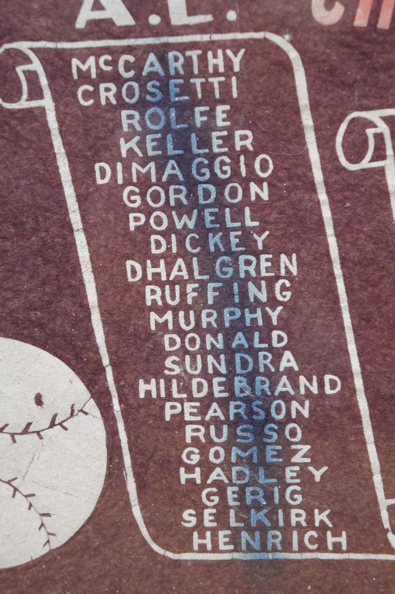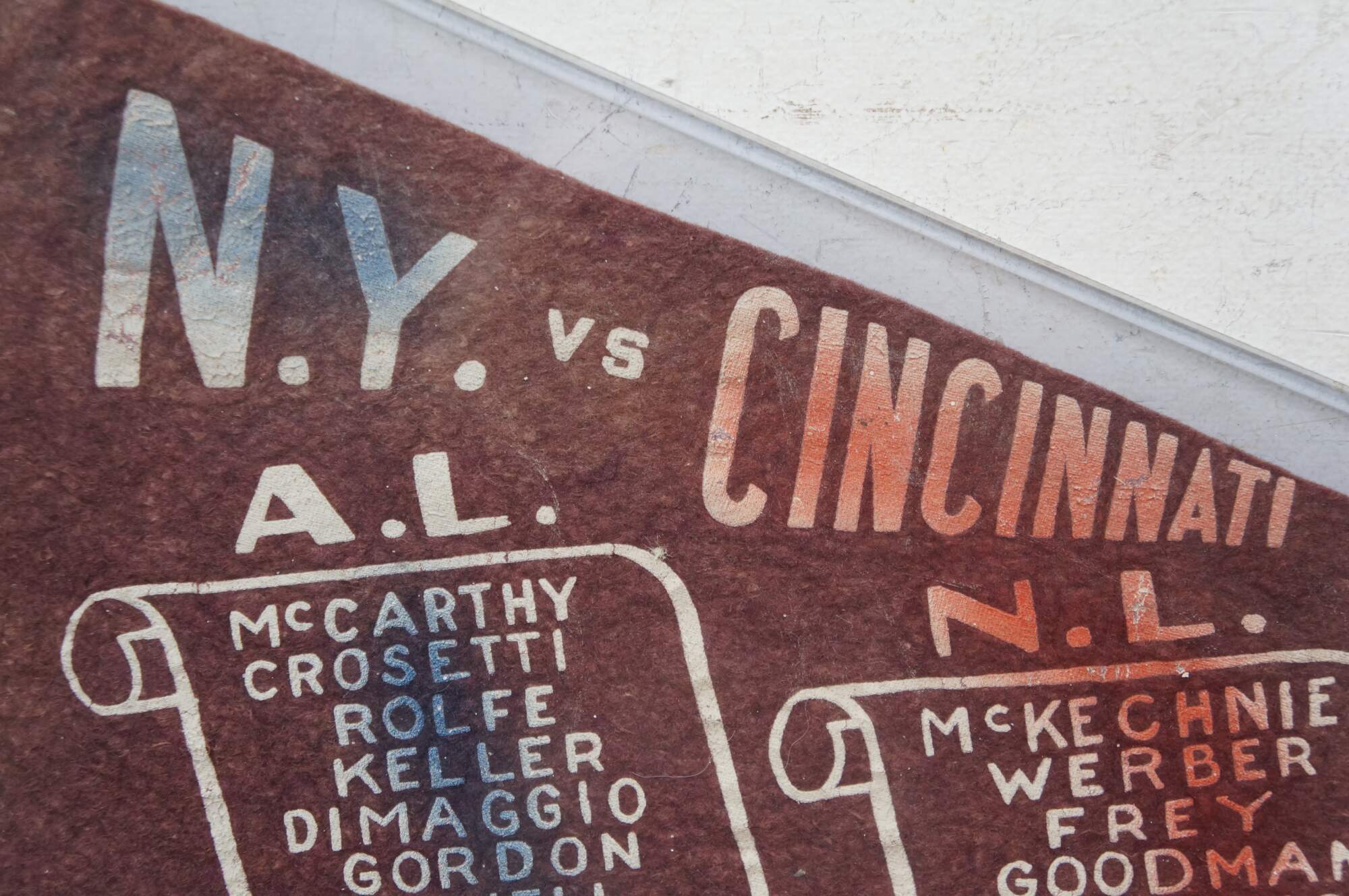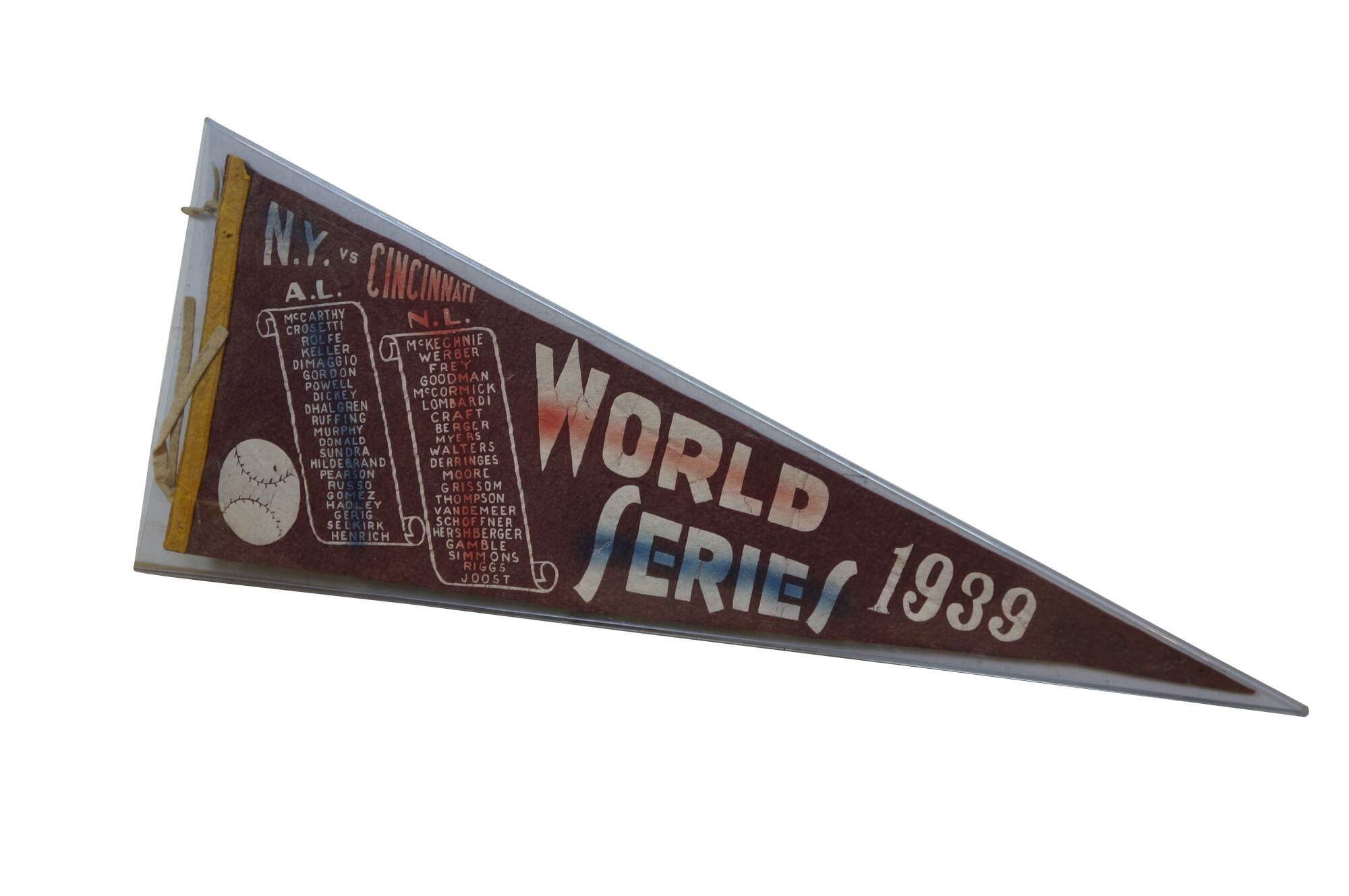 Rare antique 1939 Major League Baseball World Series team roster felt pennant commemorating the MLB championship matchup between the New York Yankees and the Cincinnati Reds. It lists the rosters for both teams, featuring legendary players like Joe DiMaggio and Lue Gehrig (which was misspelled) for the Yankees and Ernie Lombardi for the Reds. The 1939 World Series resulted in a four-game sweep by the New York Yankees, marking their fourth consecutive championship.