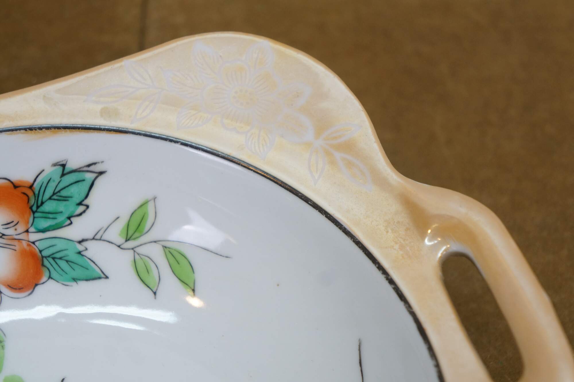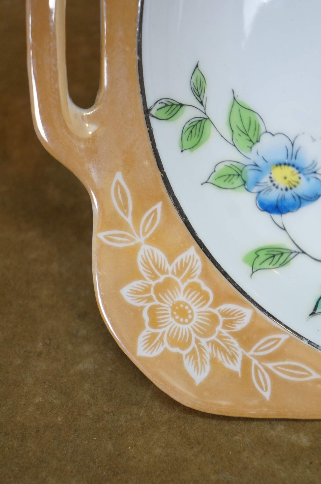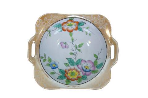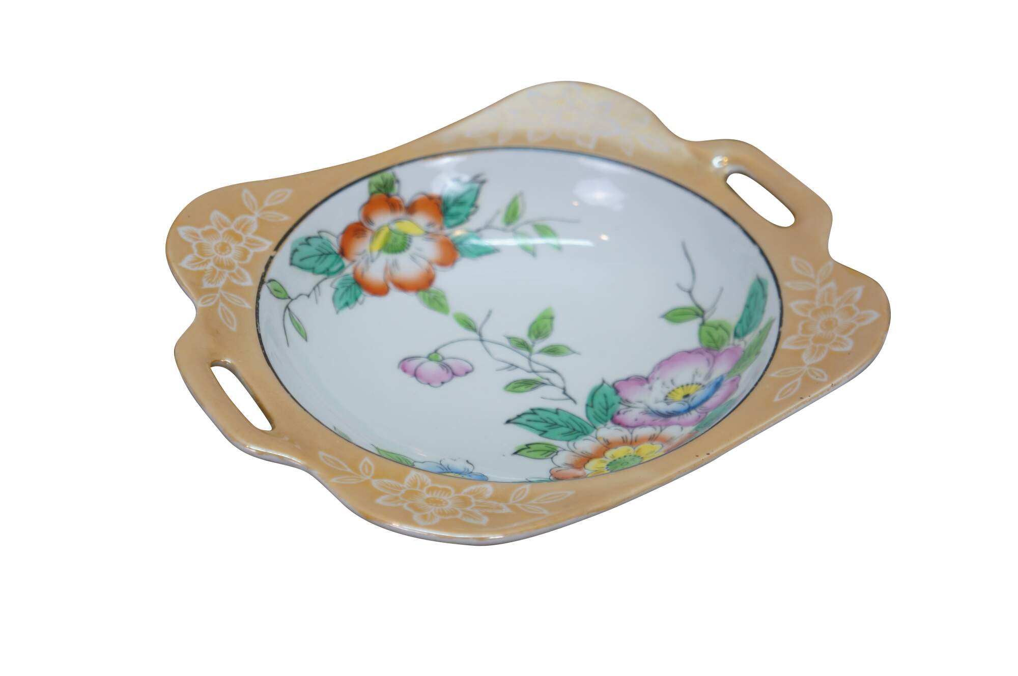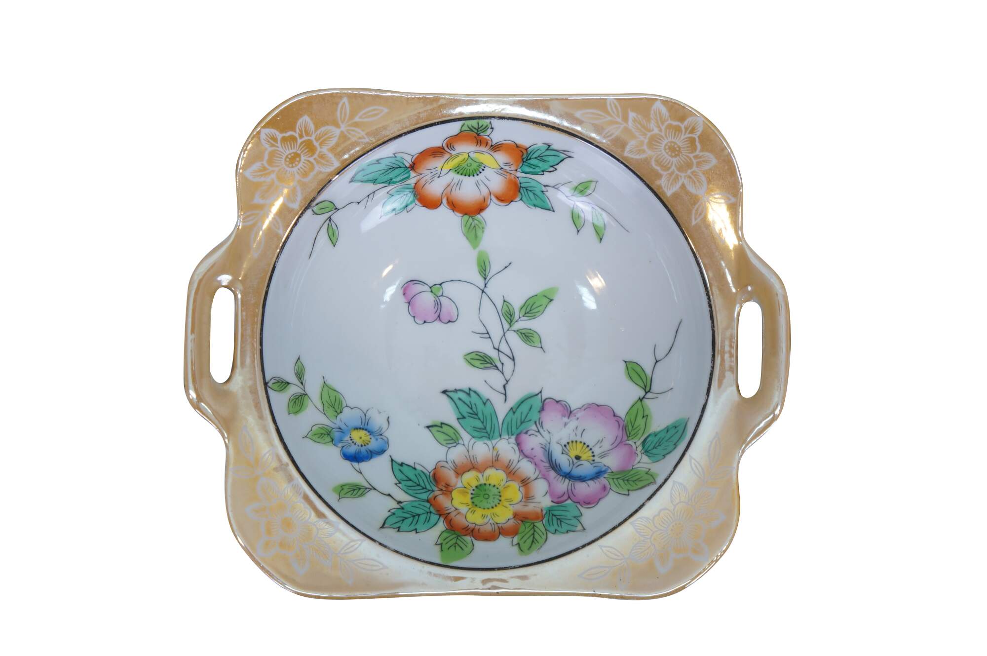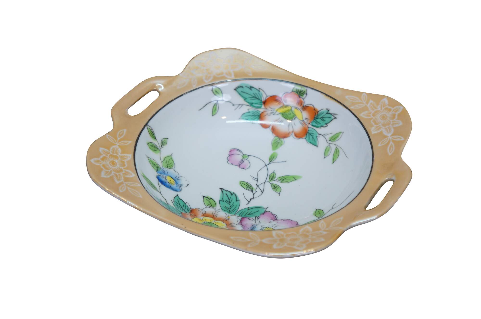 Vintage Japanese lusterware serving bowl featuring a hand-painted floral design on a porcelain body with a lustrous peach or tan border and side handles. Made in Japan, circa 1930s.