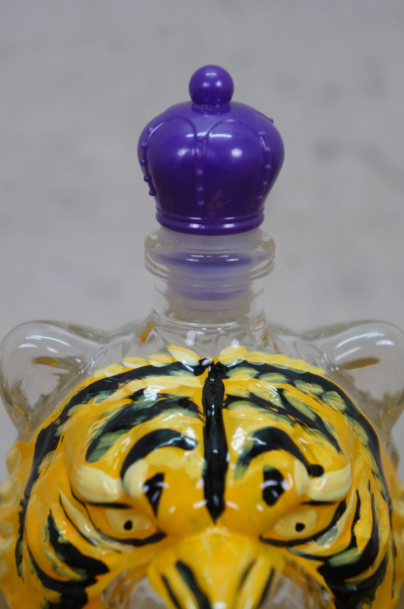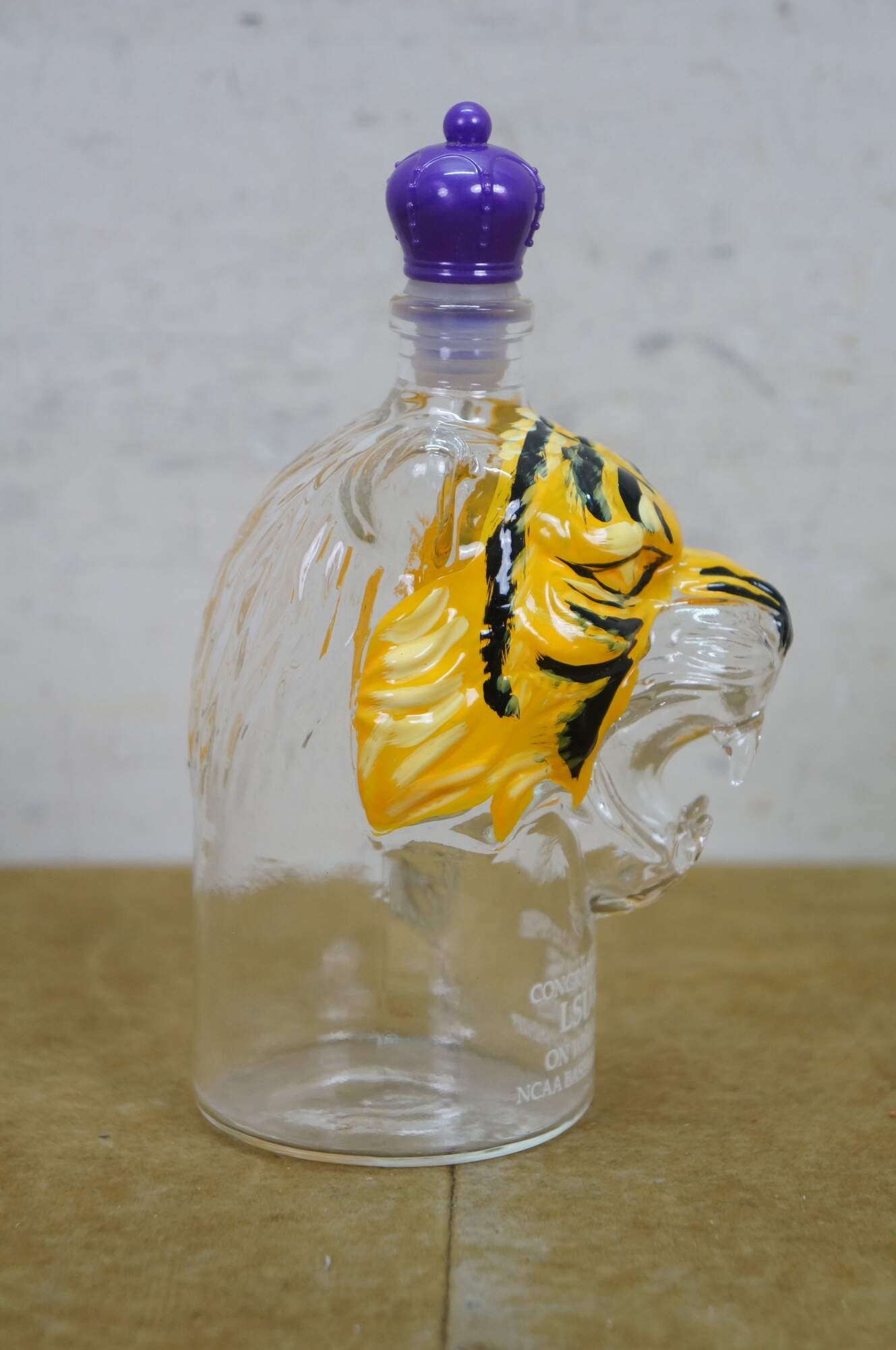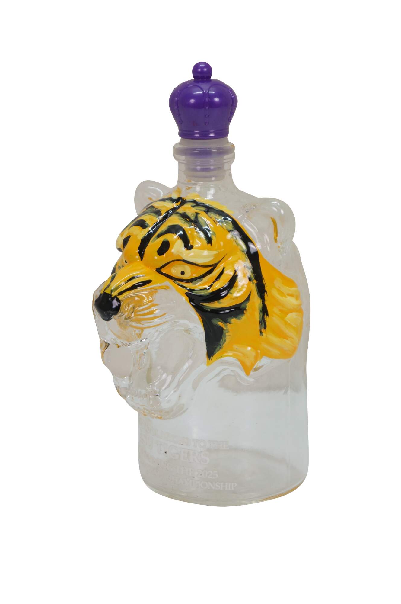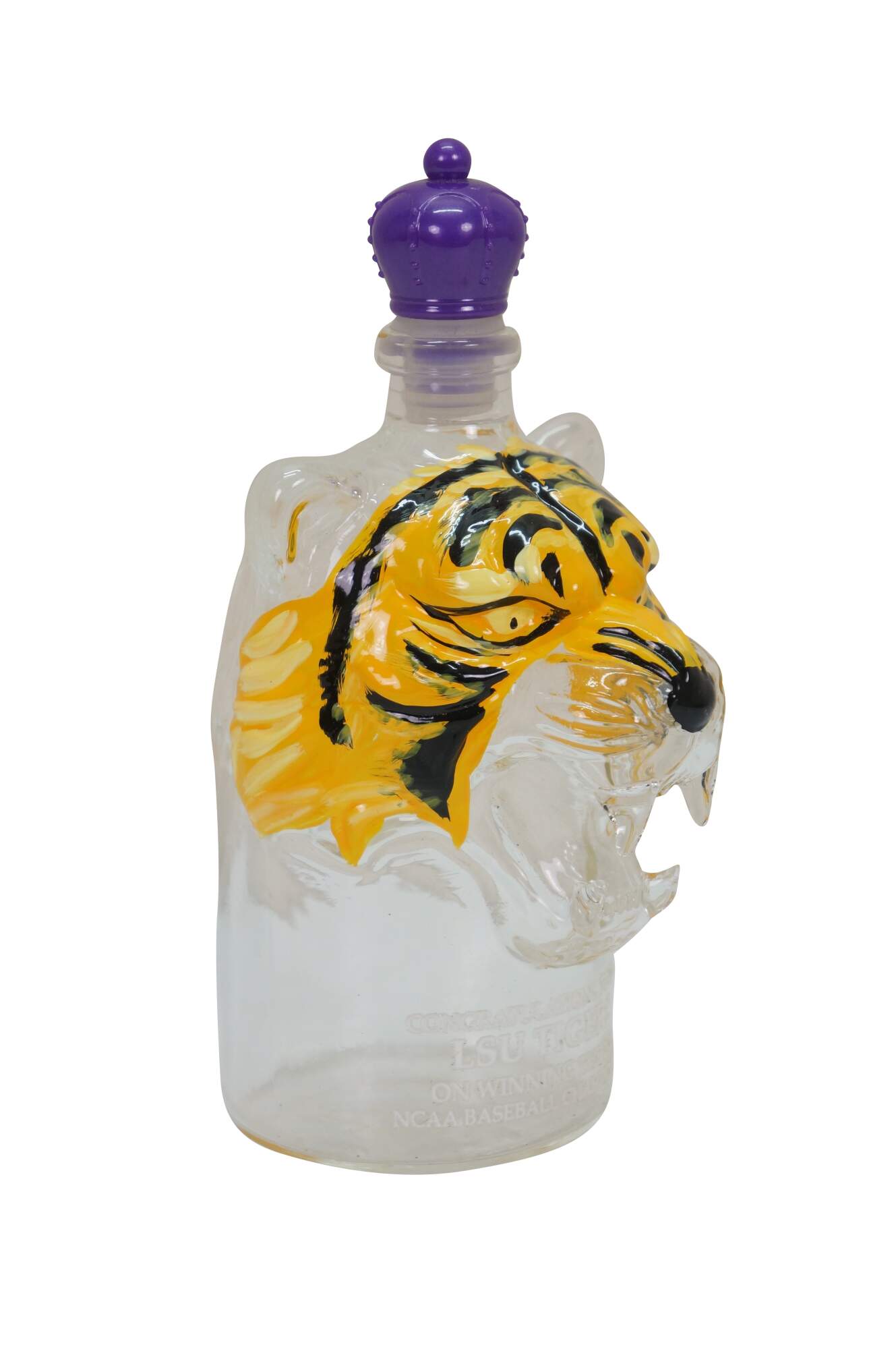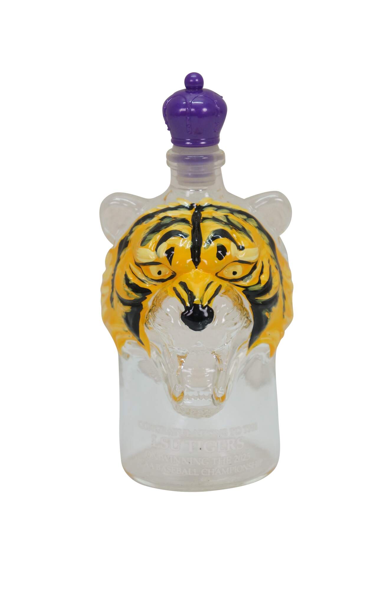 Congratulations to the 2025 Louisiana State University Tigers on winning the NCAA Baseball Championship. This tiger head whiskey decanter is hand painted and features a crown royal style stopper.