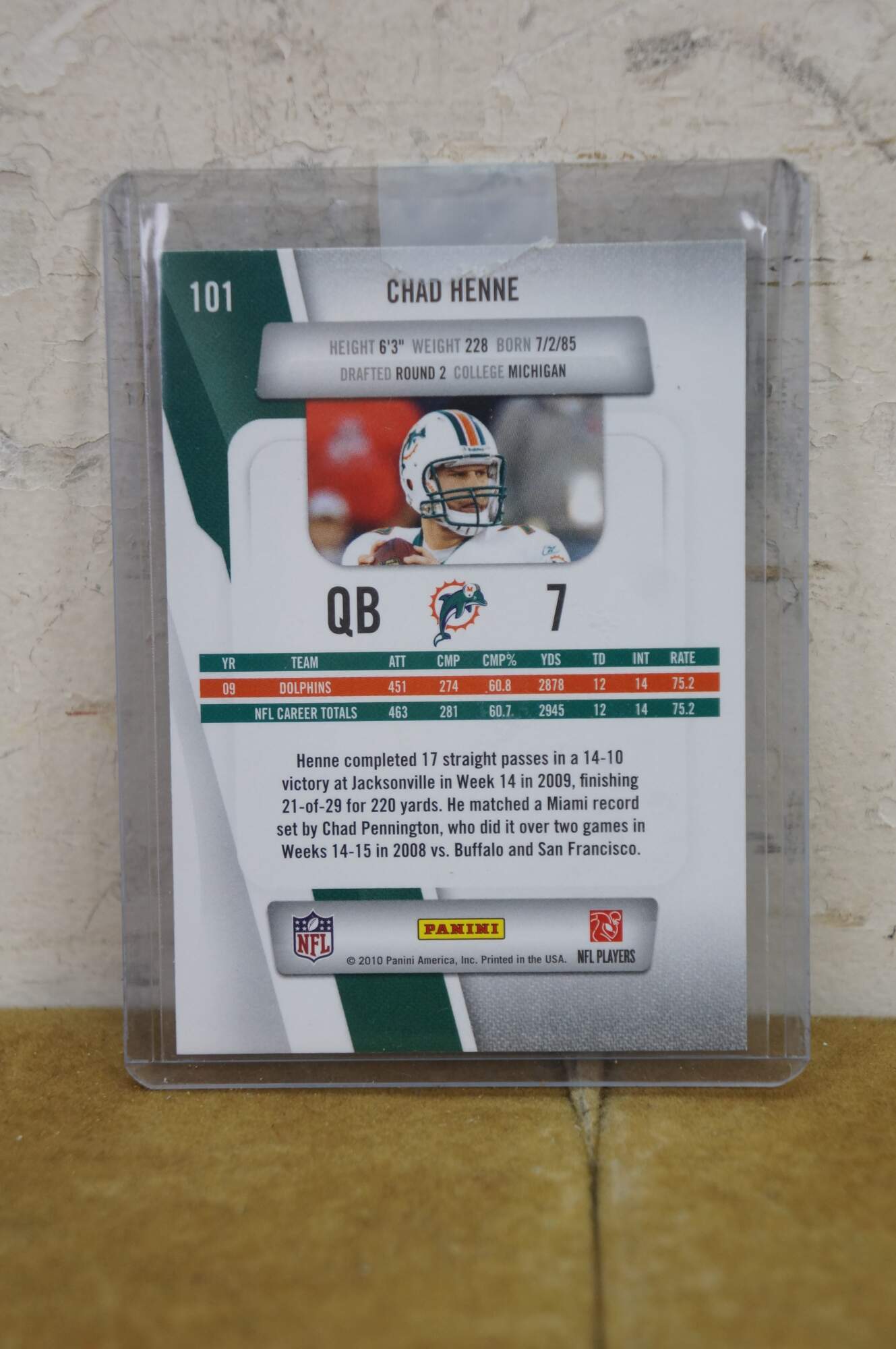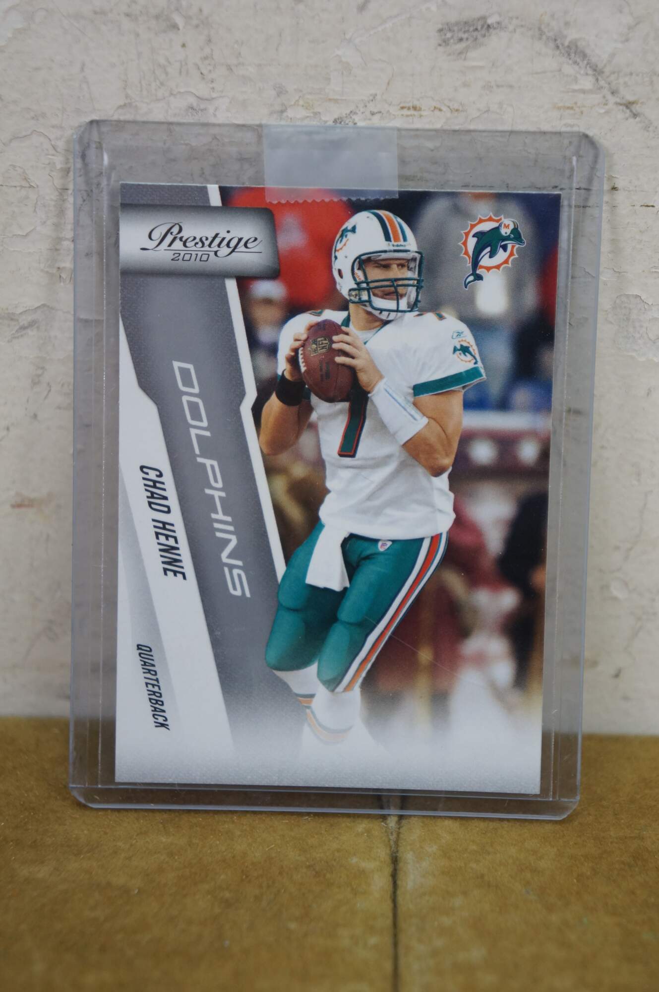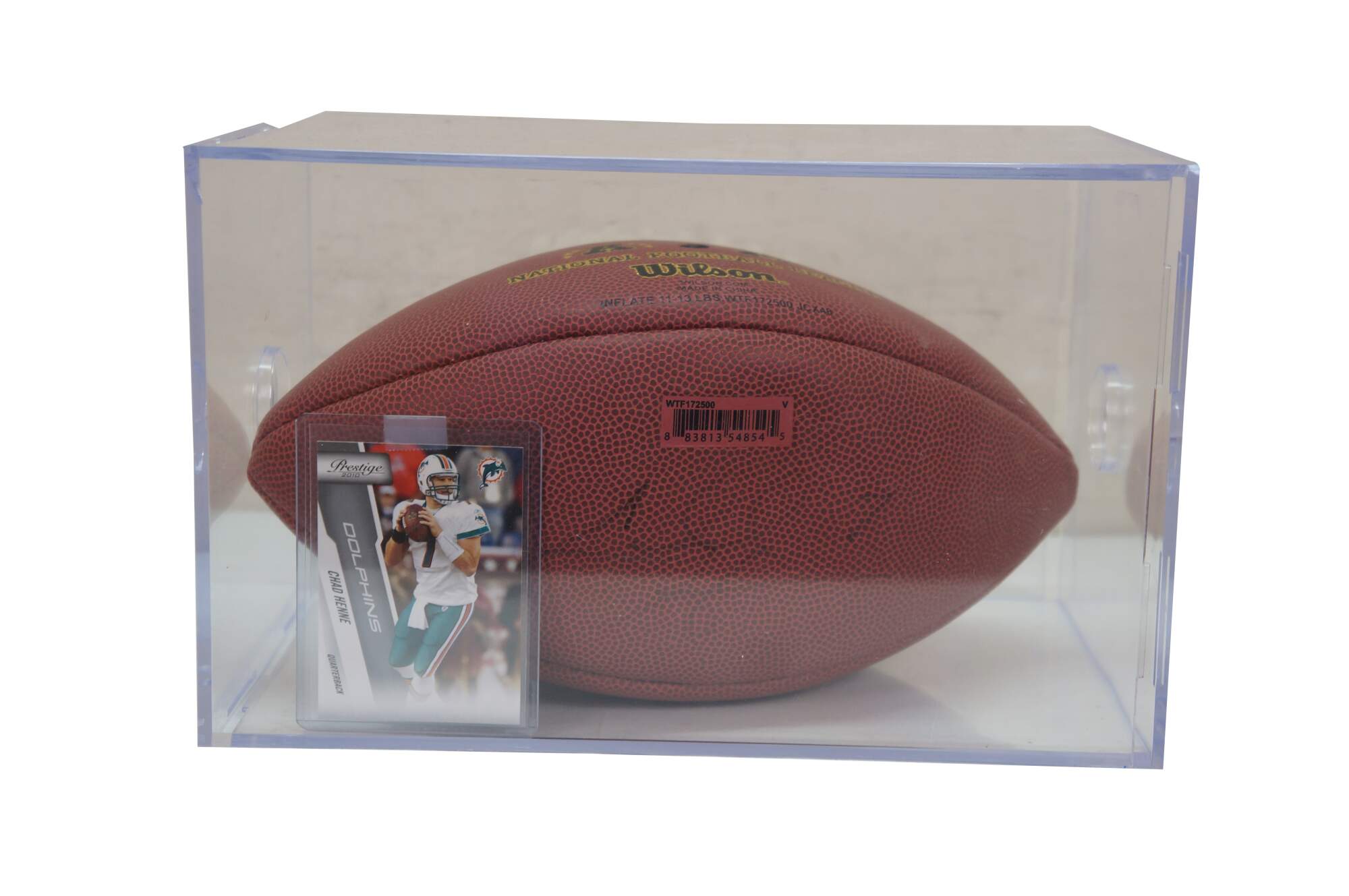 Vintage Chad Henne signed football from his days with the Miami Dolphins, includes playing card and case.