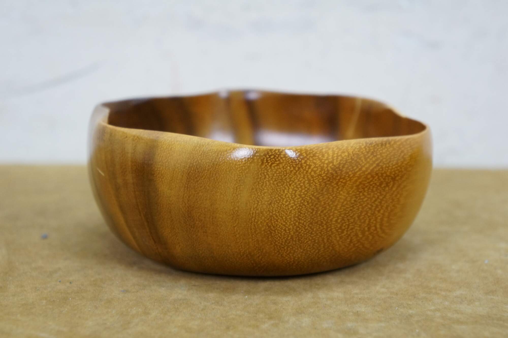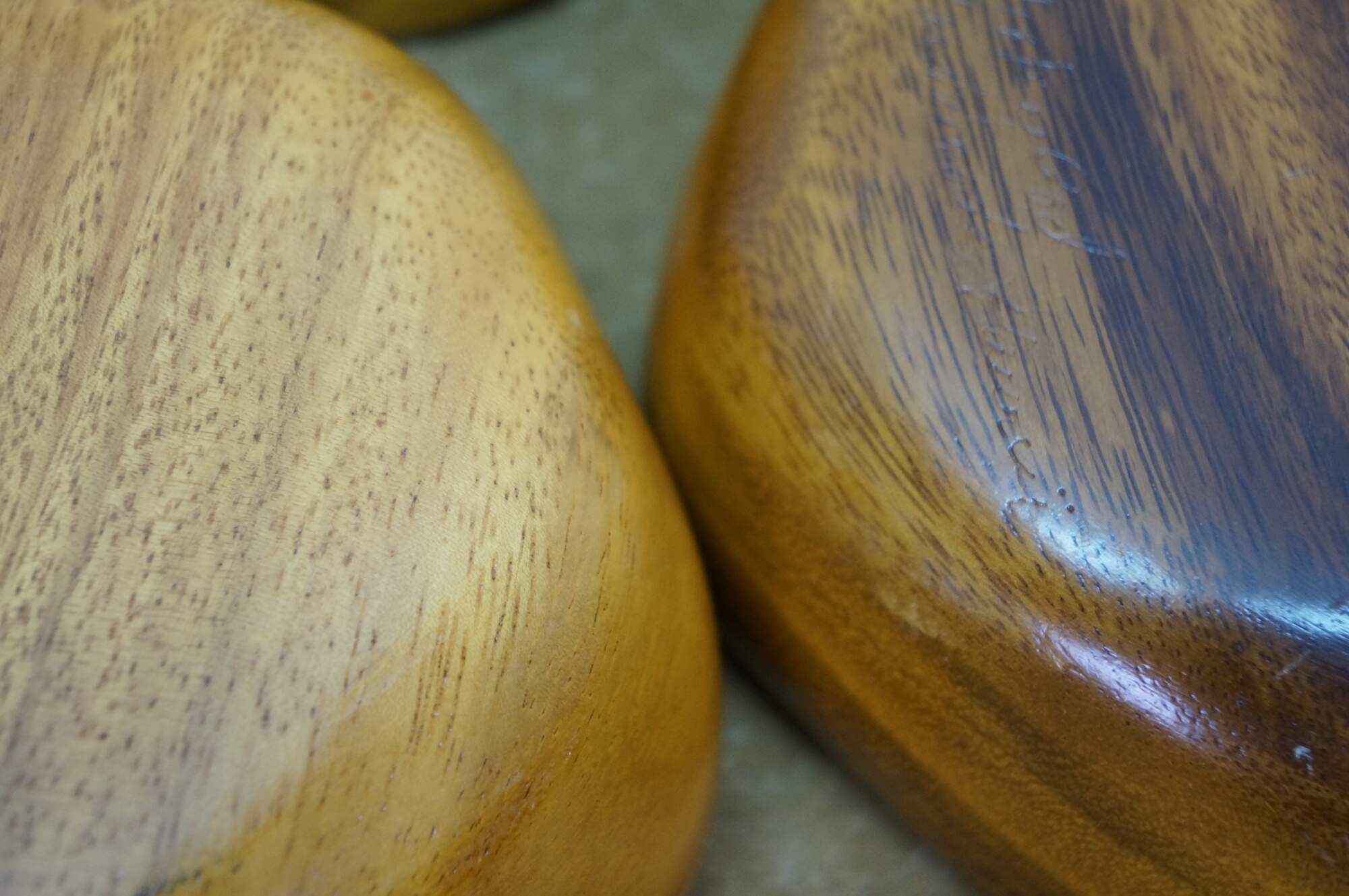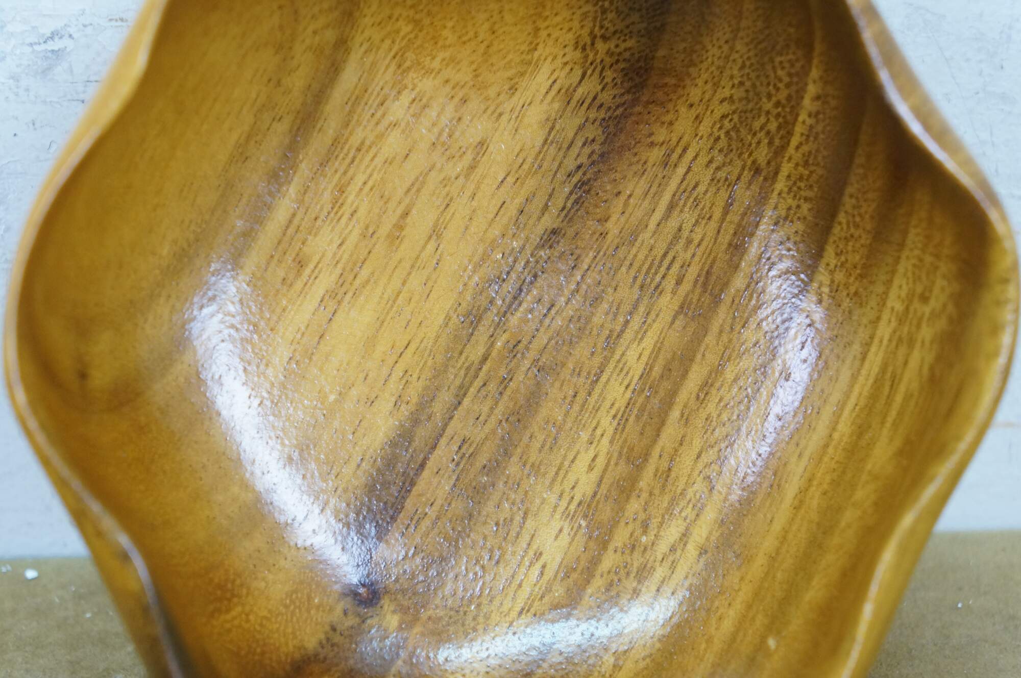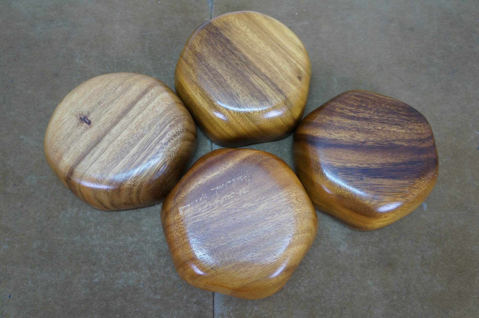 Four vintage hand-turned bowls crafted from monkey pod hardwood and featuring a distinct scalloped, freeform edge. Made in Hawaii, signed on base.