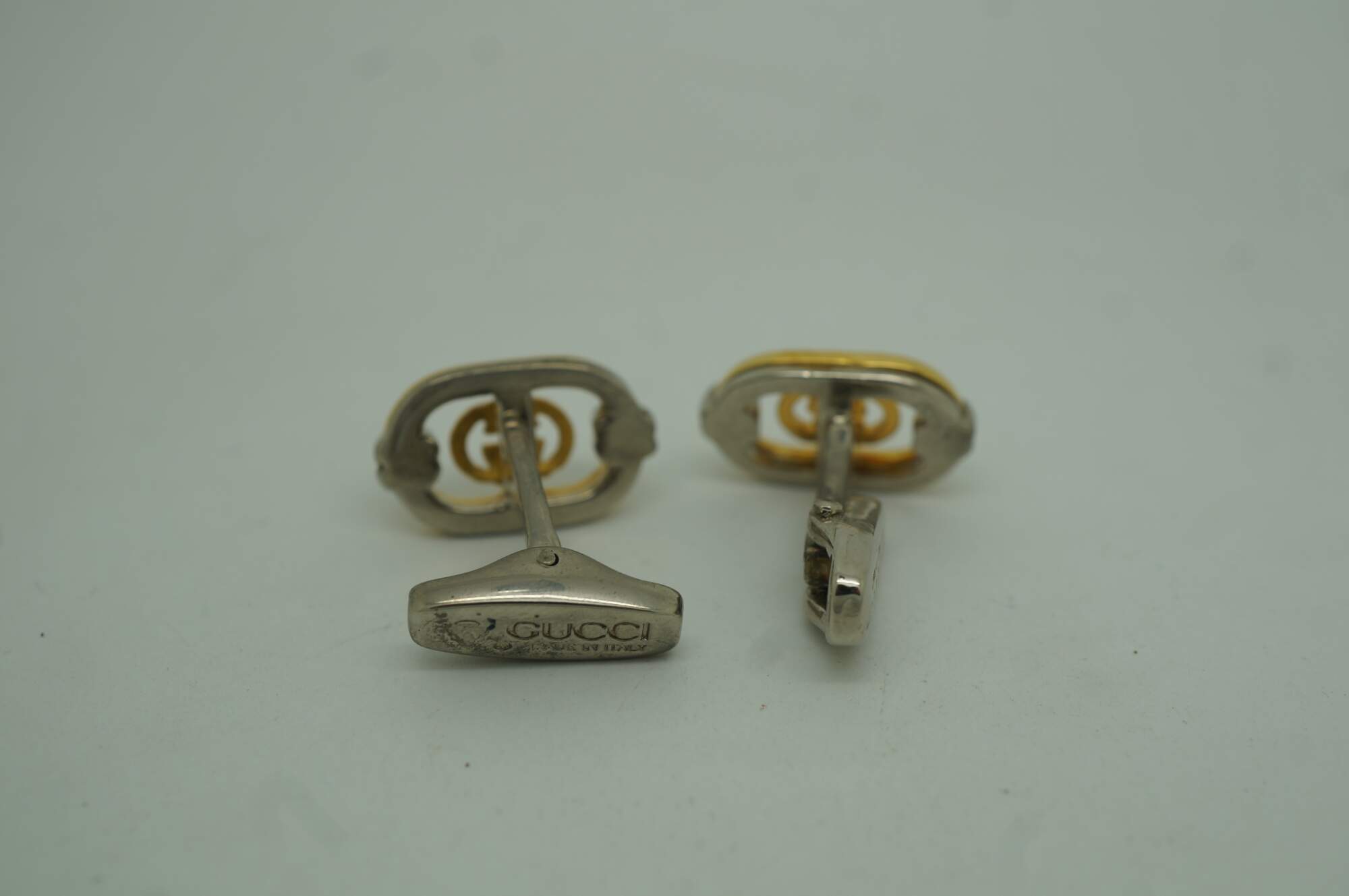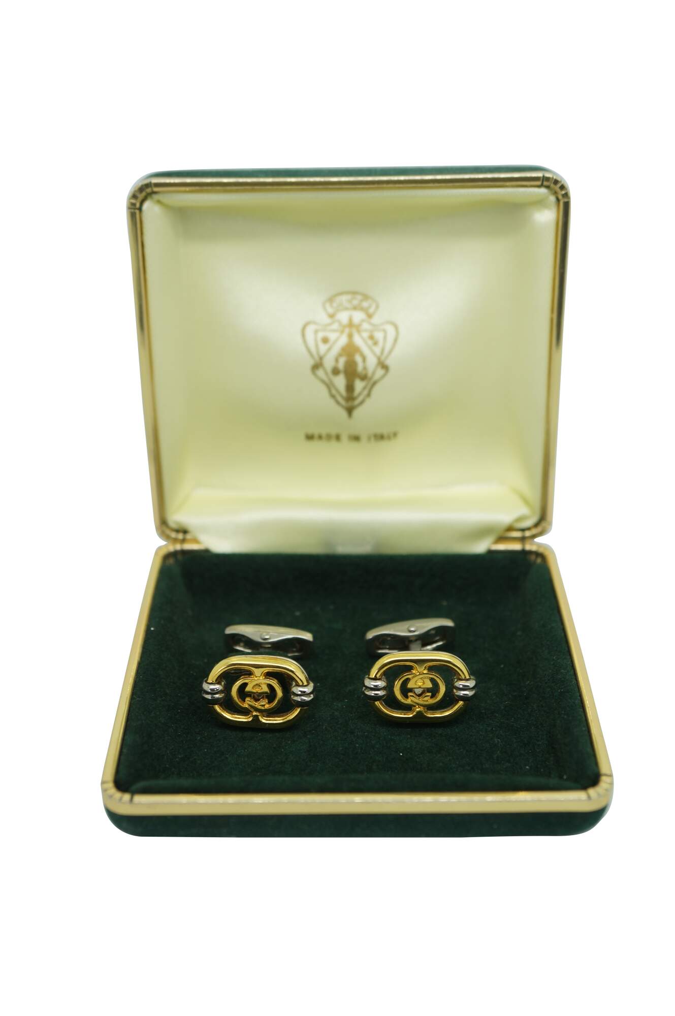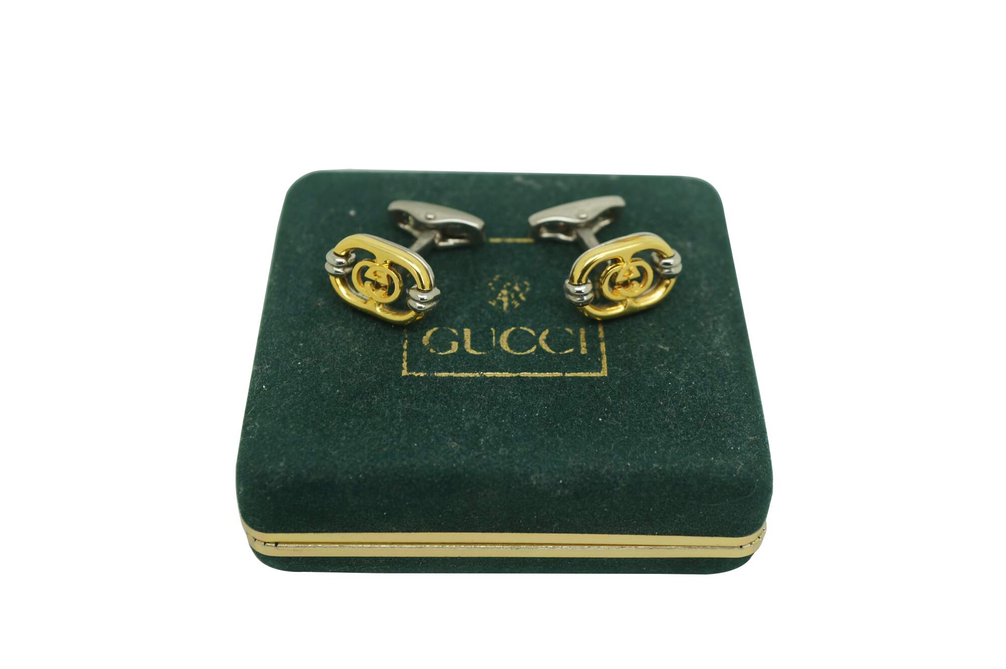 Vintage Gucci interlocking G filigree logo cufflinks, featuring a gold plated logo set on a brushed stainless steel face within a original branded green velveteen case. Made in Italy.