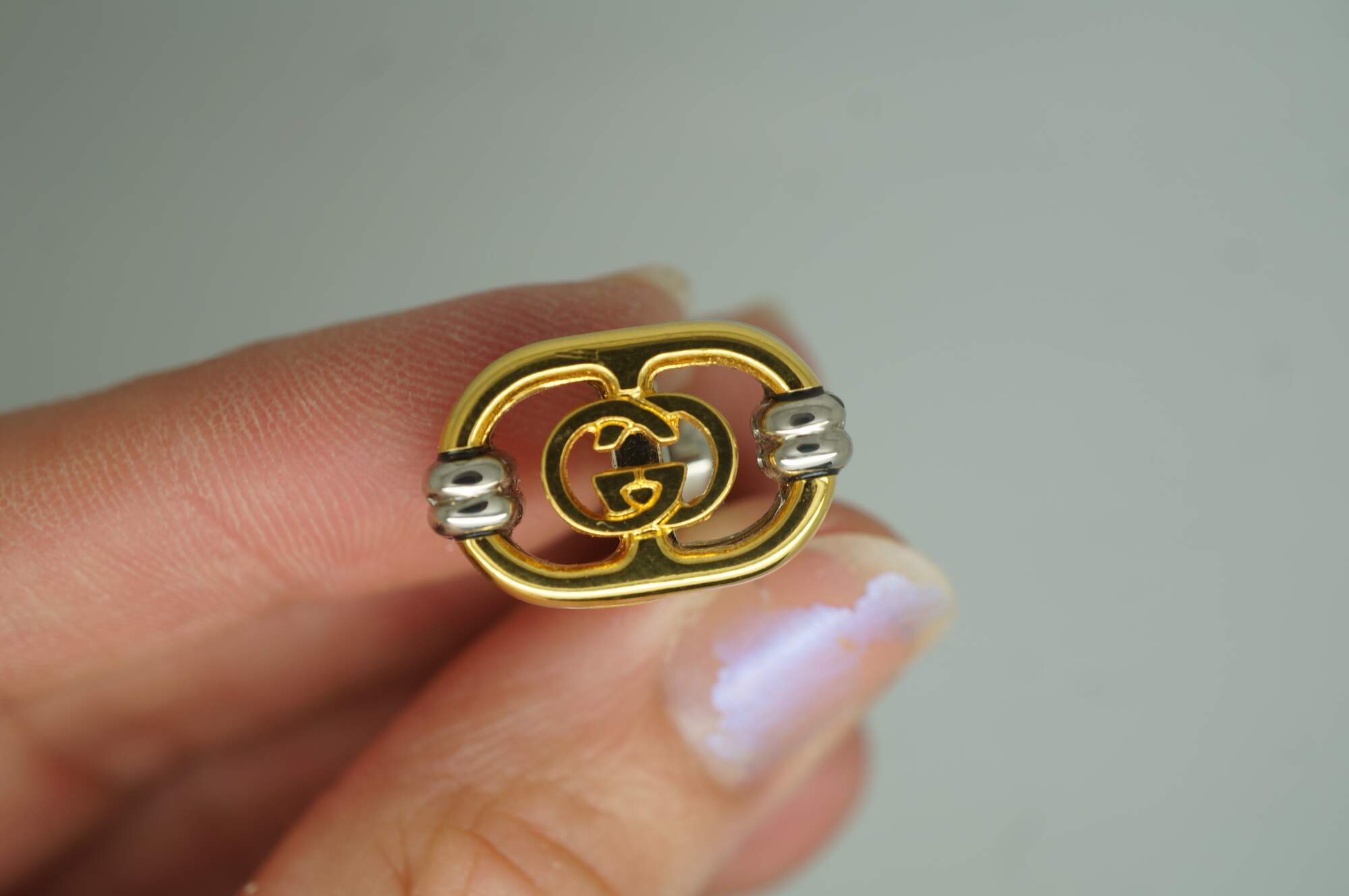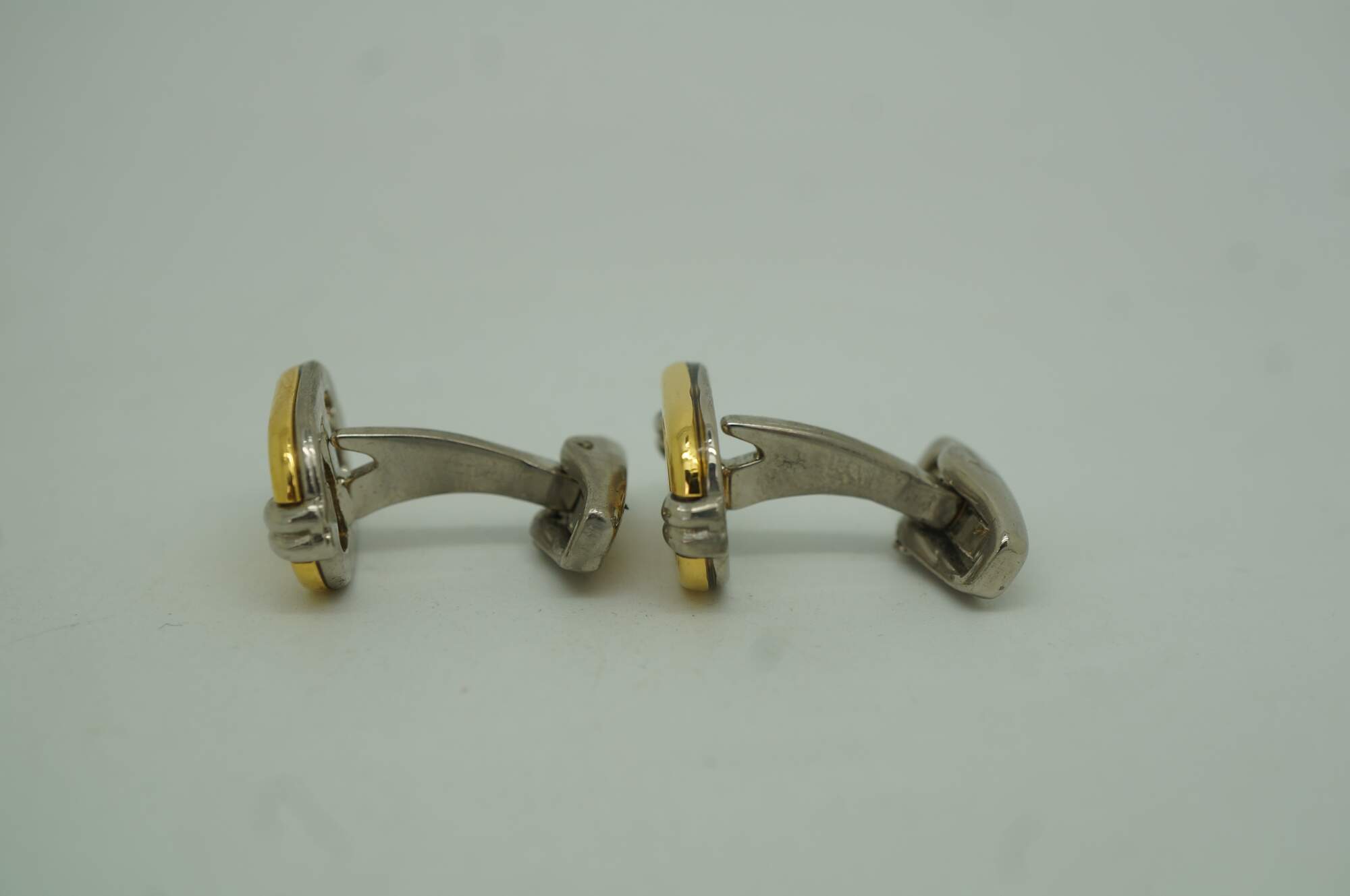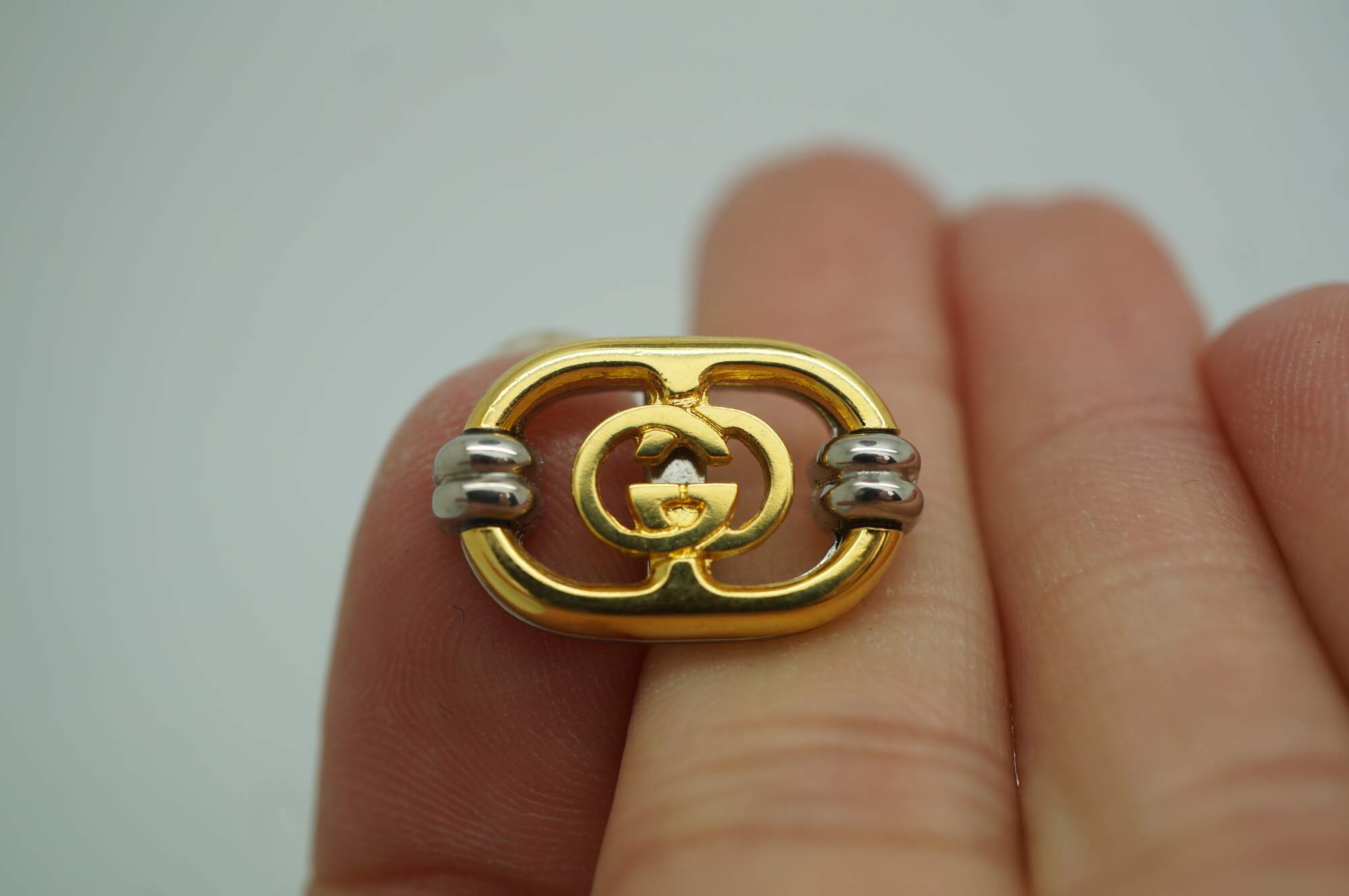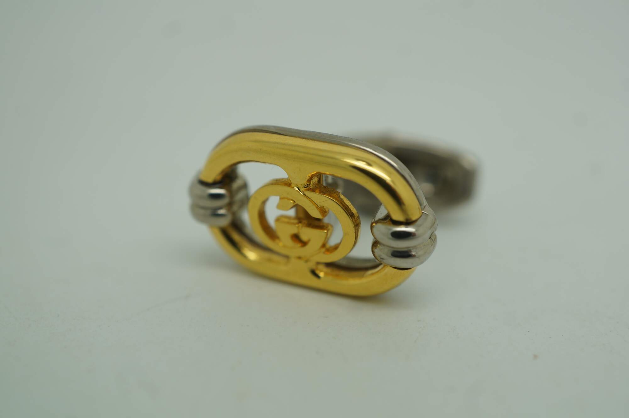 Vintage Gucci interlocking G filigree logo cufflinks, featuring a gold plated logo set on a brushed stainless steel face within a original branded green velveteen case. Made in Italy.